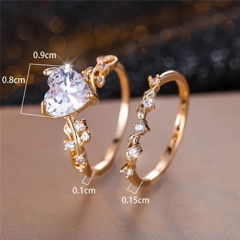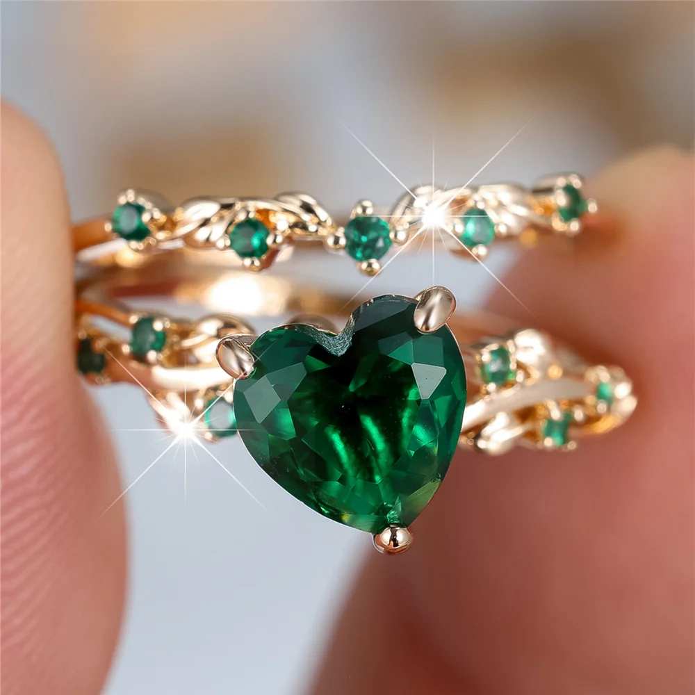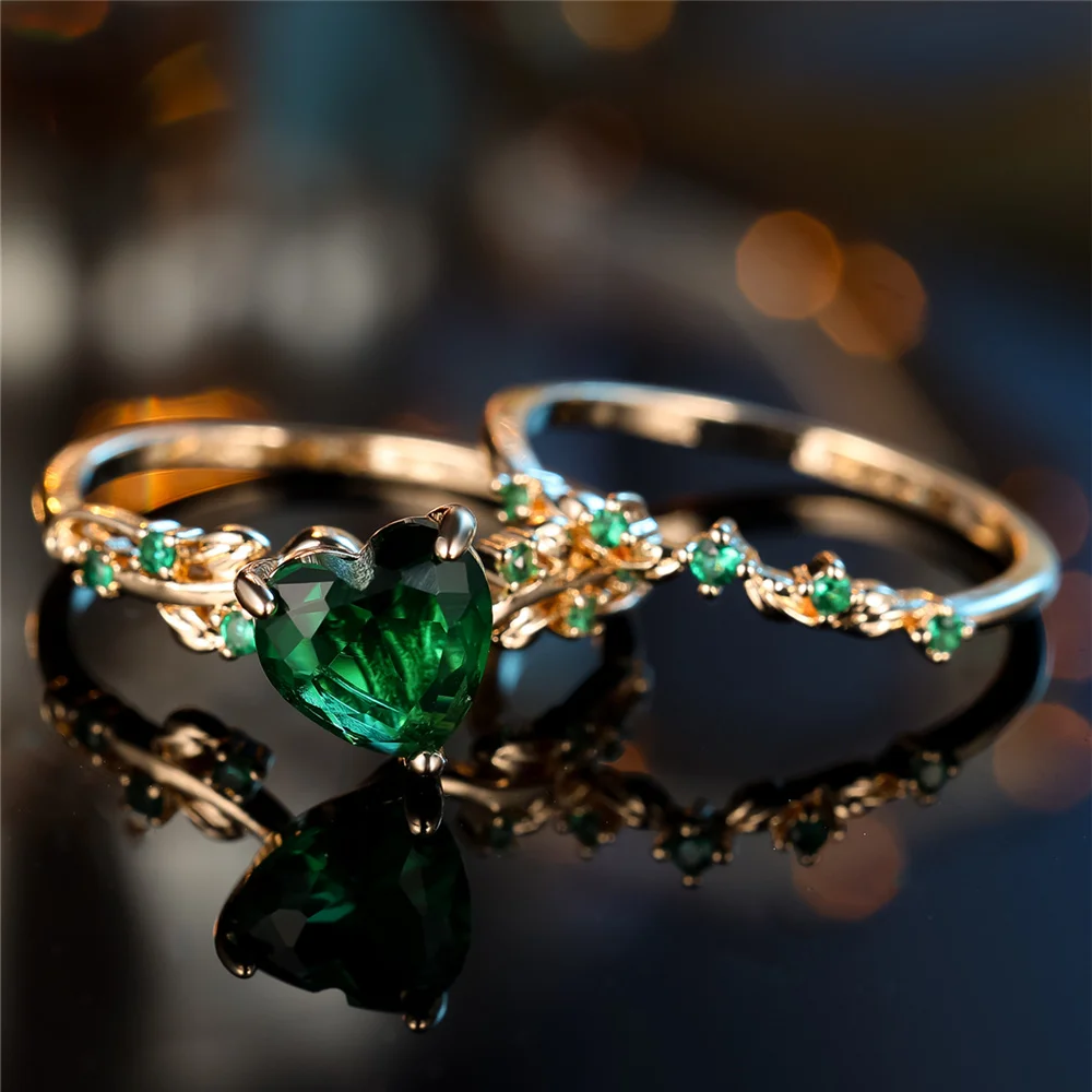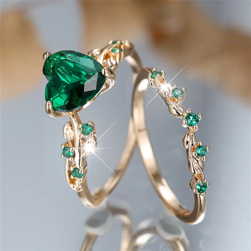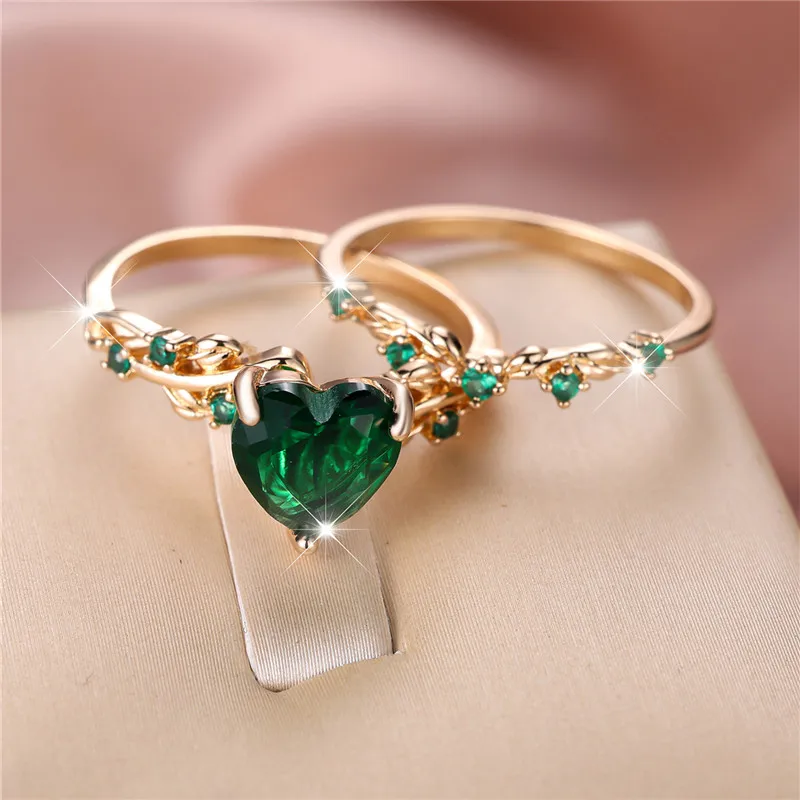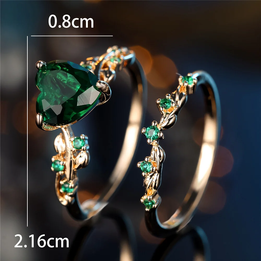 Details: Embrace timeless beauty with this Timeless Heart Love Leaves Engagement Ring Set in a luxurious gold tone. This exquisite set features a prominent heart-shaped green, red, white, pink, or black cubic zirconia gemstone set in a gold band adorned with delicate leaf-like designs and smaller cubic zirconia stones on the first ring. The second ring, a simpler and complementary gold band, is also decorated with matching leaf motifs and cubic zirconia gemstones of the same matching color. These rings can be worn individually or stacked together to create a harmonious and captivating look, symbolizing love and commitment. This set is a timeless expression of romance and sophistication, ideal for both engagement and special occasions.