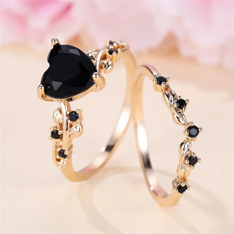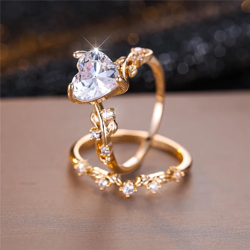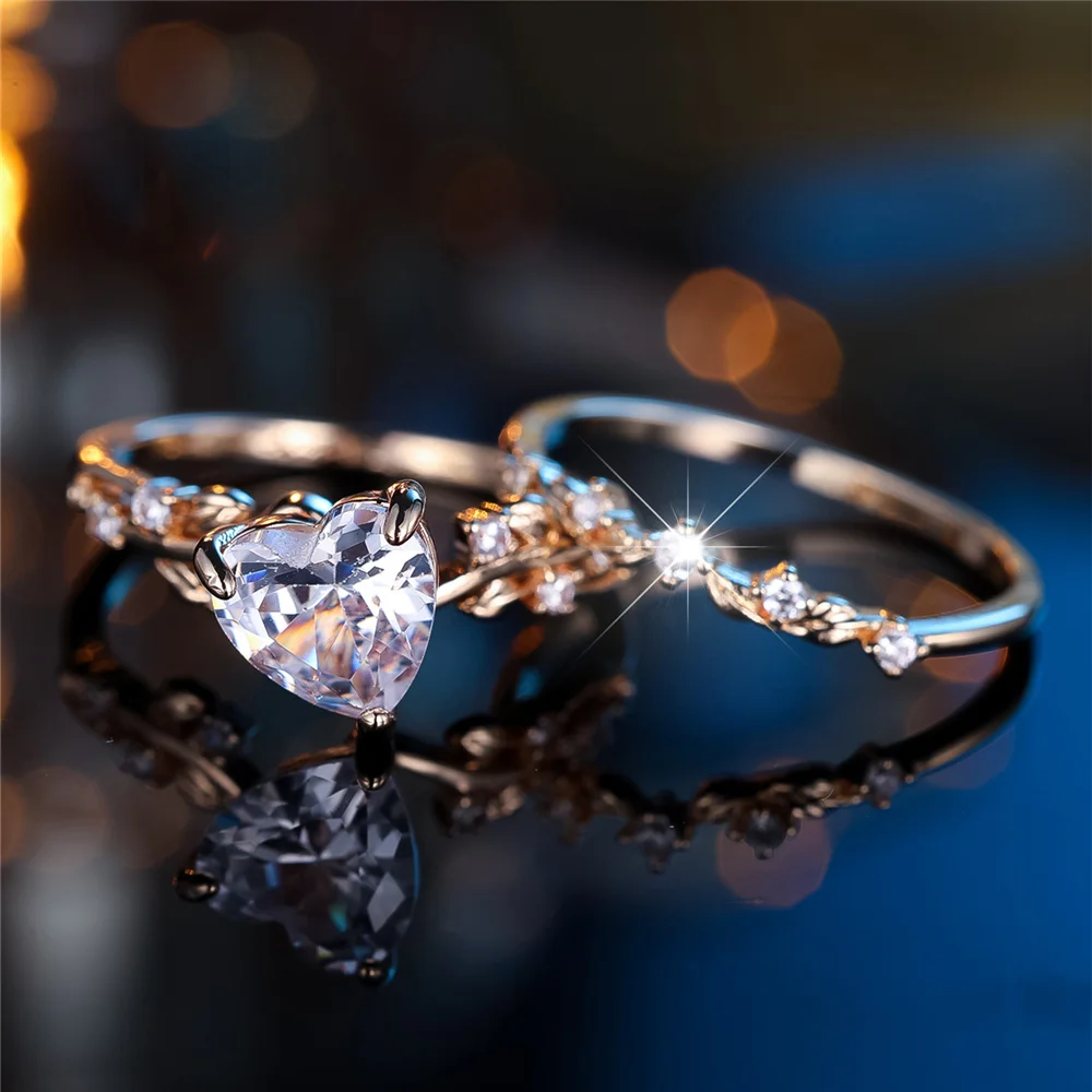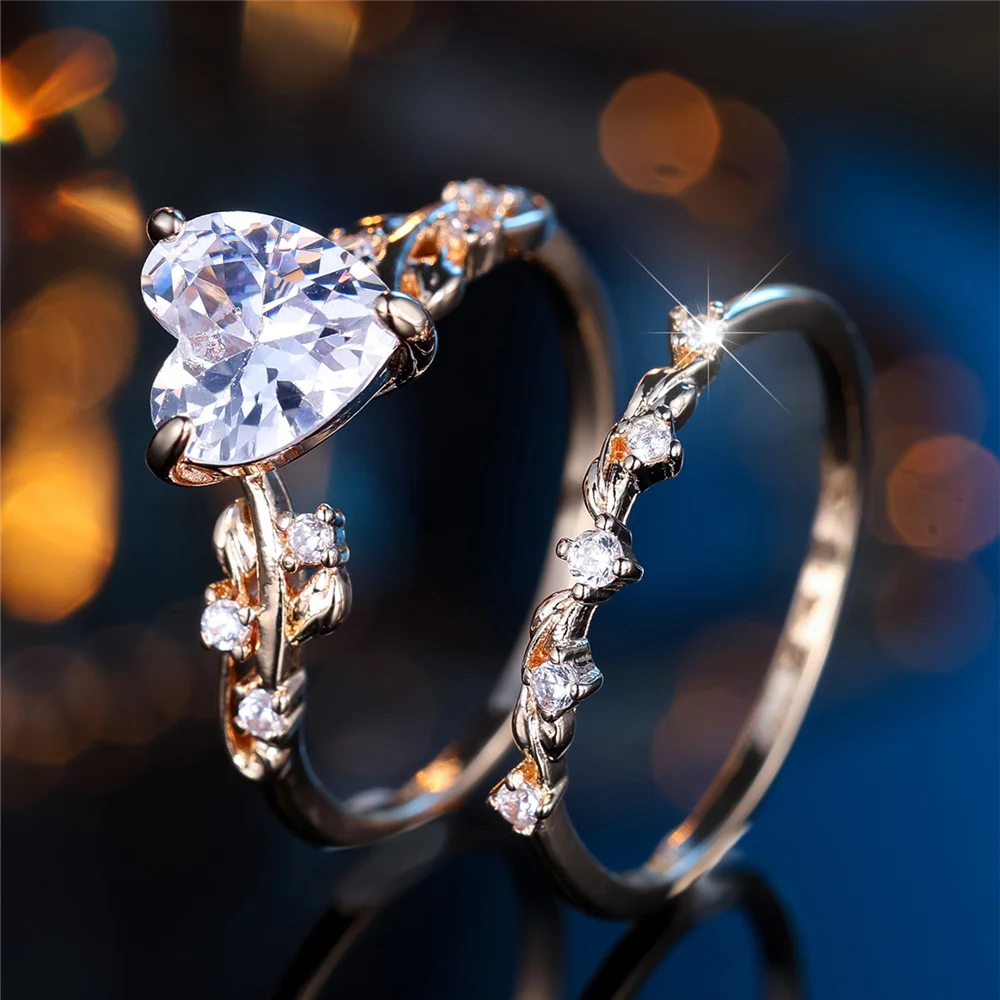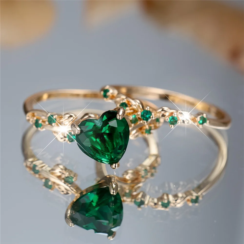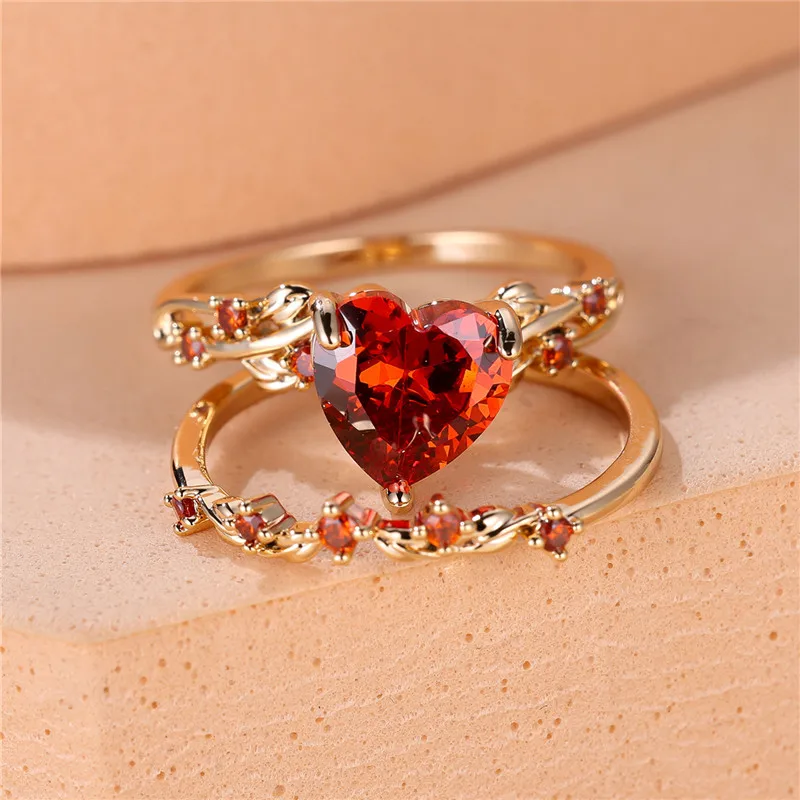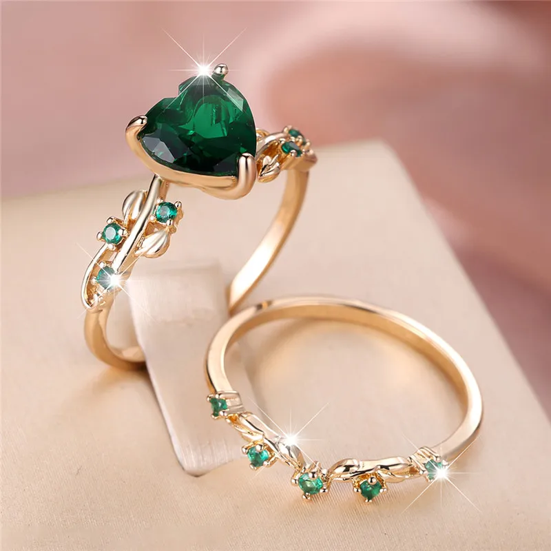 Details: Embrace timeless beauty with this Timeless Heart Love Leaves Engagement Ring Set in a luxurious gold tone. This exquisite set features a prominent heart-shaped green, red, white, pink, or black cubic zirconia gemstone set in a gold band adorned with delicate leaf-like designs and smaller cubic zirconia stones on the first ring. The second ring, a simpler and complementary gold band, is also decorated with matching leaf motifs and cubic zirconia gemstones of the same matching color. These rings can be worn individually or stacked together to create a harmonious and captivating look, symbolizing love and commitment. This set is a timeless expression of romance and sophistication, ideal for both engagement and special occasions.