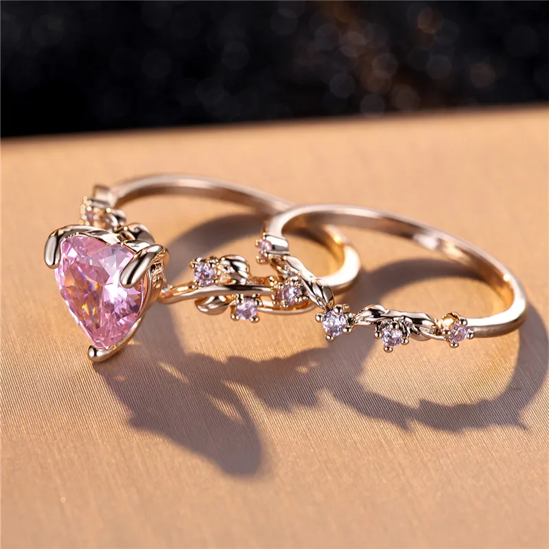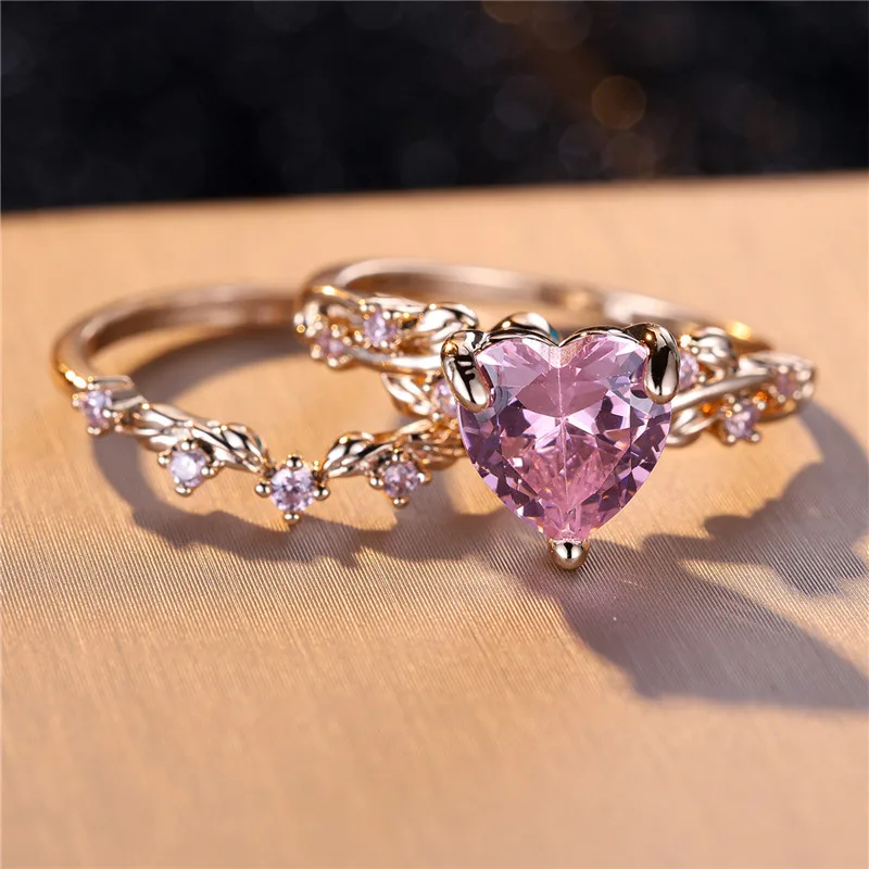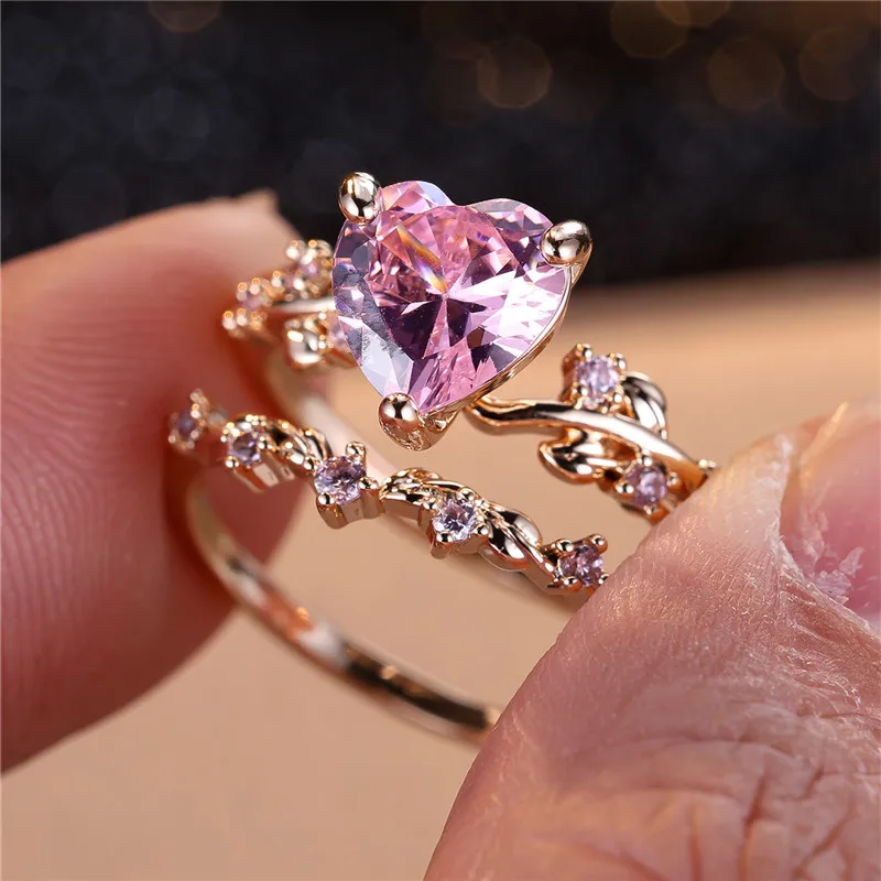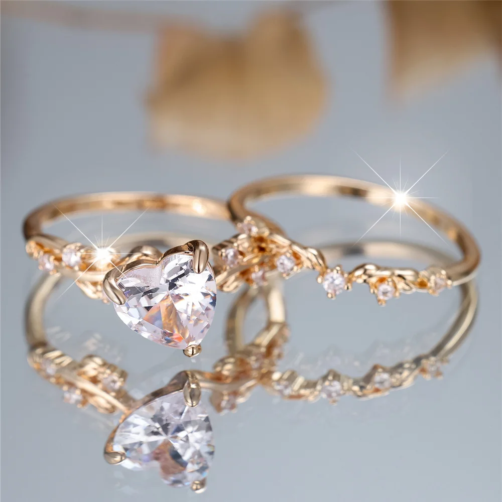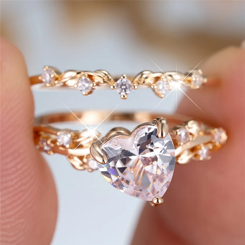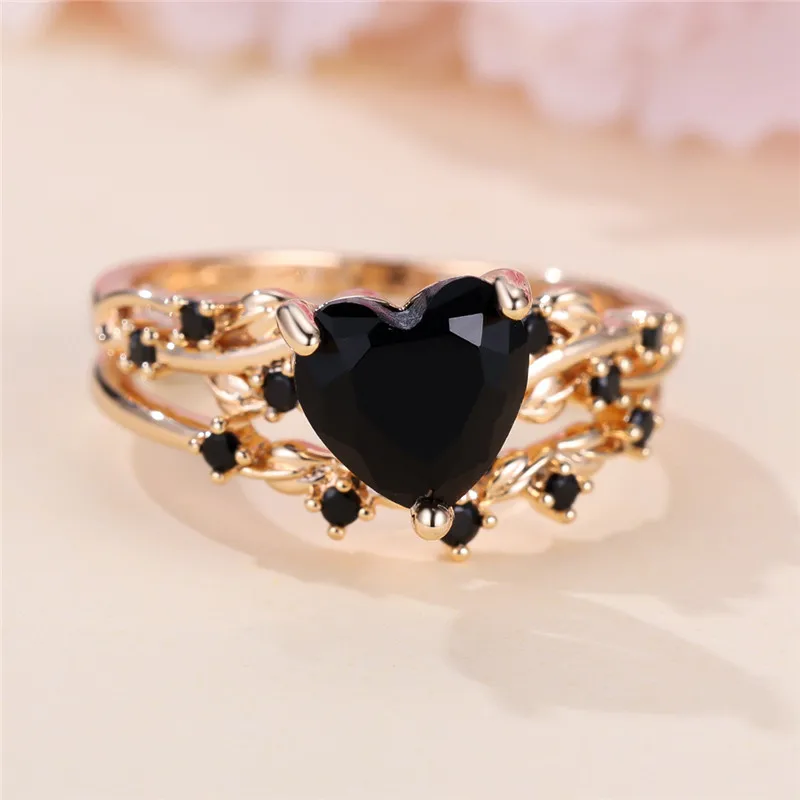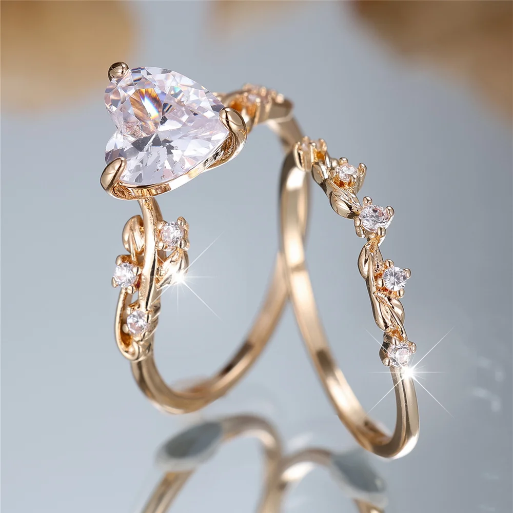 Details: Embrace timeless beauty with this Timeless Heart Love Leaves Engagement Ring Set in a luxurious gold tone. This exquisite set features a prominent heart-shaped green, red, white, pink, or black cubic zirconia gemstone set in a gold band adorned with delicate leaf-like designs and smaller cubic zirconia stones on the first ring. The second ring, a simpler and complementary gold band, is also decorated with matching leaf motifs and cubic zirconia gemstones of the same matching color. These rings can be worn individually or stacked together to create a harmonious and captivating look, symbolizing love and commitment. This set is a timeless expression of romance and sophistication, ideal for both engagement and special occasions.