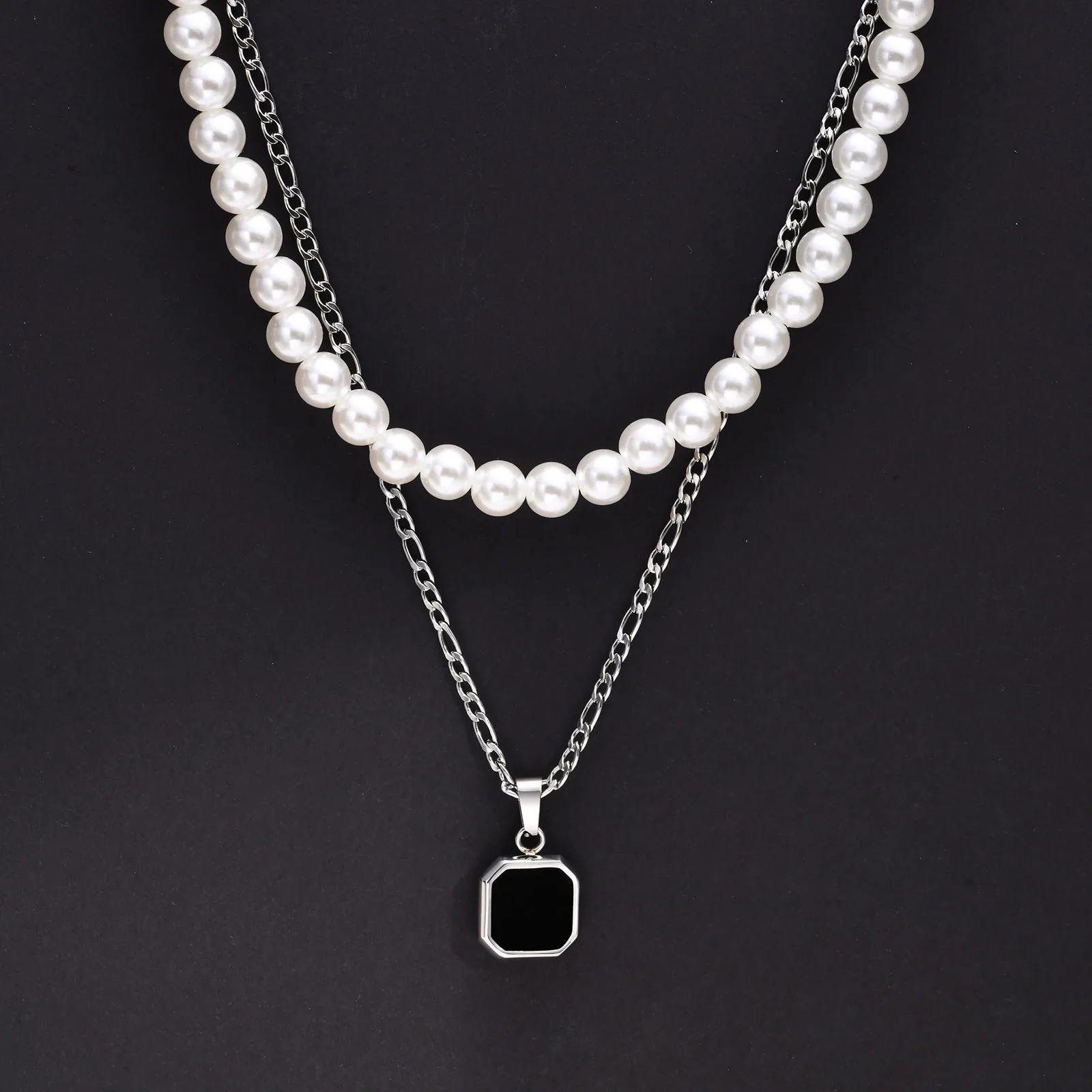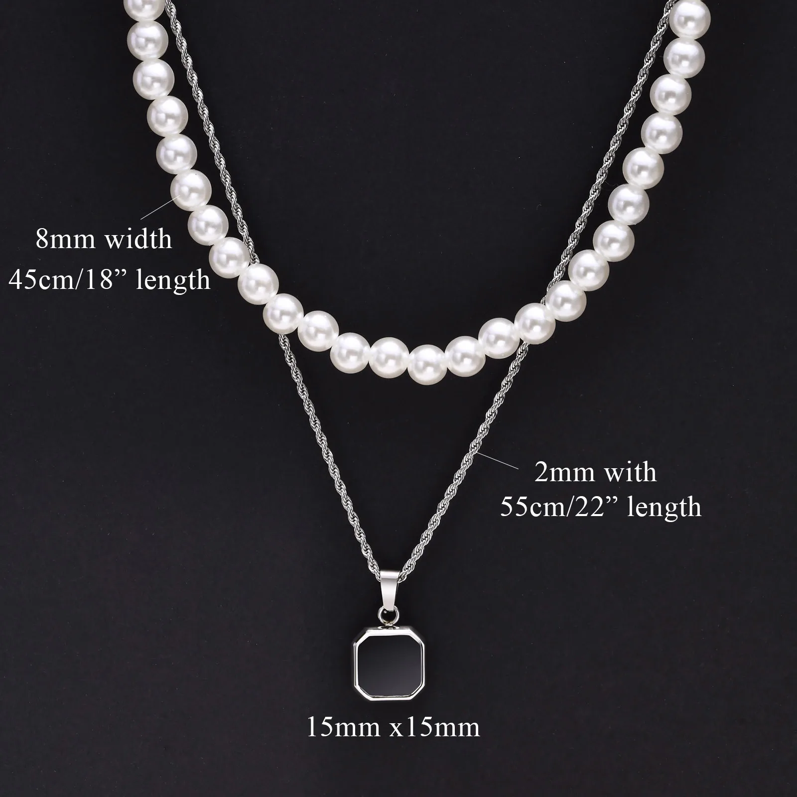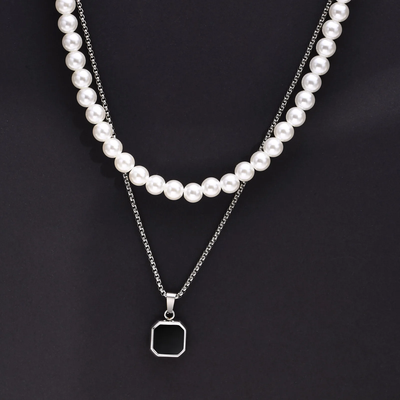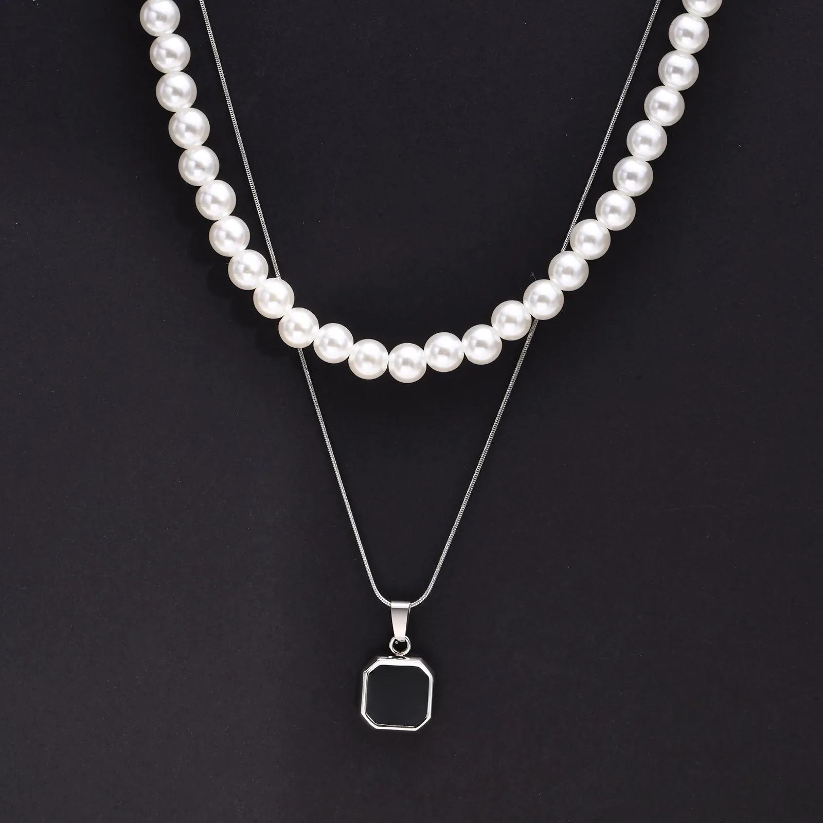 2pcs/Set Square Pendant Necklace & Faux Pearl Necklace