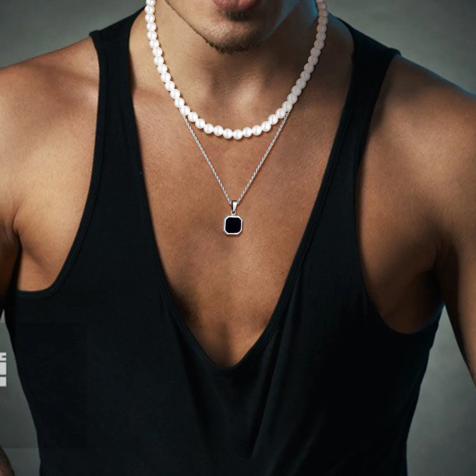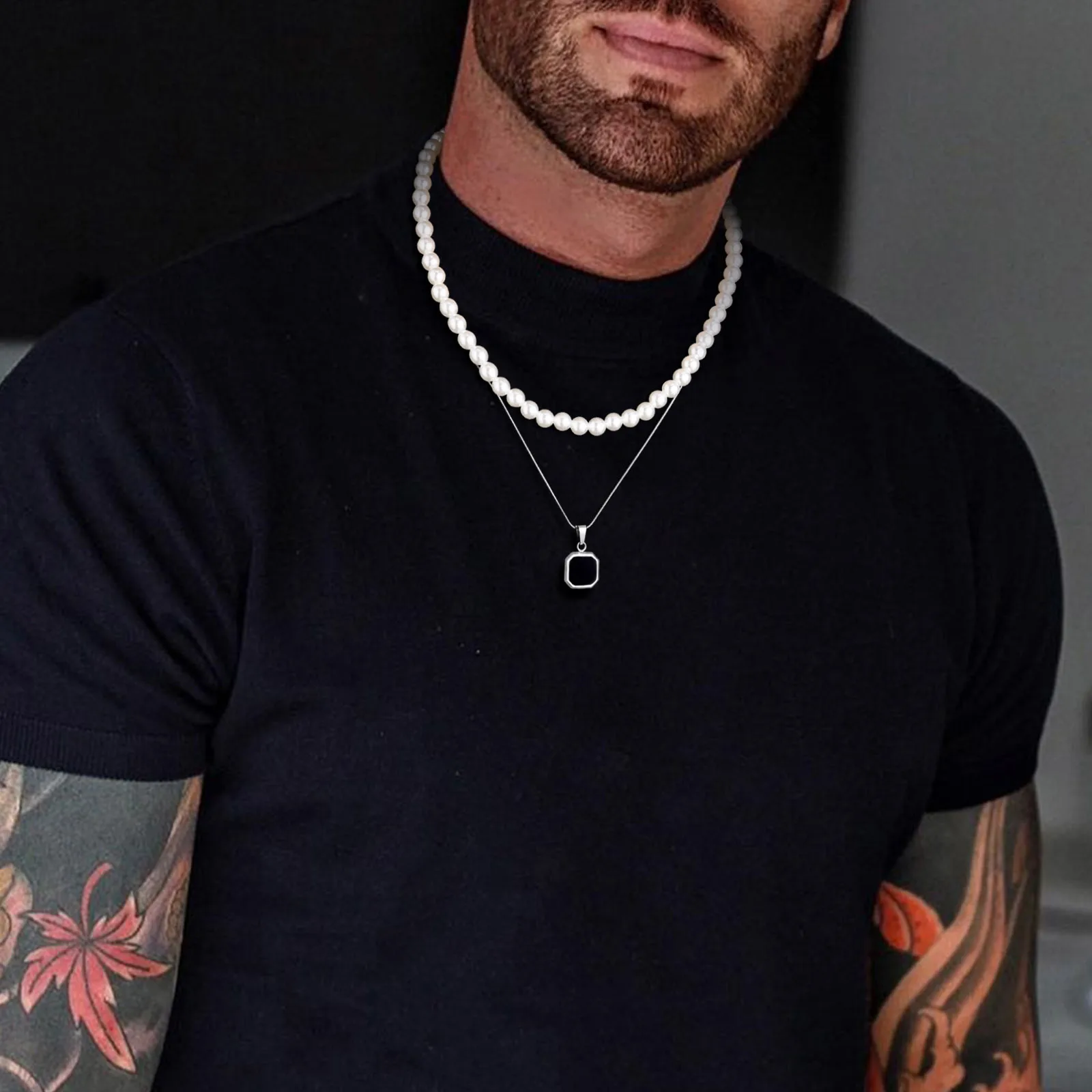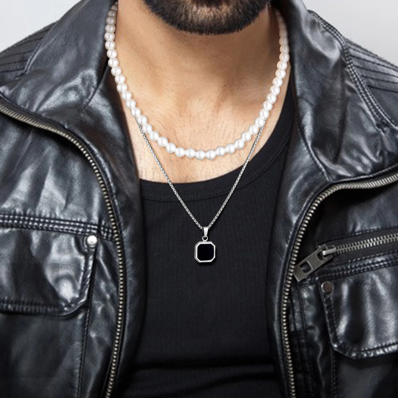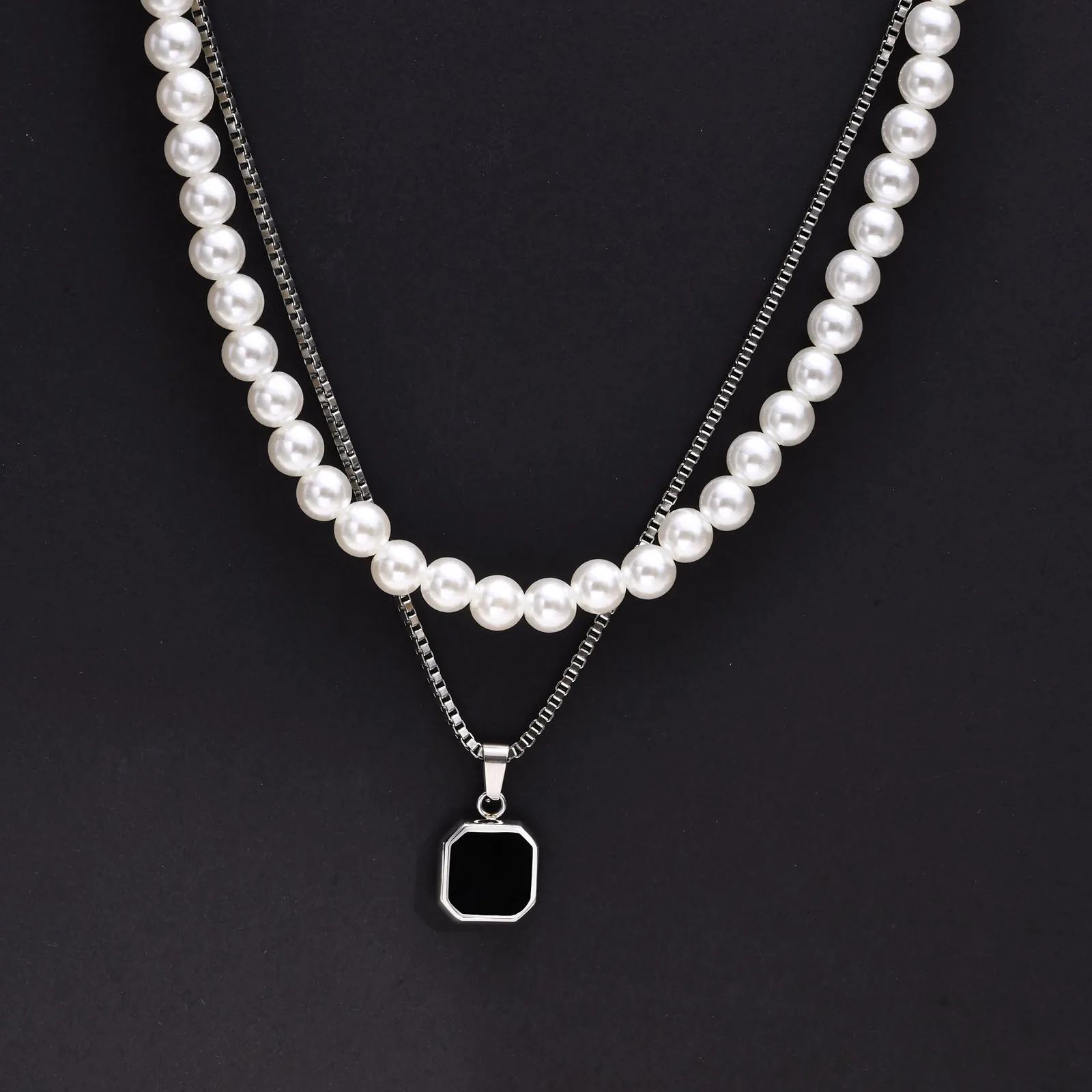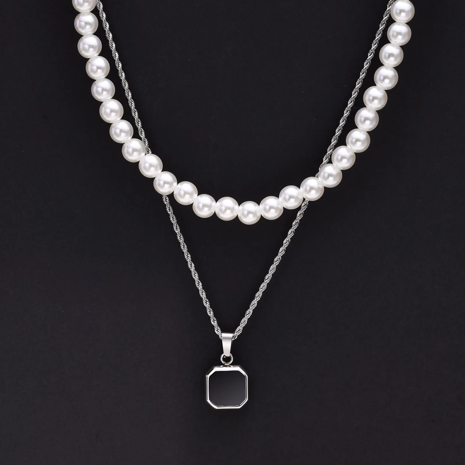 2pcs/Set Square Pendant Necklace & Faux Pearl Necklace