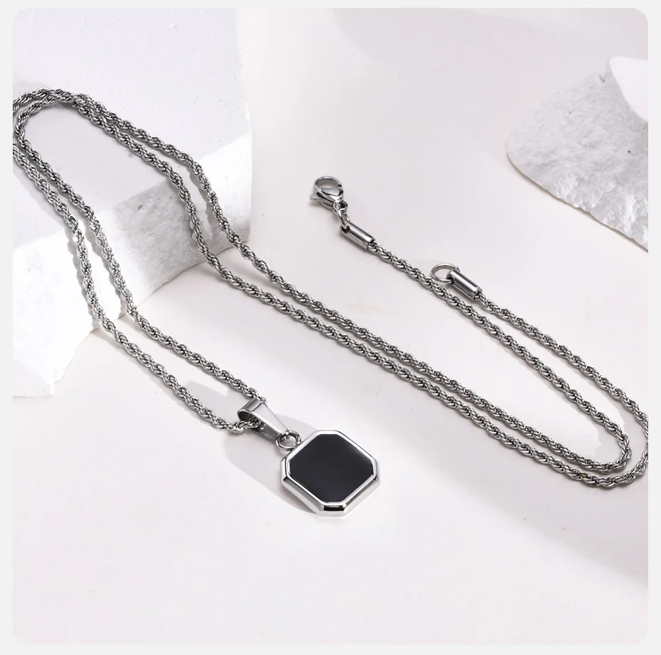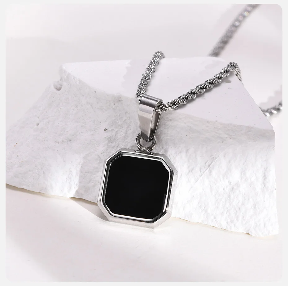 Details: Square Pendant Necklace: This necklace set combines modern minimalism with geometric elegance. The square pendant, that symbolizes balance, stability, and chic style, hangs gracefully from a sleek box chain necklace. The clean lines and polished finish make it a versatile accessory for both casual outings and special occasions. Whether paired with a crisp white shirt or a black t-shirt, this necklace exudes contemporary sophistication.