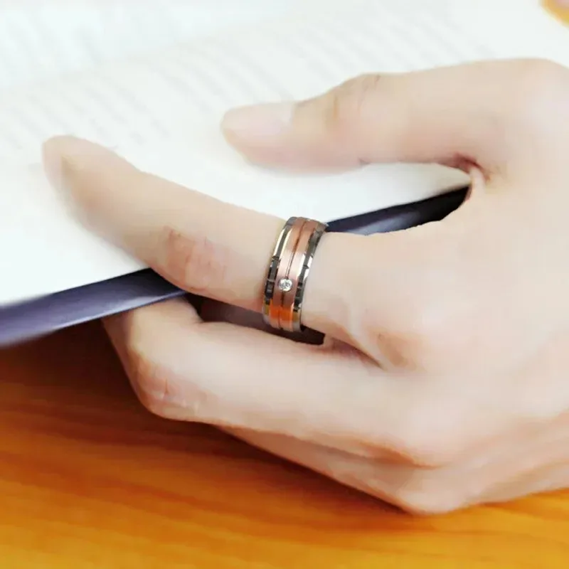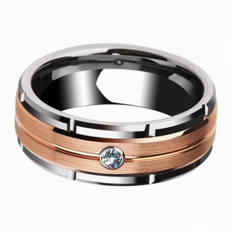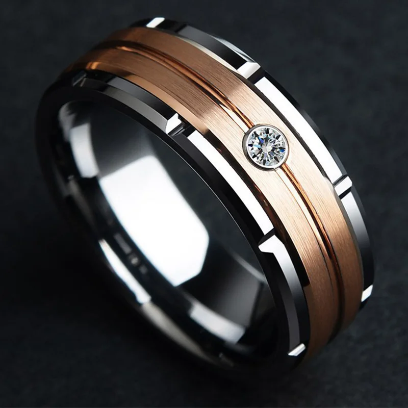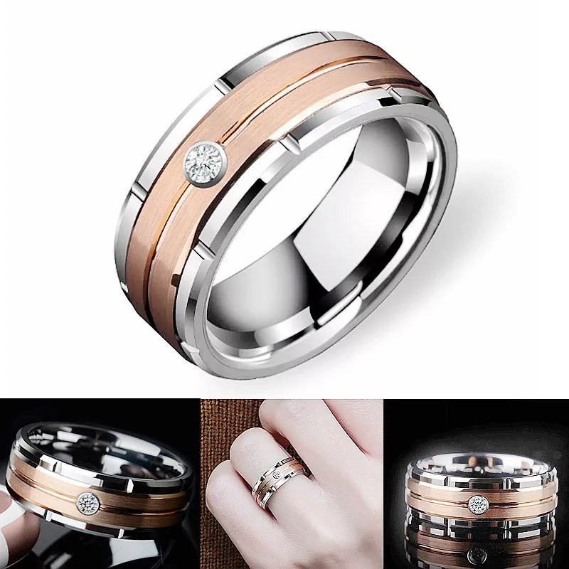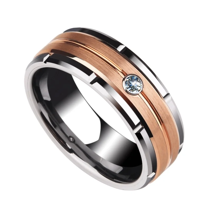 Details: Embrace timeless beauty with this 8mm Cubic Zirconia Stainless Steel Wedding Engagement Band in a striking rose gold tone. This sophisticated ring features a sleek 8mm-wide stainless steel band with a striking combination of polished stainless steel and two rolls of warm rose gold tone center. The center of the ring is adorned with a single, sparkling cubic zirconia gemstone, adding a touch of brilliance and luxury. Perfect for the discerning gentlemen, this ring is a timeless symbol of love and commitment, ideal for any wedding or engagement ceremony.