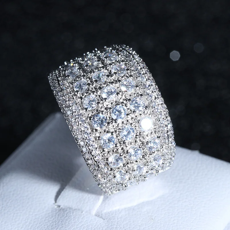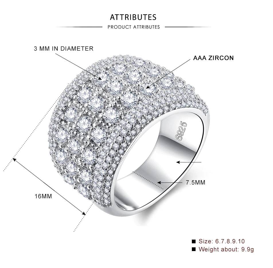 Details: This ring is a magnificent piece of wedding or engagement ring that highlights the brilliance of cubic zirconia. The ring is adorned with 3 rolls of 3 mm or 0.12 inches in diameter size AAA rating Cubic Zirconia gemstones, and surrounded on each side with 3 rolls of smaller Cubic Zirconia gemstones, features a plethora of shining gemstones that embellish the upper half of the band, creating a stunning effect of brilliance and opulence. The 925 sterling silver band adds a touch of refinement and elegance. Create the fondest memory with this ring on your most important day.