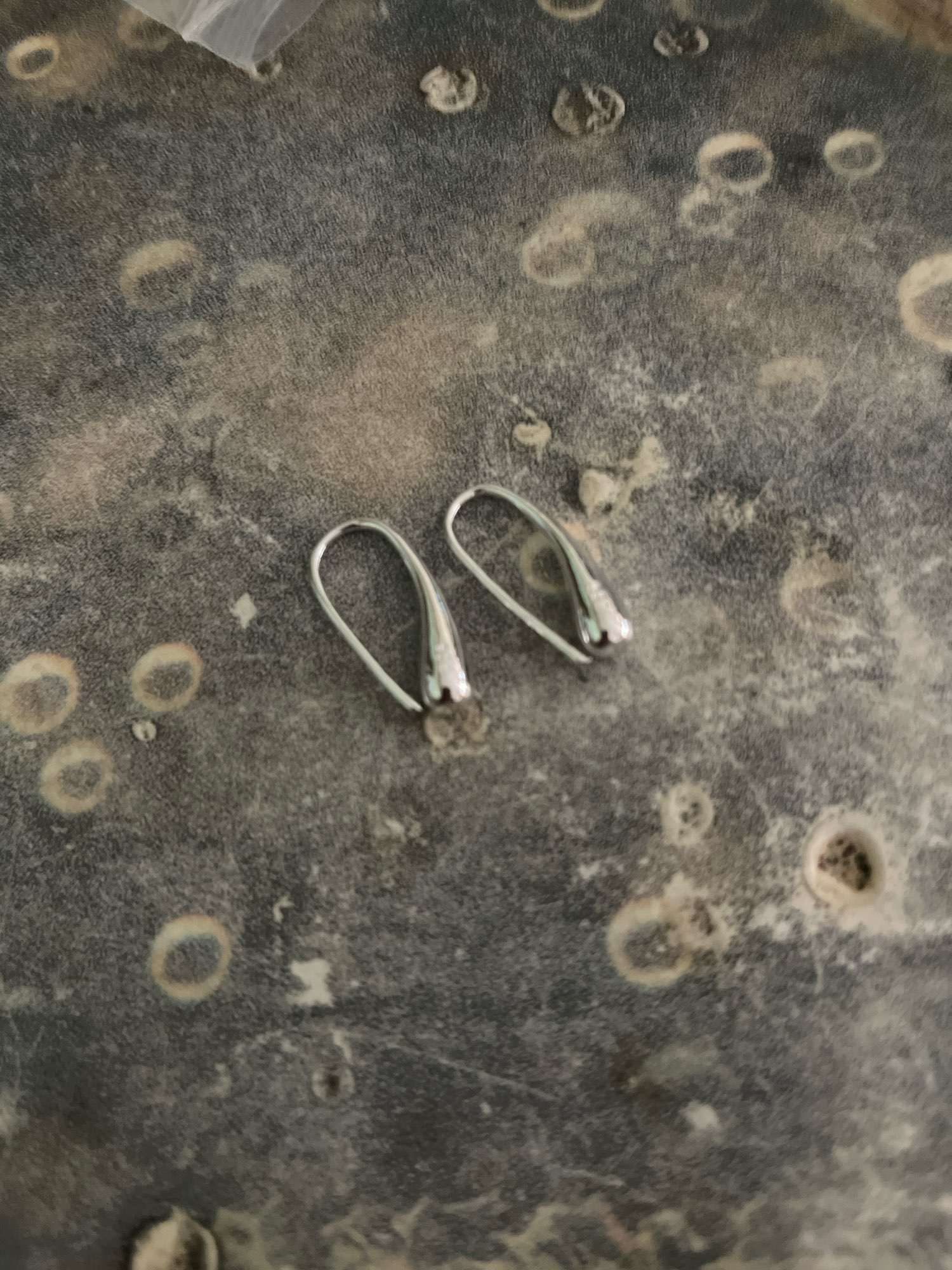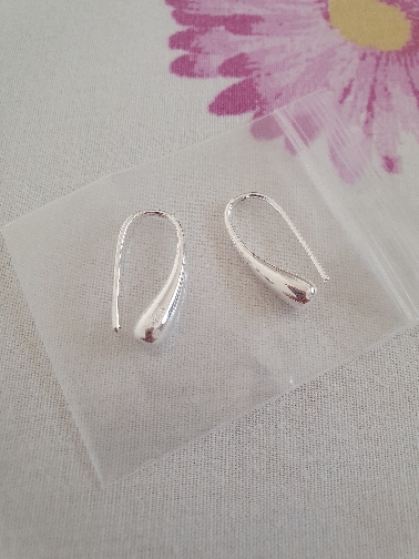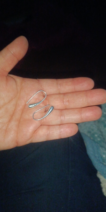 Beautiful silver-colored earrings in the shape of a water drop. I honestly thought they would be bigger.