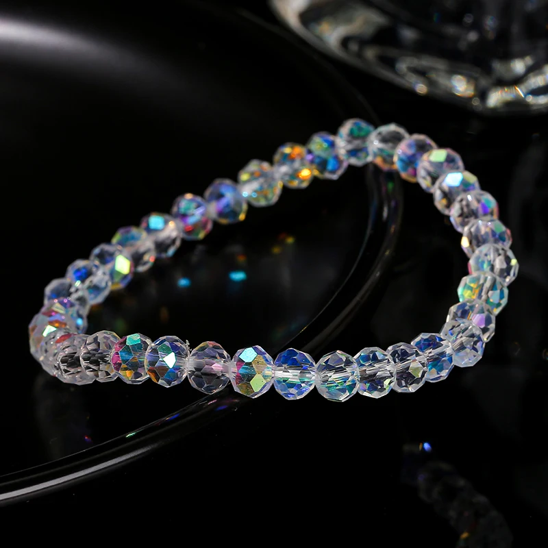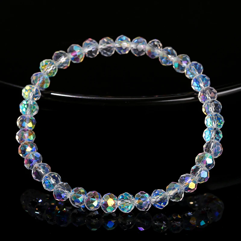 Details: This enchanting bracelet weaves together the brilliance of Austria crystal beads exhibiting exceptional clarity and sparkle with the comfort of an elastic rope. Each bead, like a miniature kaleidoscope, captures and refracts light, creating a mesmerizing play of colors. The multi-faceted surfaces shimmer with iridescence, ranging from vivid blues and greens to soft pinks and purples. Whether worn solo or stacked, this bracelet adds a touch of elegance to any ensemble. Its flexible fit ensures a comfortable fit for various wrist sizes ensures both style and ease, making it a delightful addition to your jewelry collection. Pair this bracelet with a flowing summer dress, a crisp white shirt, or even your favorite jeans. Let its radiant hues elevate your style and brighten your day.
