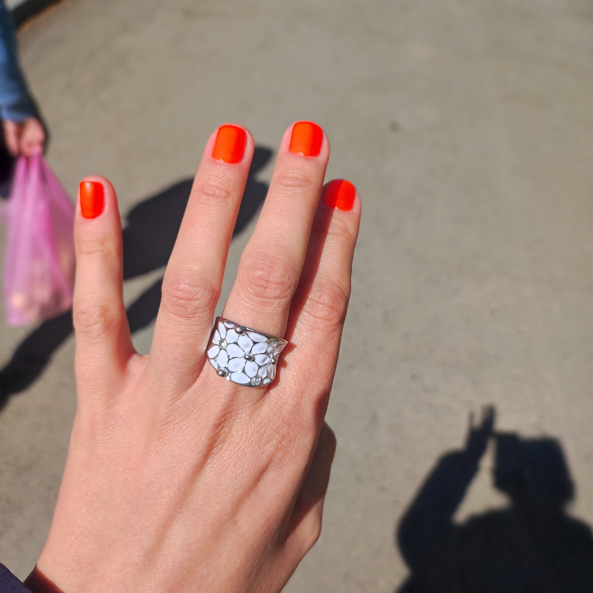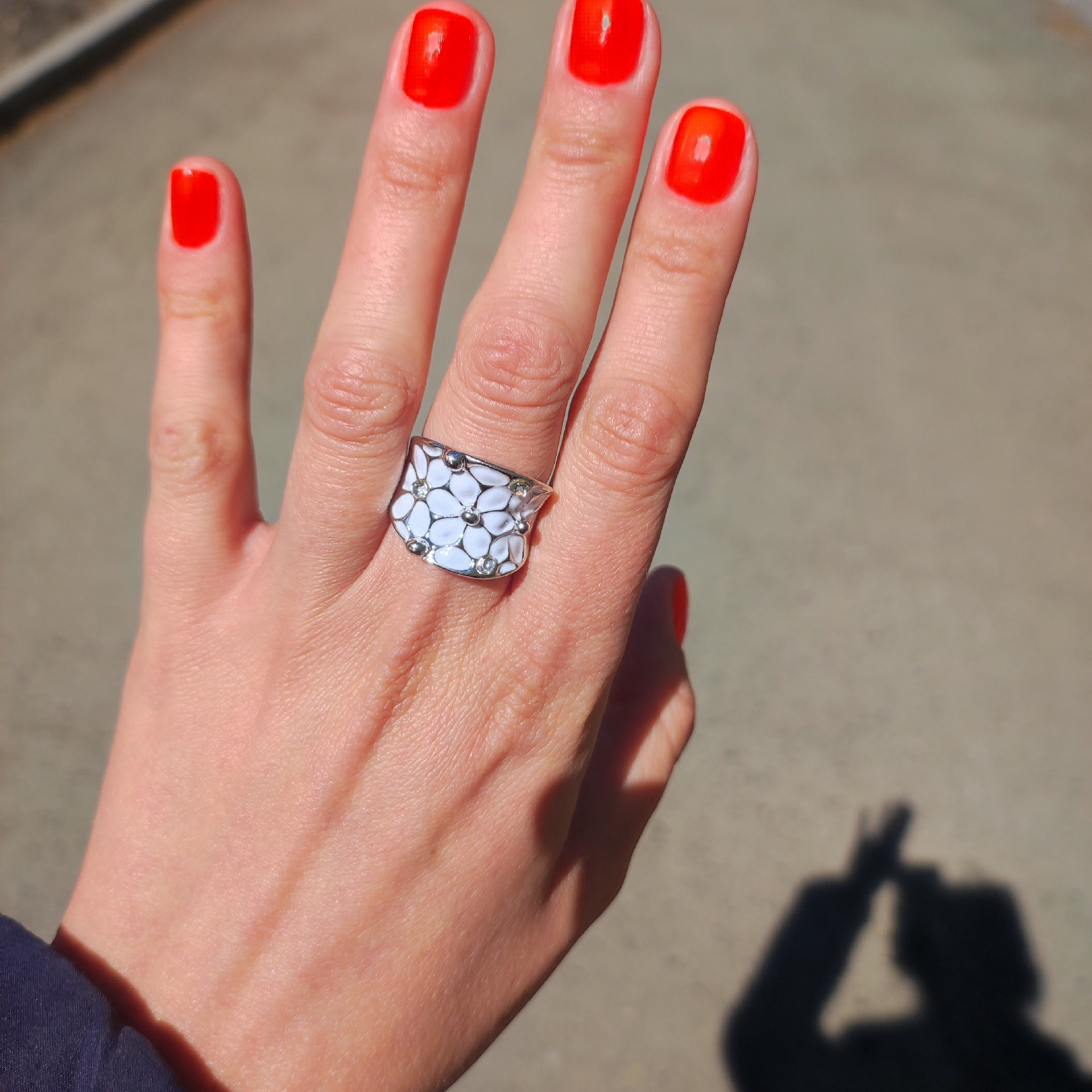 Delivery 20 days. The ring is cute, with enamel and stone, without damage. All as described. The store Thank you.