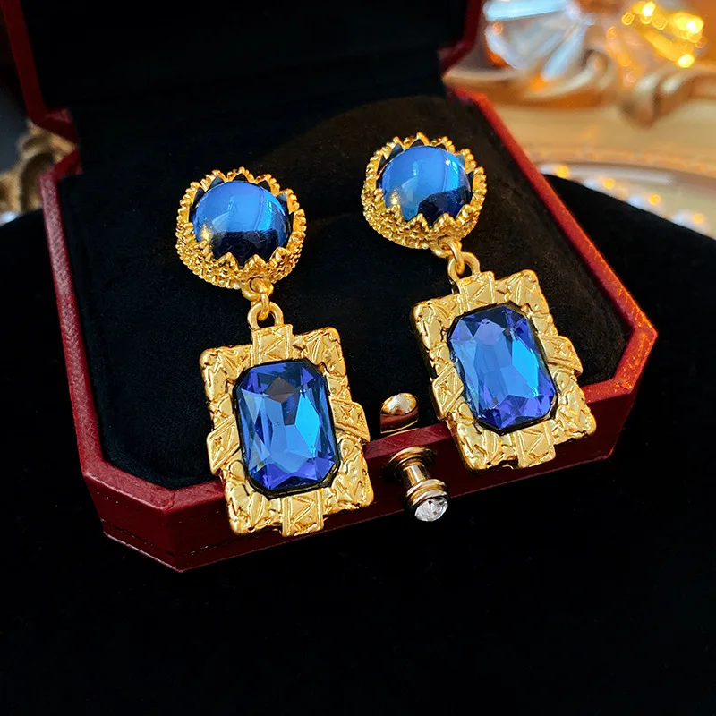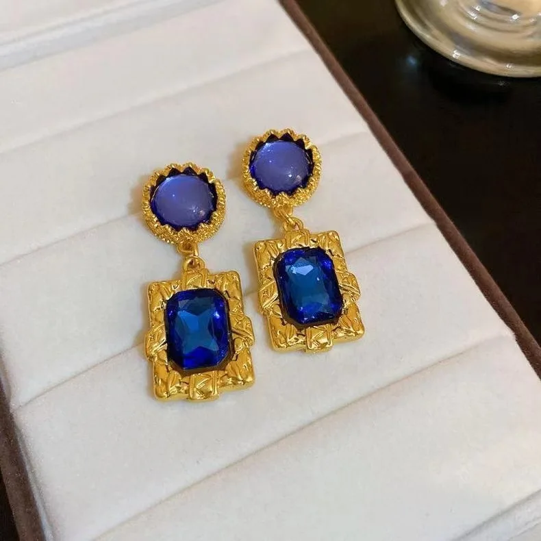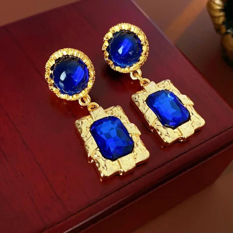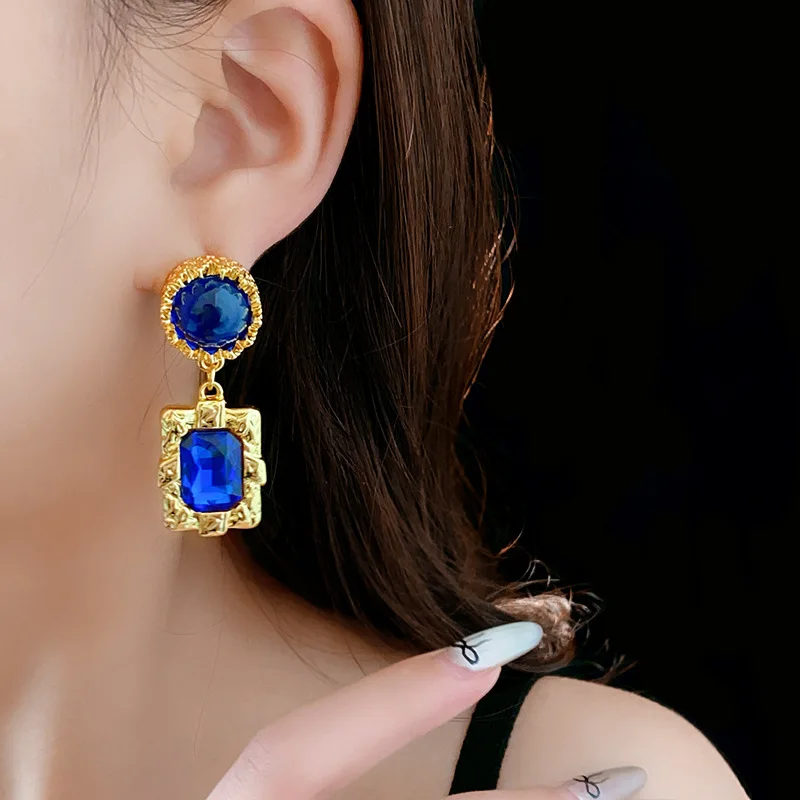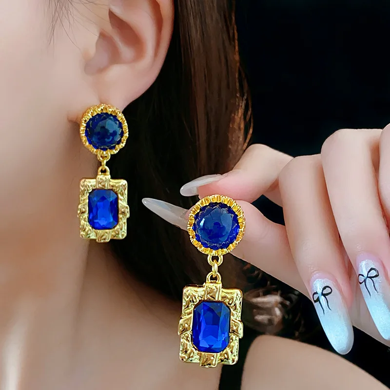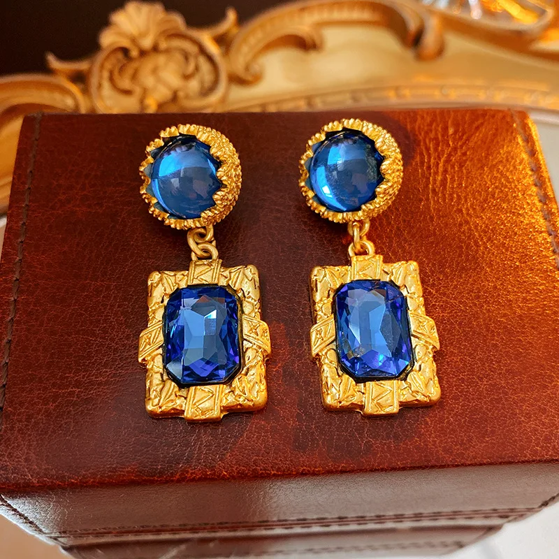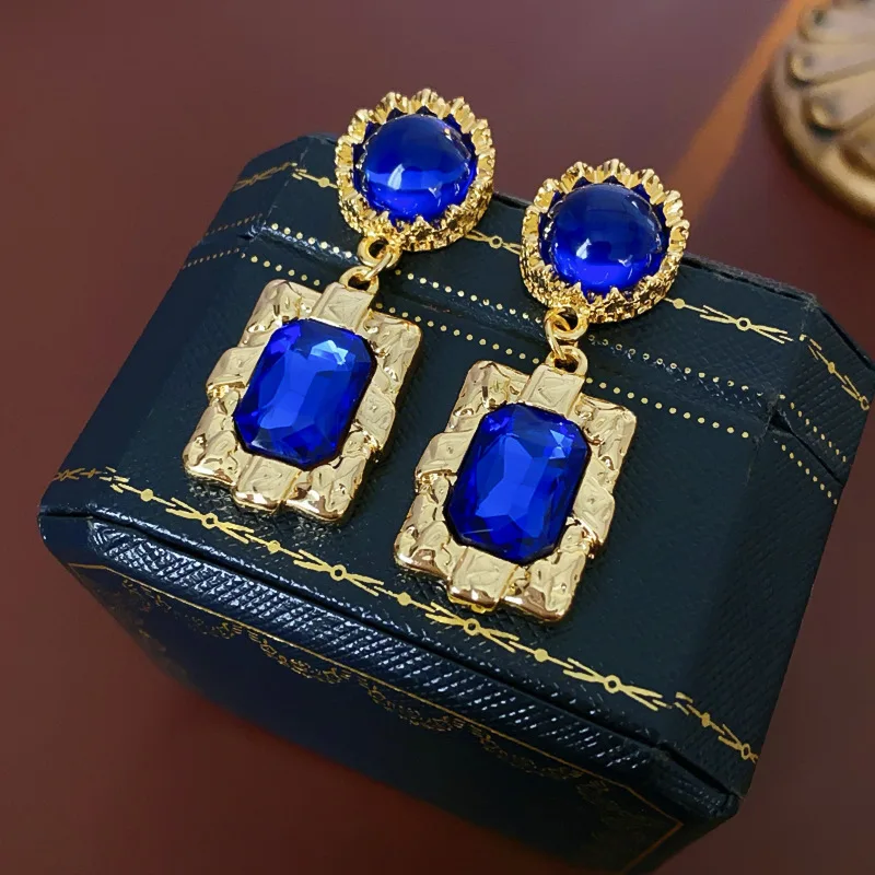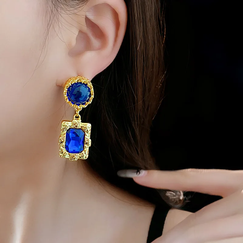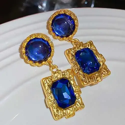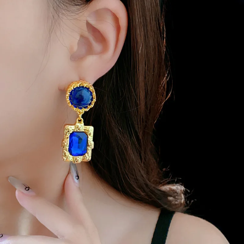 Details: Where vintage meets modern glam — these Blue Rhinestone Ornate Hyperbole Pendant Drop Earrings are a statement of style. Designed to dazzle, these stunning double-rhinestone design earrings feature gleaming round and rectangular blue rhinestones encased in intricate gold-tone frames. Highlighted by textured gold-tone detailing, these earrings command attention and elevate any outfit to dazzling heights. Their vintage-inspired design adds a regal touch to your look, making them perfect for elegant evenings or unforgettable celebrations.