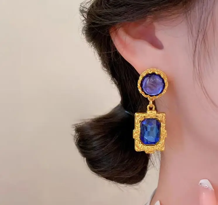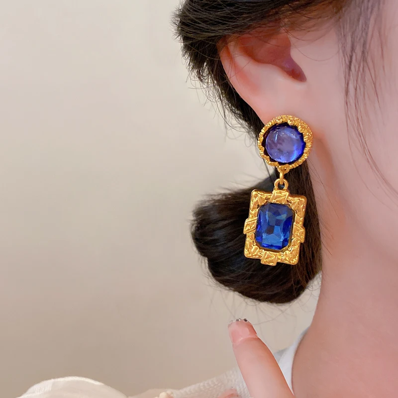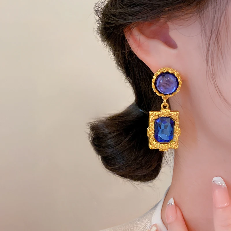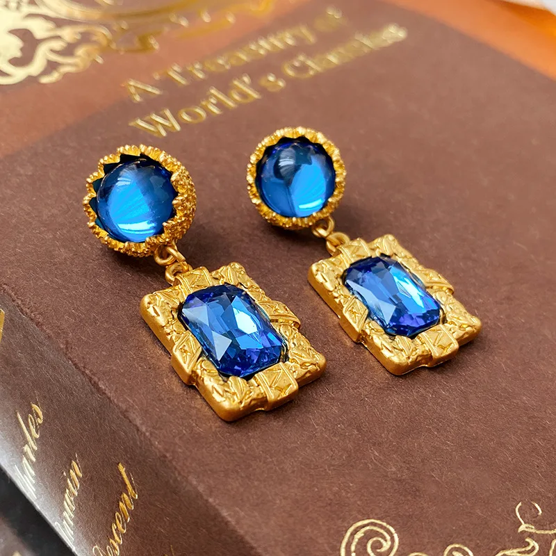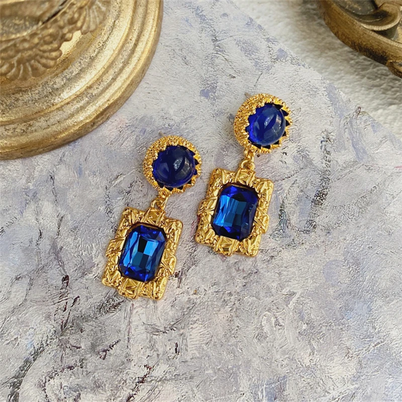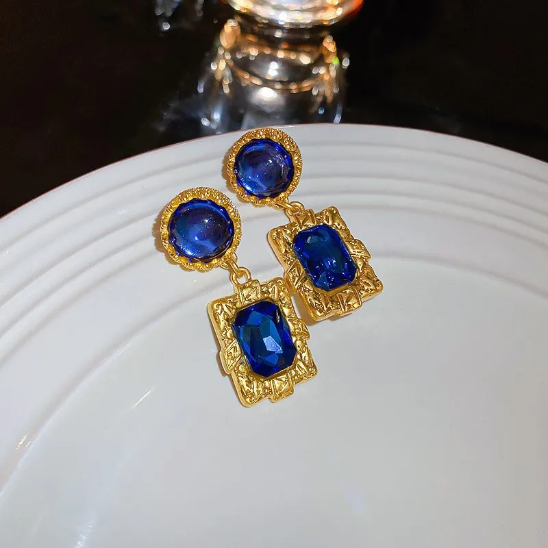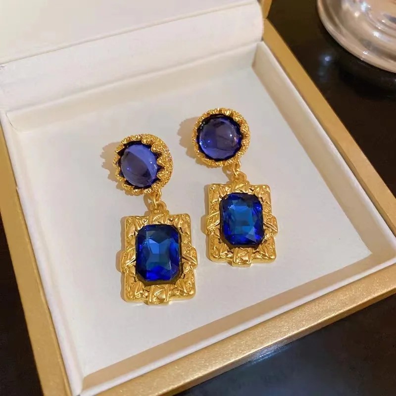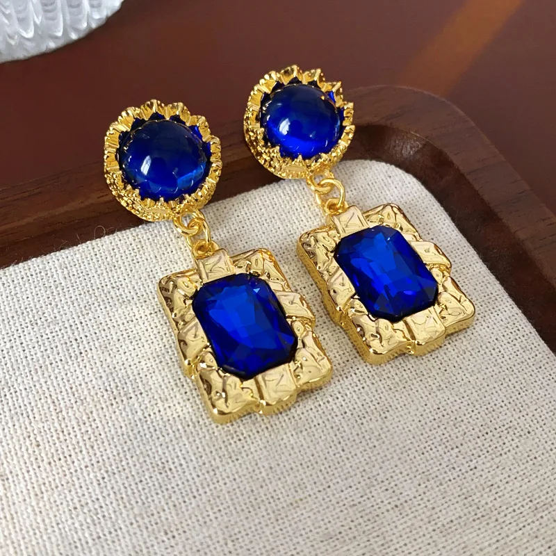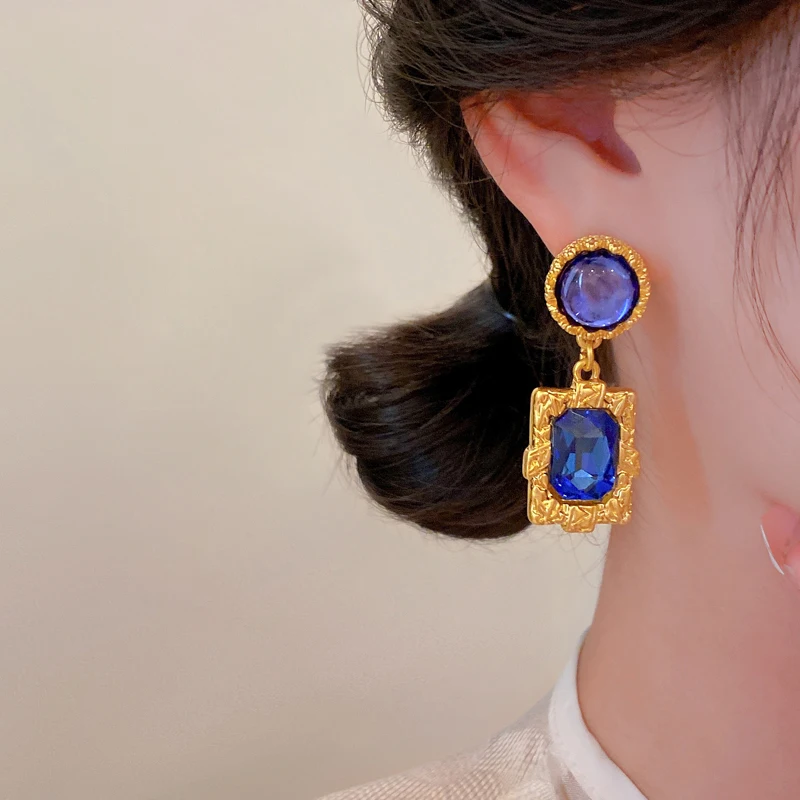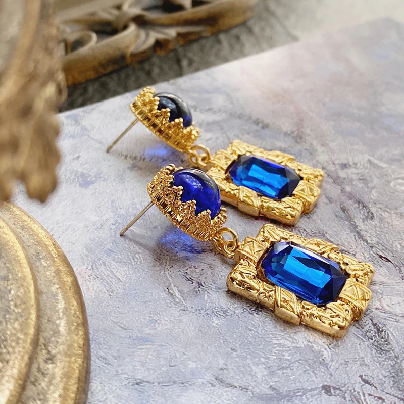 Details: Where vintage meets modern glam — these Blue Rhinestone Ornate Hyperbole Pendant Drop Earrings are a statement of style. Designed to dazzle, these stunning double-rhinestone design earrings feature gleaming round and rectangular blue rhinestones encased in intricate gold-tone frames. Highlighted by textured gold-tone detailing, these earrings command attention and elevate any outfit to dazzling heights. Their vintage-inspired design adds a regal touch to your look, making them perfect for elegant evenings or unforgettable celebrations.