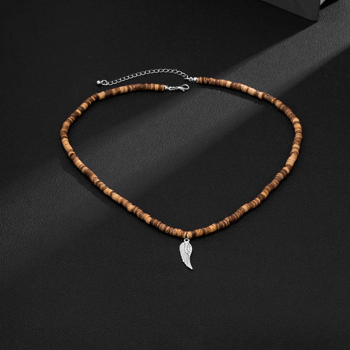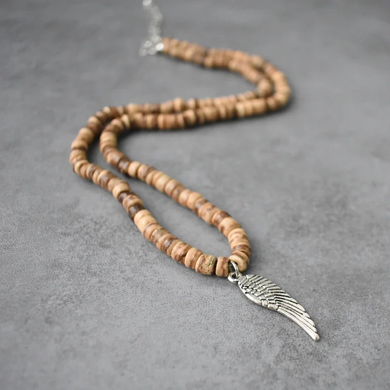 Details: This necklace combines a string of earthy rustic wooden beads with an antique-finished wing pendant, creating a piece that embodies the protective spirit of nature that feels both grounded and ethereal. The warm, natural wooden beads lead to a beautifully detailed wing pendant, symbolizing freedom and adventure. The intricate feather details on the pendant add a vintage charm, making it a versatile accessory for any occasion. Perfect for those who love to explore and express their unique style.