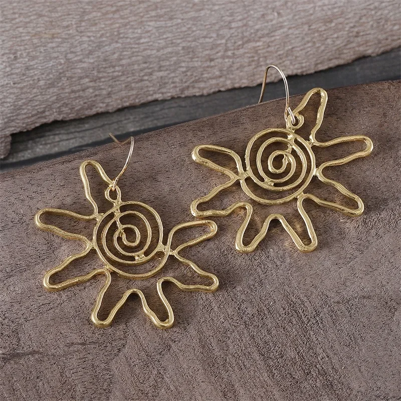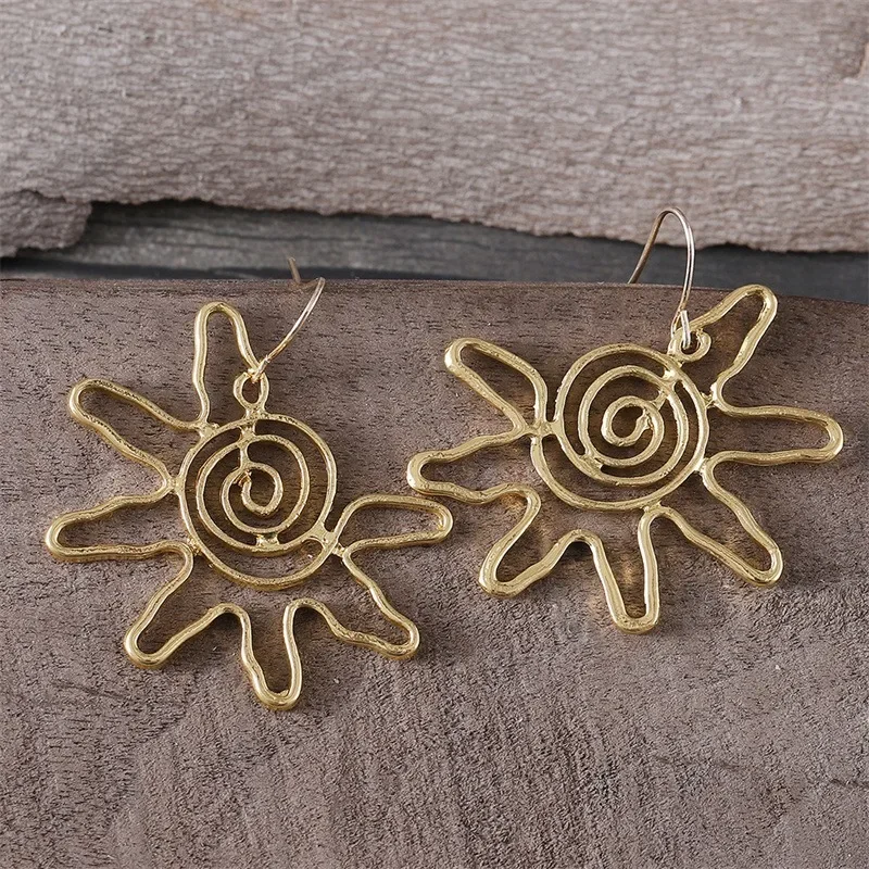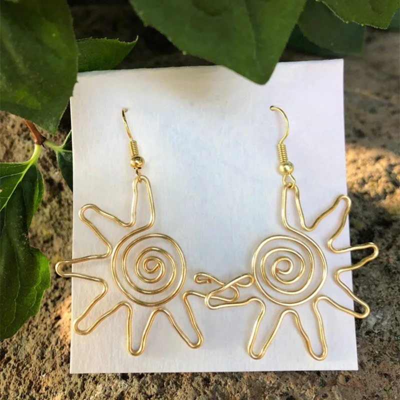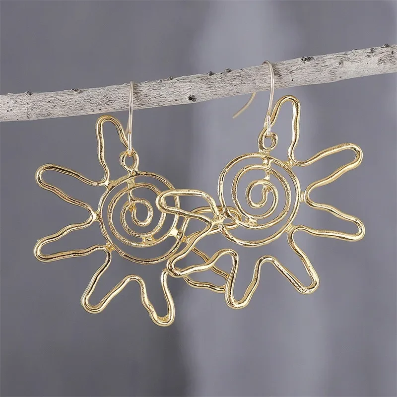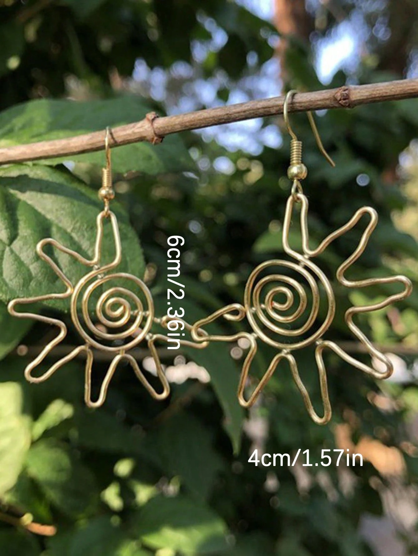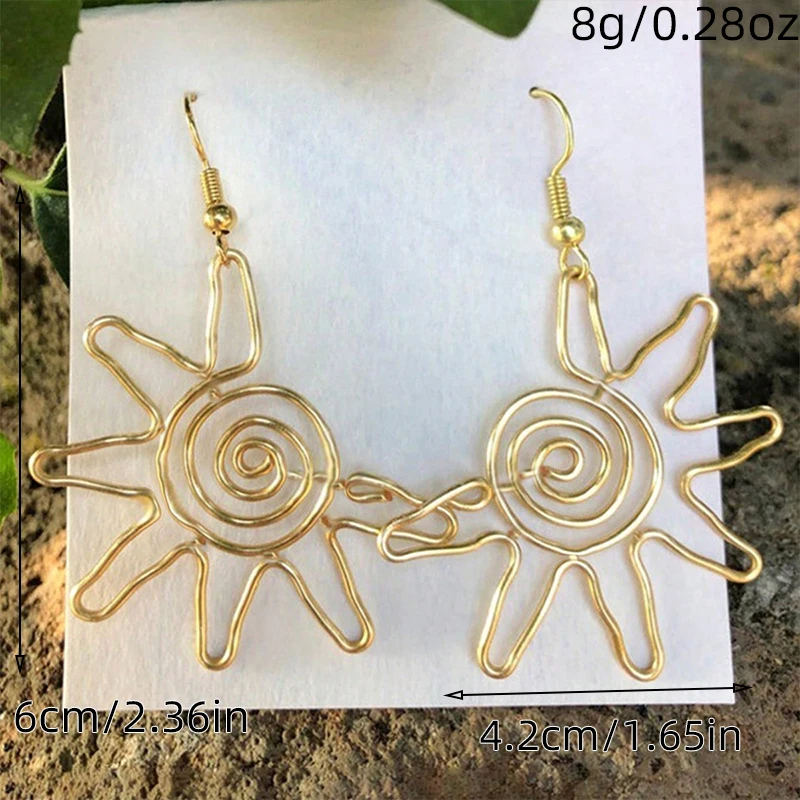 Details: Shine bright with these Boho Sun Motif Hook Earrings. These stunning earrings feature a whimsical sun motif with a spiral center and radiating rays that captures the essence of bohemian style. With their lightweight zinc alloy gold-plated construction, they offer comfort and elegance, making them the perfect accessory to brighten up any outfit. Perfect for festivals, beach days, or any occasion where you want to shine.