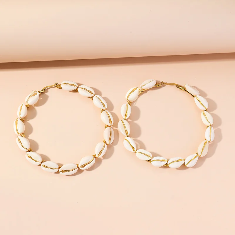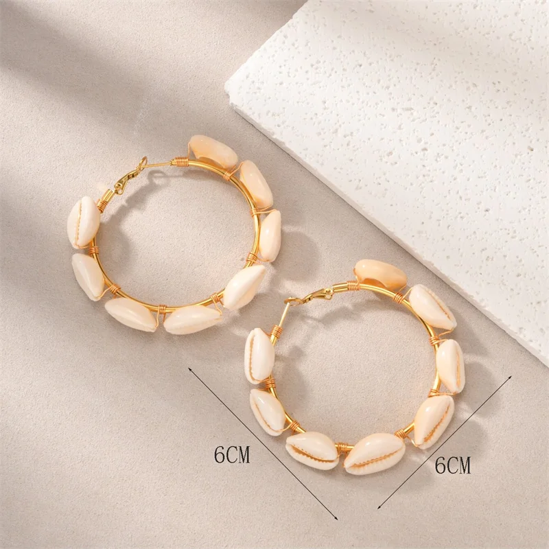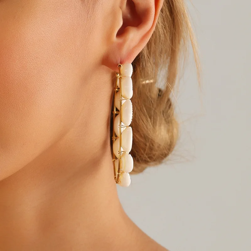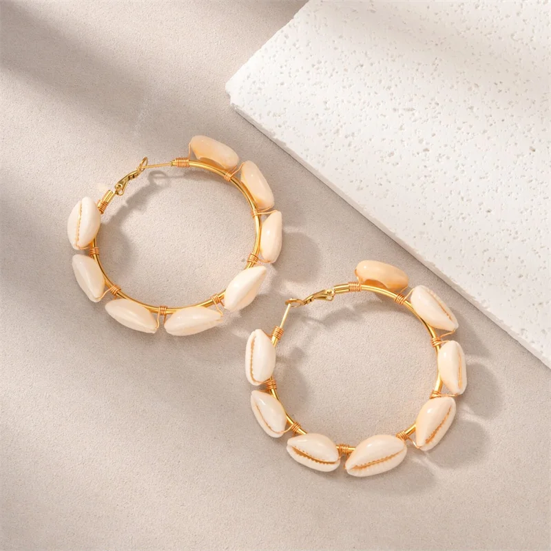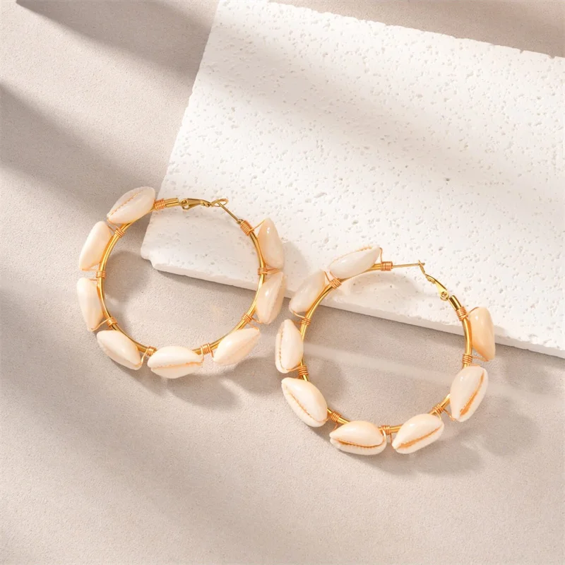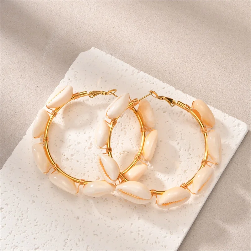 Details: These earrings bear the marks of the sea’s artistry. Crafted from natural seashells, these dangle hoop earrings capture the essence of sun-kissed beaches and salty breezes. The shells’ irregular shapes celebrate imperfection — the beauty found in asymmetry. Each creamy white shell swings gracefully from a golden hoop, like a miniature piece of the shore. Wear them to evoke memories of lazy afternoons collecting seashells or dancing by the water’s edge. Whether you’re sipping coconut water at a beachside café or twirling at a music festival, these earrings add a touch of coastal magic. Let them sway with your every step, echoing the rhythm of the tides.