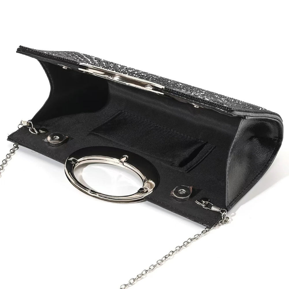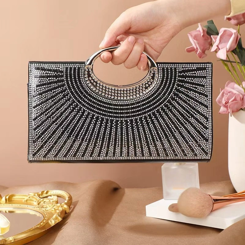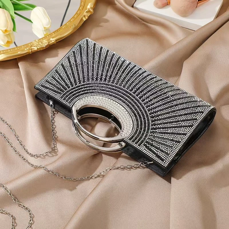 Details: Make a dazzling entrance with this stunning bridal clutch purse. Encrusted with shimmering rhinestones that radiate from a central circular handle, this rectangular design handbag exudes timeless elegance and sophistication. The sleek black, silver hue, or golden tones of the champagne color provides a striking contrast to the sparkling embellishments, making it a perfect accessory for any formal occasion. This handbag is perfect for brides, bridesmaids, or any evening event where you want to shine.