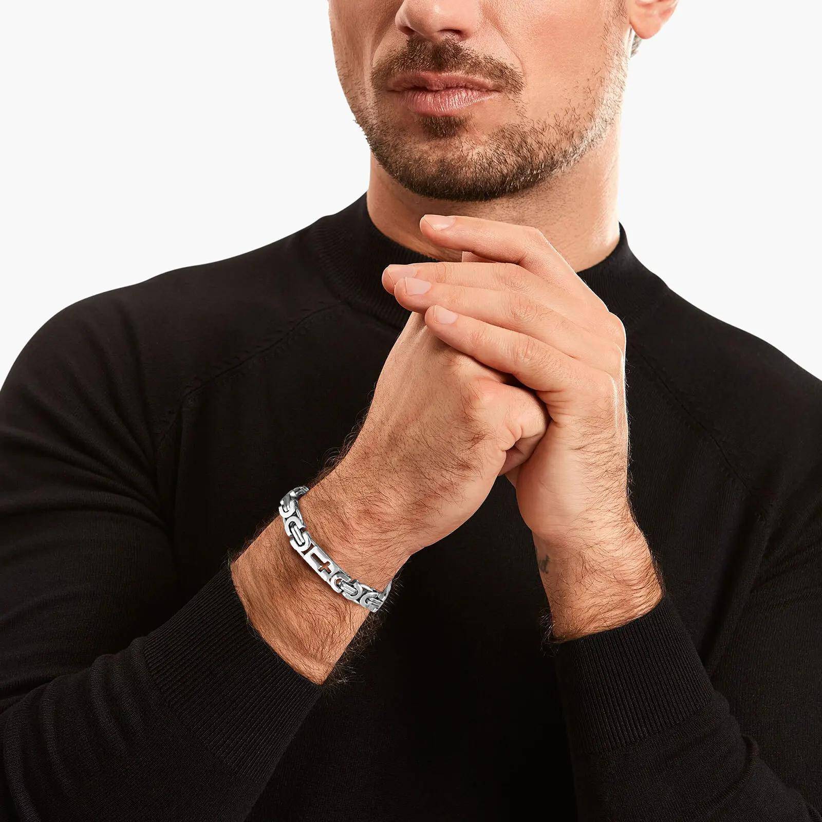 Details: Strength meets symbolism in this striking bracelet designed for the modern man. Crafted from durable stainless steel, its silver-toned links form a bold Byzantine-inspired chain, each rectangular segment etched with alternating upright and inverted cross motifs. The polished finish catches the light with a refined gleam, while the intricate interplay of shapes creates a look that’s both rugged and sophisticated. This bracelet is a statement of resilience, faith, and timeless style. Whether worn solo for a minimalist edge or paired with other pieces for layered impact, it embodies masculine elegance with a touch of mystique.