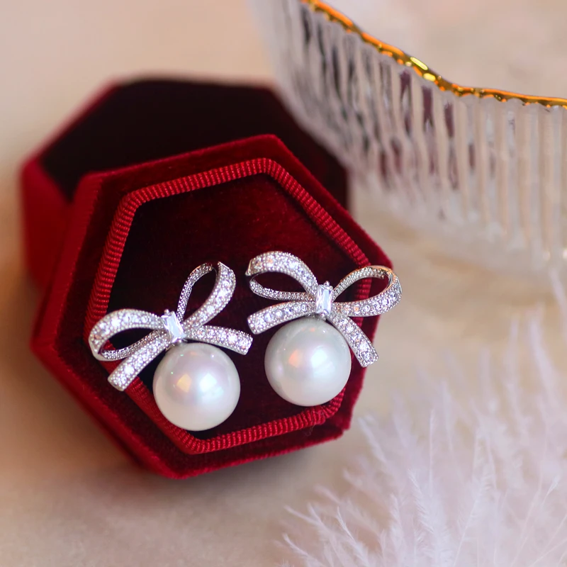 Details: Stud earrings with bowknot or ribbon design embellished with shiny high-quality Cubic Zirconia gemstones and large simulated pearl dangling below. This is an exquisite pair of stud earrings that are suitable for a night out or as wedding jewelry.