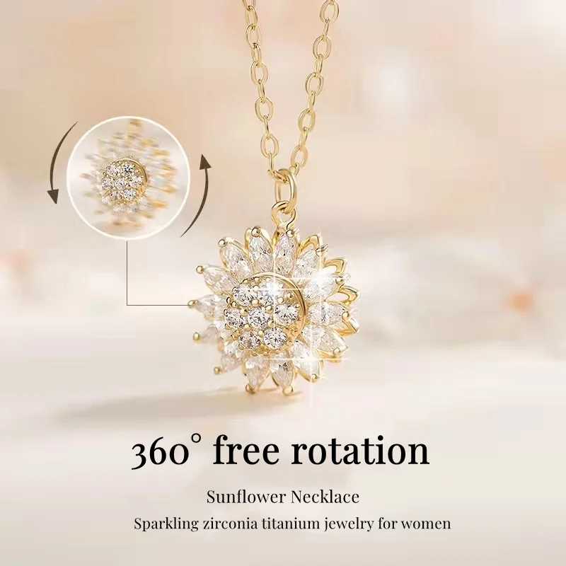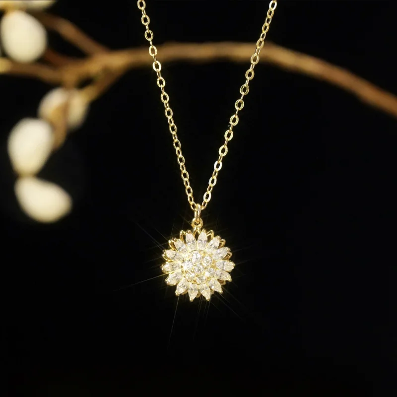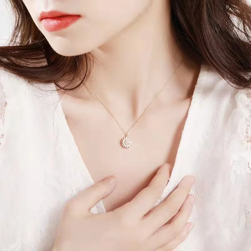 Rotatable Sunflower Flower Floral Cubic Zirconia Pendant Necklace Necklaces New Arrivals Pendants Women Jewelry