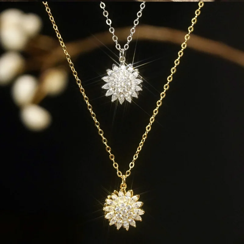 Details: Embrace the beauty of nature with a touch of sparkle! This exquisite pendant necklace features a double-layer sunflower design, where the top layer or stamen of the flower, adorned with seven dazzling cubic zirconia gemstones, rotates gracefully above the plate holding the petals (please refer to the photo below), adding a dynamic and interactive element while all cubic zirconia catches and reflects light beautifully, ensuring you shine from every angle. Available in both silver and gold tones, this necklace is a perfect blend of elegance and playfulness. Perfect for those who love unique and engaging jewelry, this necklace is sure to add a touch of whimsy and elegance to any outfit.