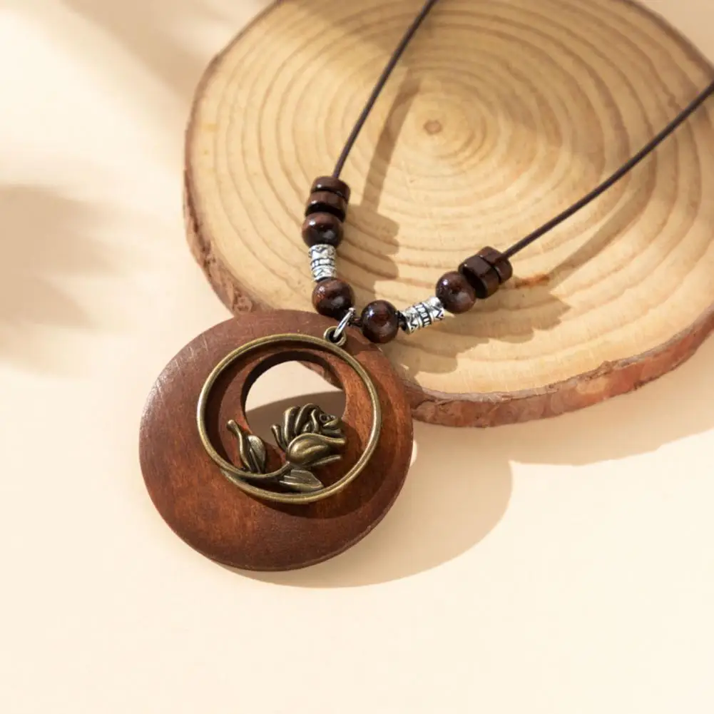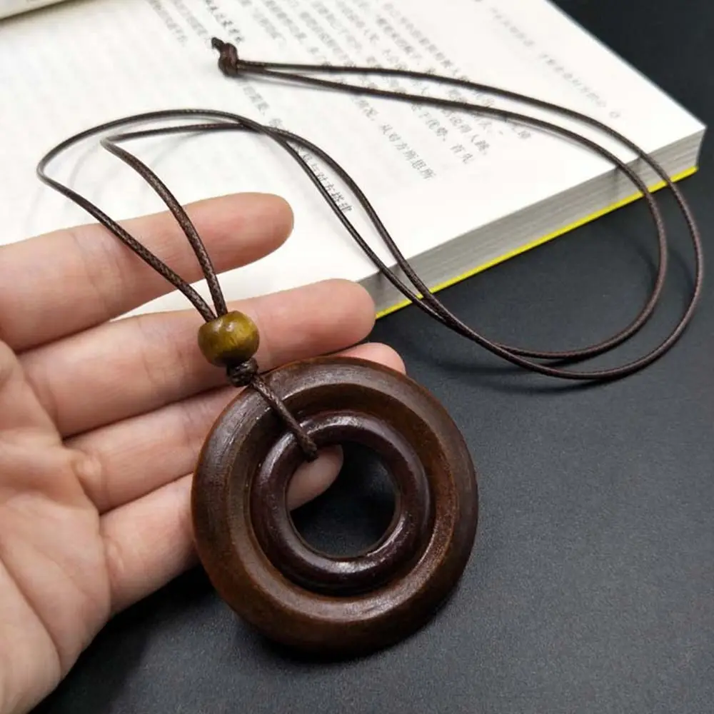 Ethnic Round Wooden Long Chain Pendant Necklace