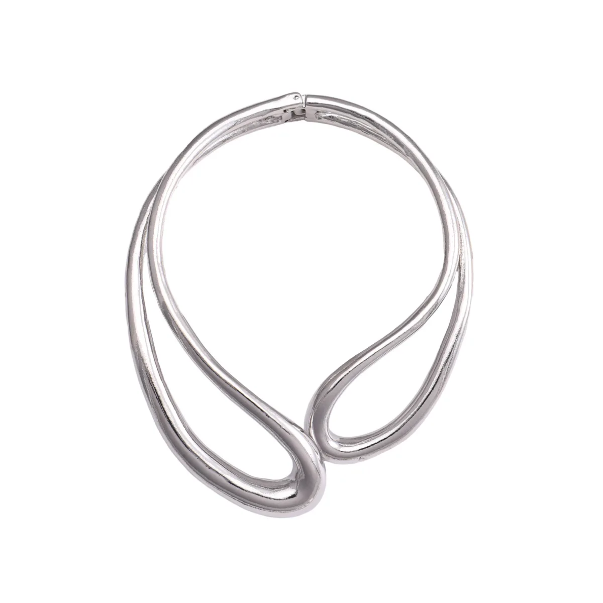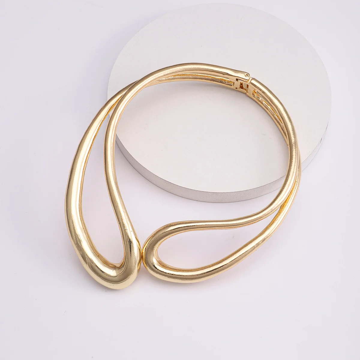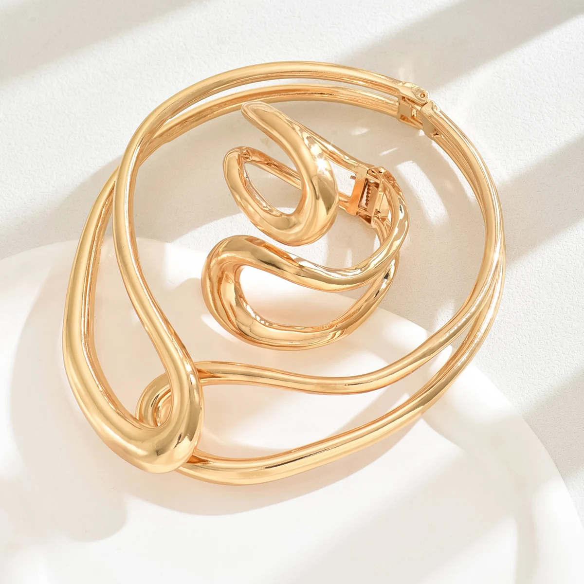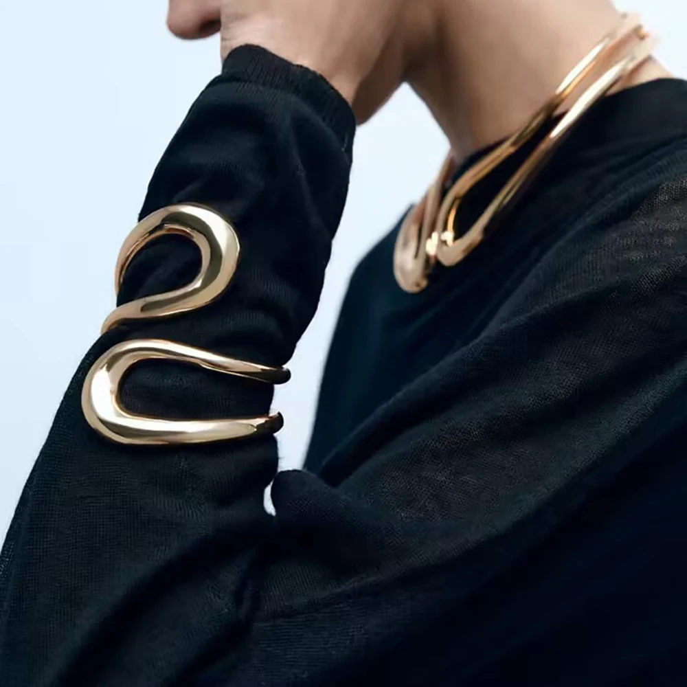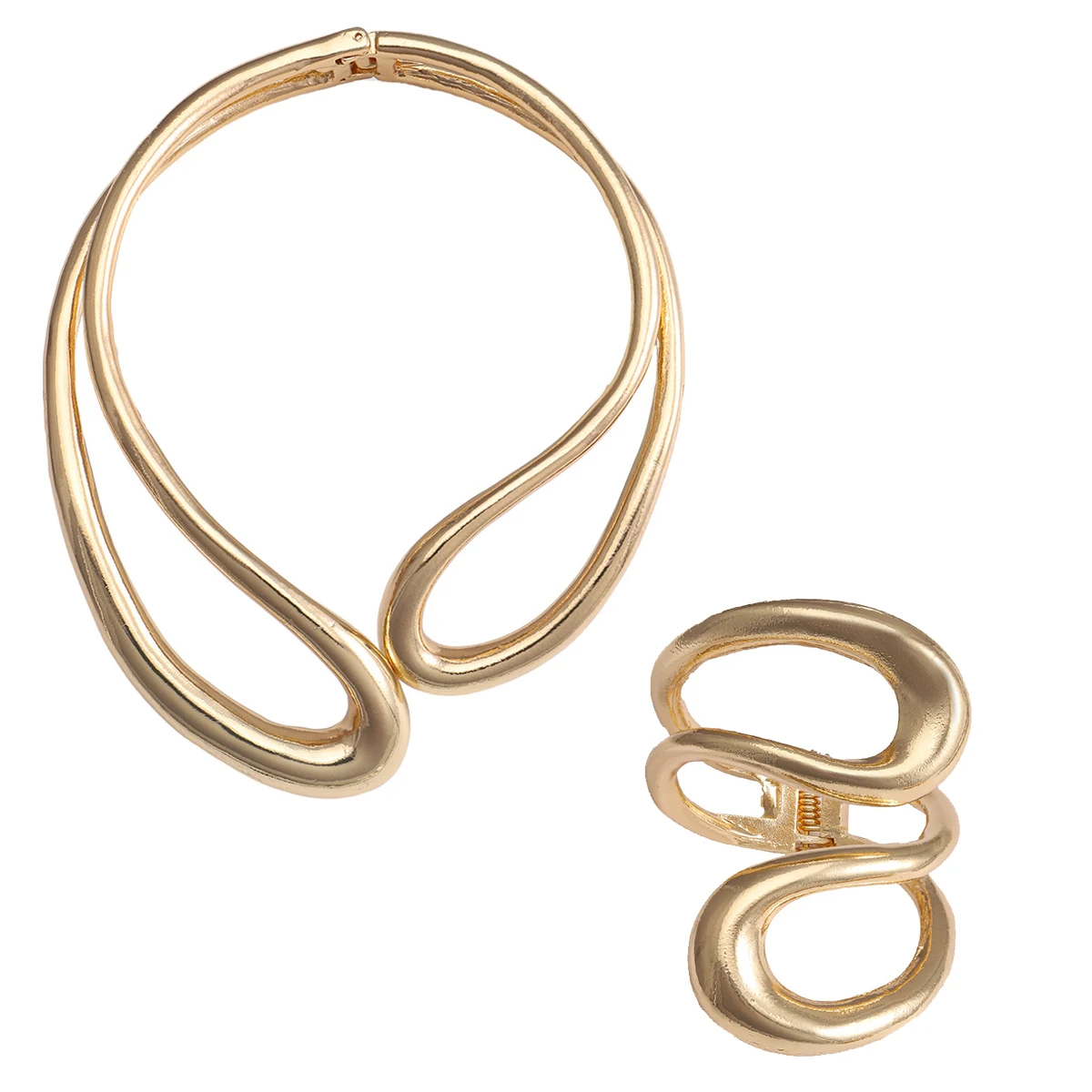 Details: Embrace the allure of modern elegance with this stunning gold or silver-tone bracelet. Its intricate geometric cutouts create a mesmerizing three-dimensional design that dances with light and catches the eye from every angle, while the irregular shapes add a touch of avant-garde sophistication. Perfect for elevating any outfit, this bracelet is a statement piece that exudes confidence and style. The exquisite gold or silver-tone necklace is a masterpiece radiates contemporary design and charm. The open-front design gracefully curves around your neckline, creating a captivating silhouette, while the teardrop shape and geometric cutouts create a harmonious blend of modernity and grace. The geometric cutouts add a unique texture, making this necklace a perfect blend of modern artistry and timeless elegance. Wear it to make a bold yet refined statement.