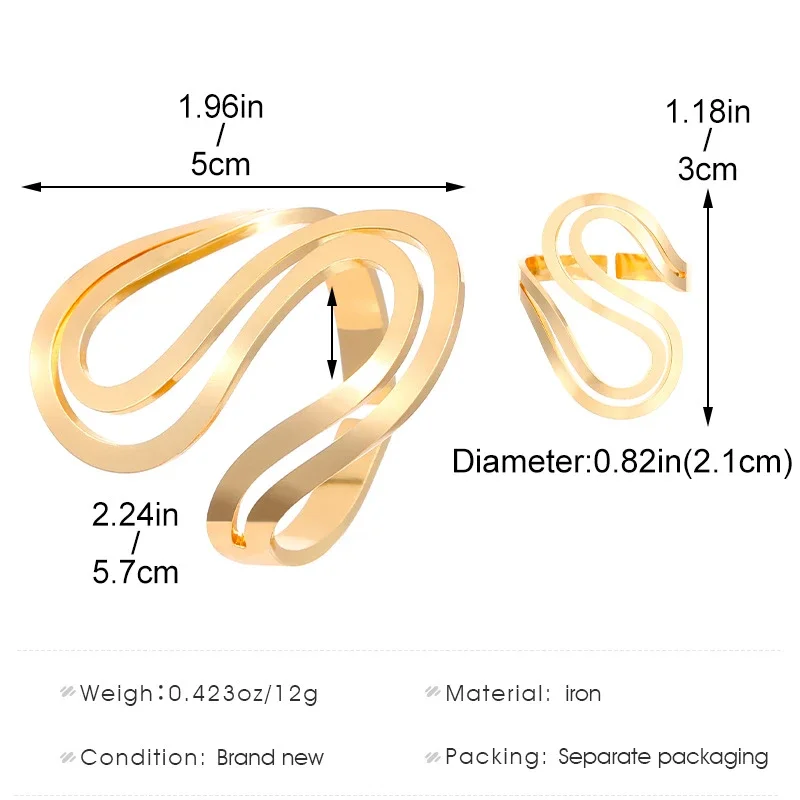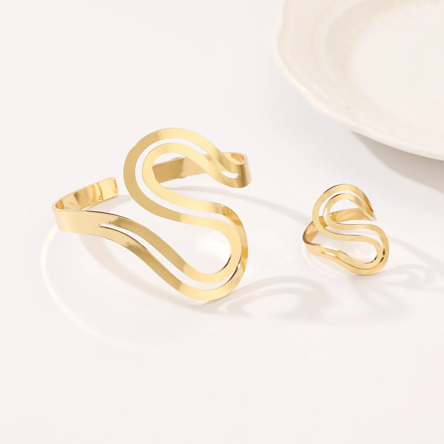 Complement your style with the Golden Double S-shaped Open Ring, a piece that mirrors the elegance of its bracelet counterpart. This ring features the same fluid, double S-shaped design, scaled down to gracefully adorn your finger. The open-ended structure allows for adjustable sizing, ensuring a perfect fit. With a smooth, lustrous finish, this ring adds a touch of contemporary elegance to any outfit. Pair it with the matching bracelet for a cohesive, chic look that exudes confidence and style.