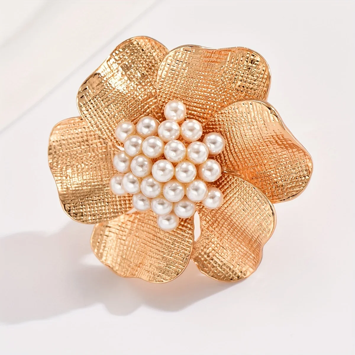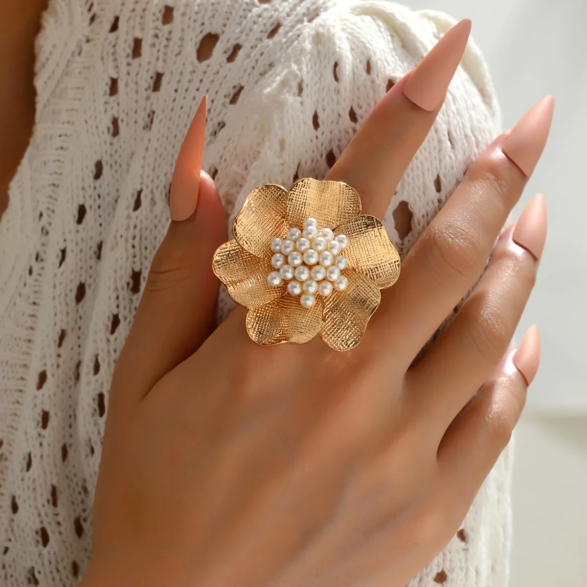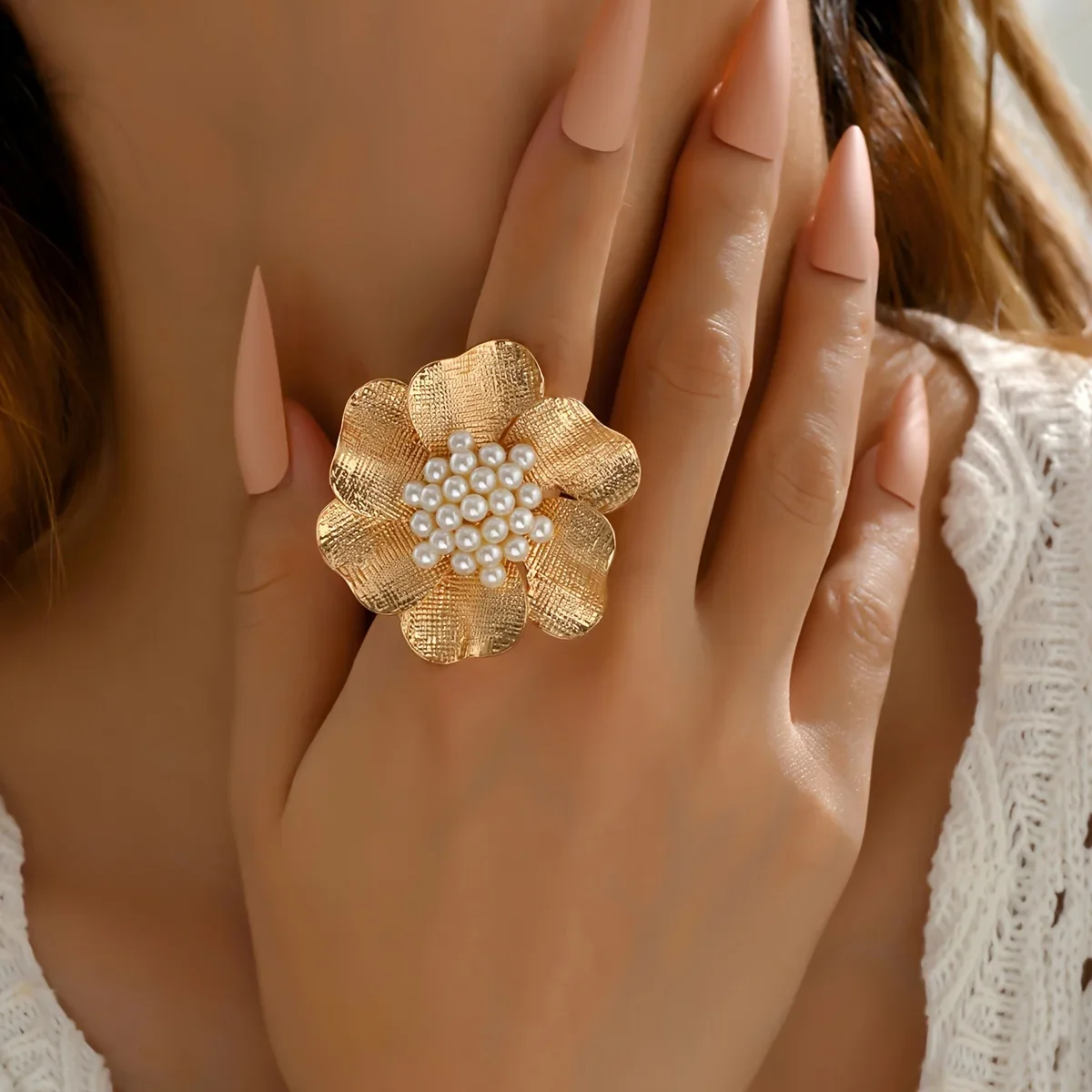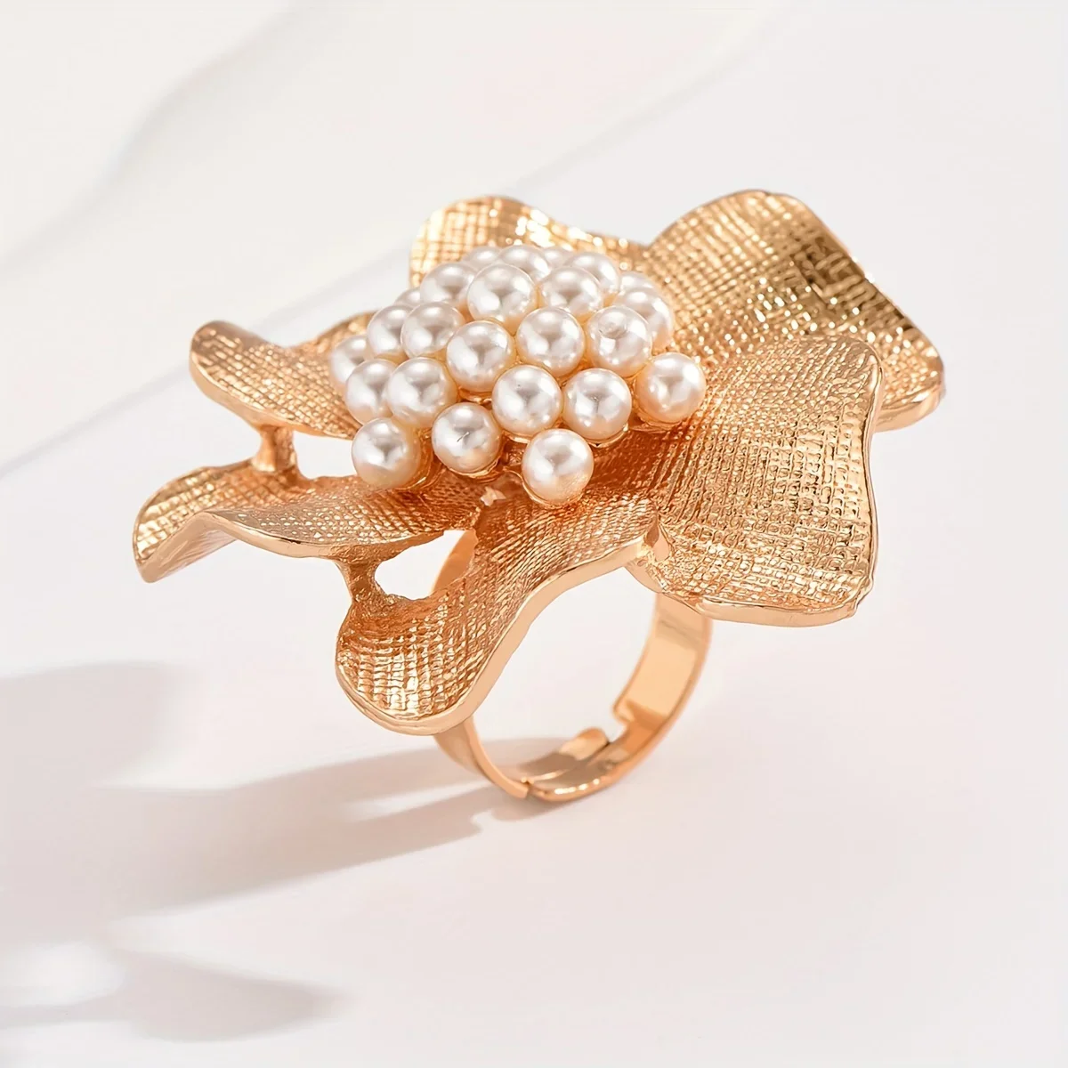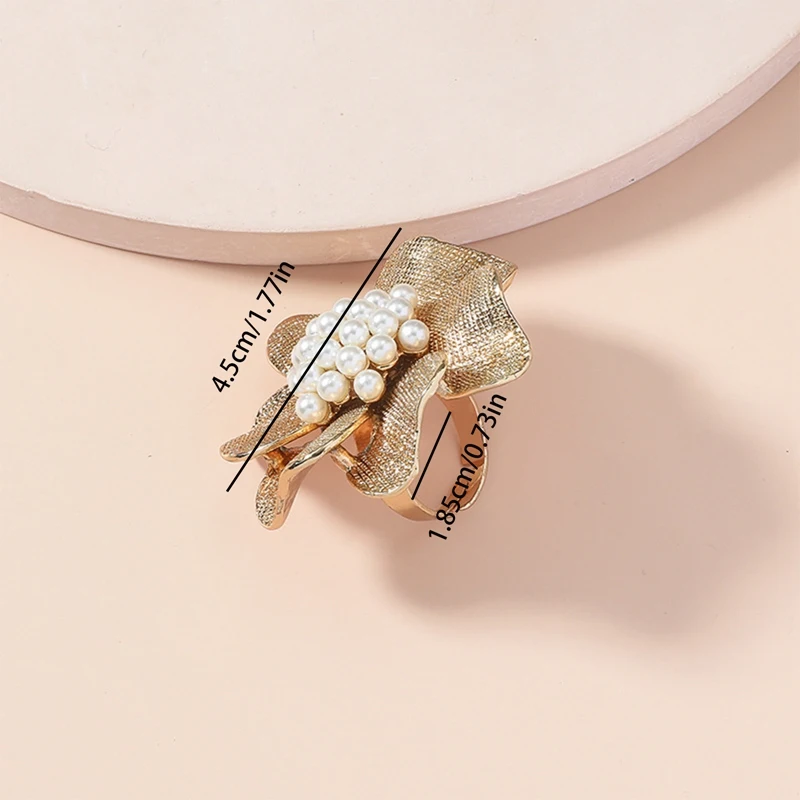 Details: Let’s celebrate the beauty of nature with this Golden Flower Faux Pearl Open Ring. A delicate flower with golden petals, capturing the essence of blooming spring. The textured surface of the petals mimics the veining found in real flowers. At the heart of the blossom, a cluster of faux pearls adds elegance. The open ring design allows for easy adjustment, ensuring a comfortable fit. Perfect for both casual outings and special occasions. Wear this ring as a reminder of the timeless allure of floral beauty.