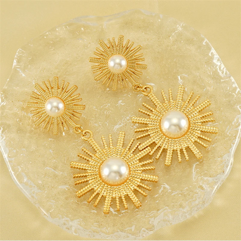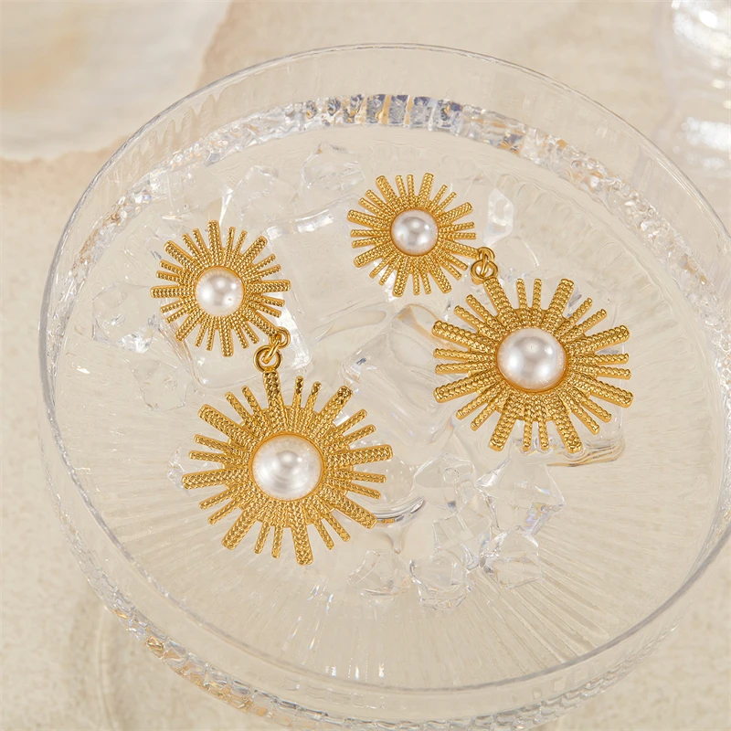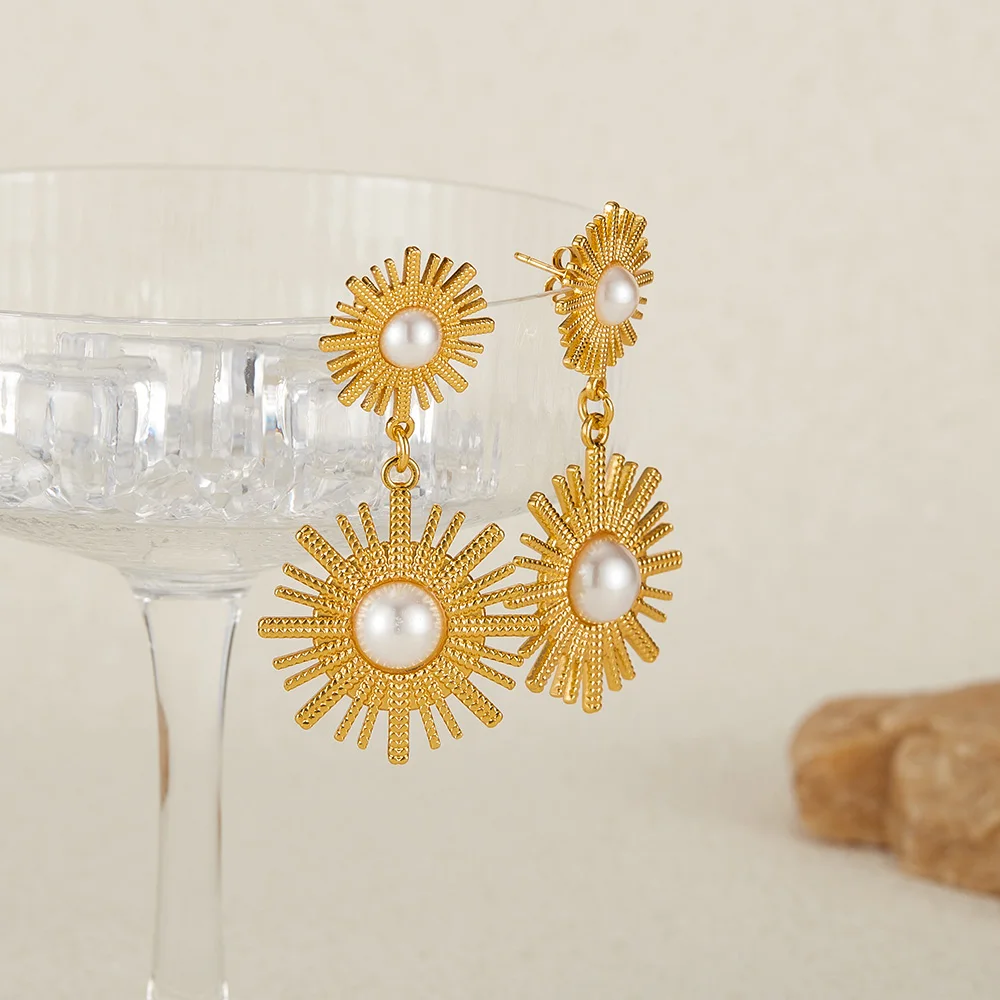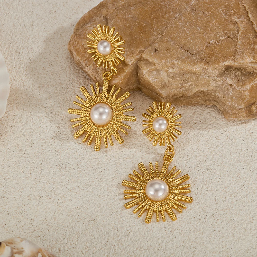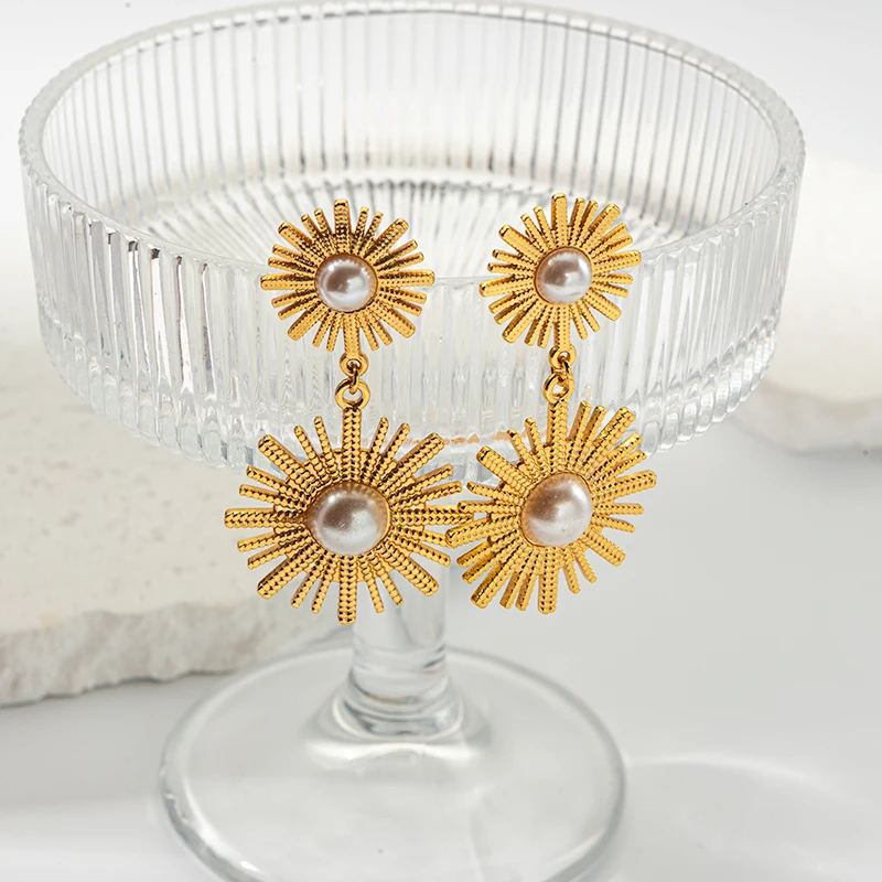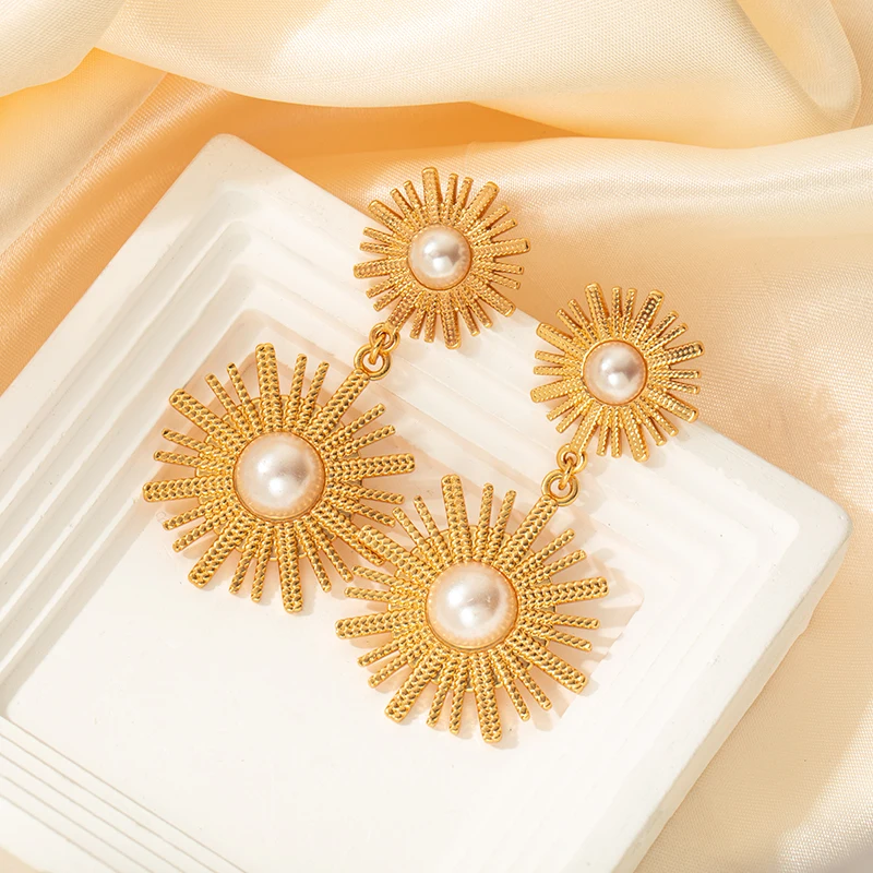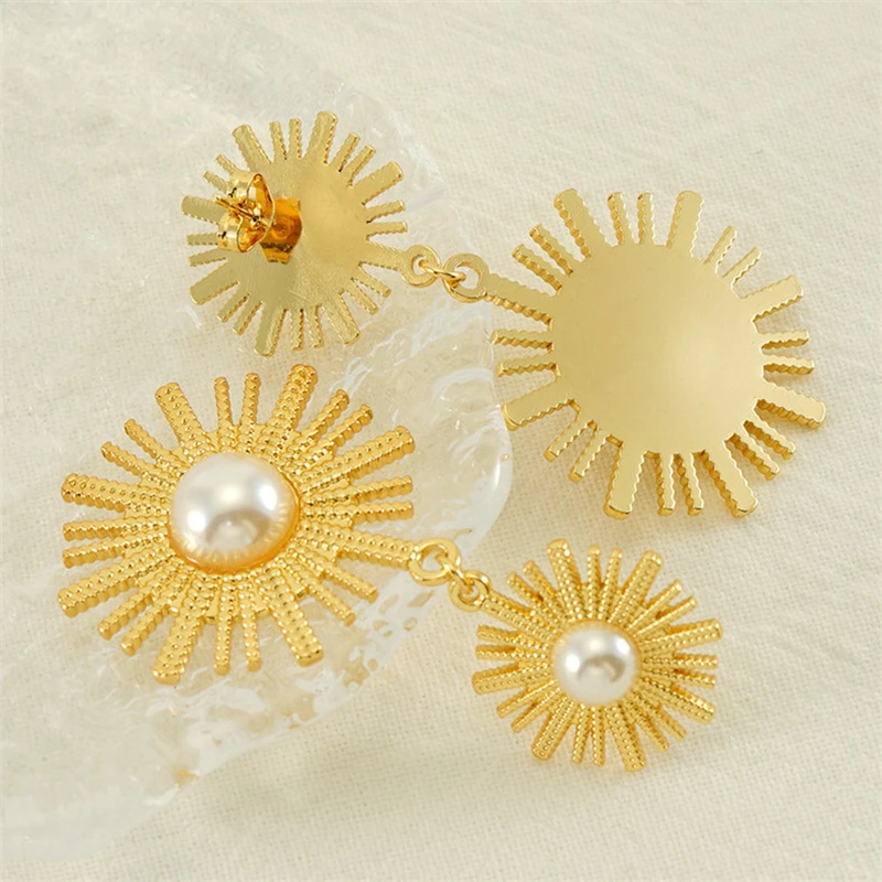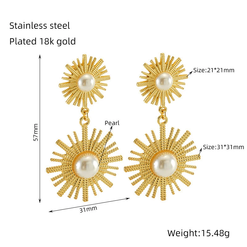 Details: Radiating timeless charm and celestial elegance, these Golden Sun earrings are a tribute to the power of light and the grace of femininity. Crafted in 18k gold plating stainless steel, each earring features a dual-circle silhouette — an upper accent and a larger sunburst disc below — both crowned with luminous faux pearls that evoke the glow of dawn. The textured spokes burst outward like rays of sunlight, catching every flicker of movement and reflecting it with golden brilliance. Suspended delicately, they sway with a gentle rhythm, adding drama and warmth to any look. Whether you’re channeling goddess energy or elevating a minimalist ensemble, these earrings are your golden hour—on demand.