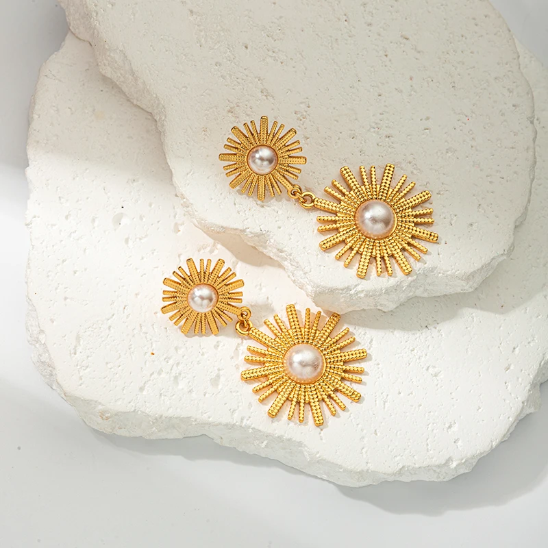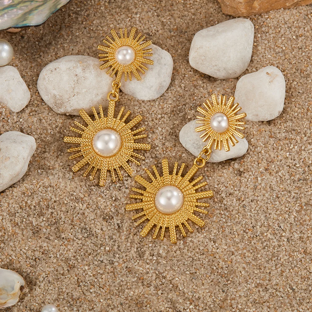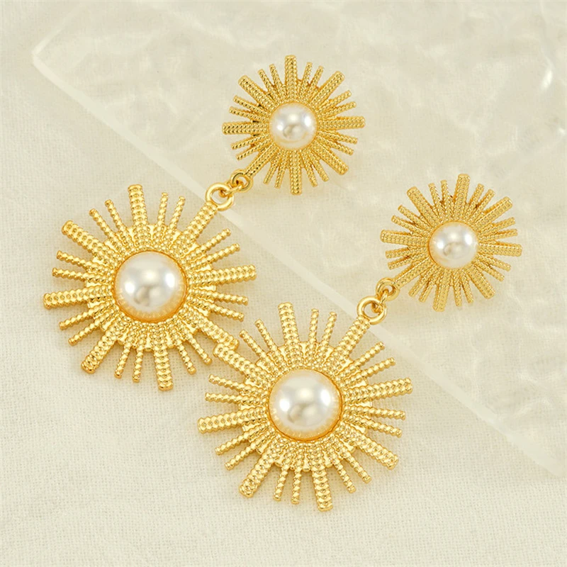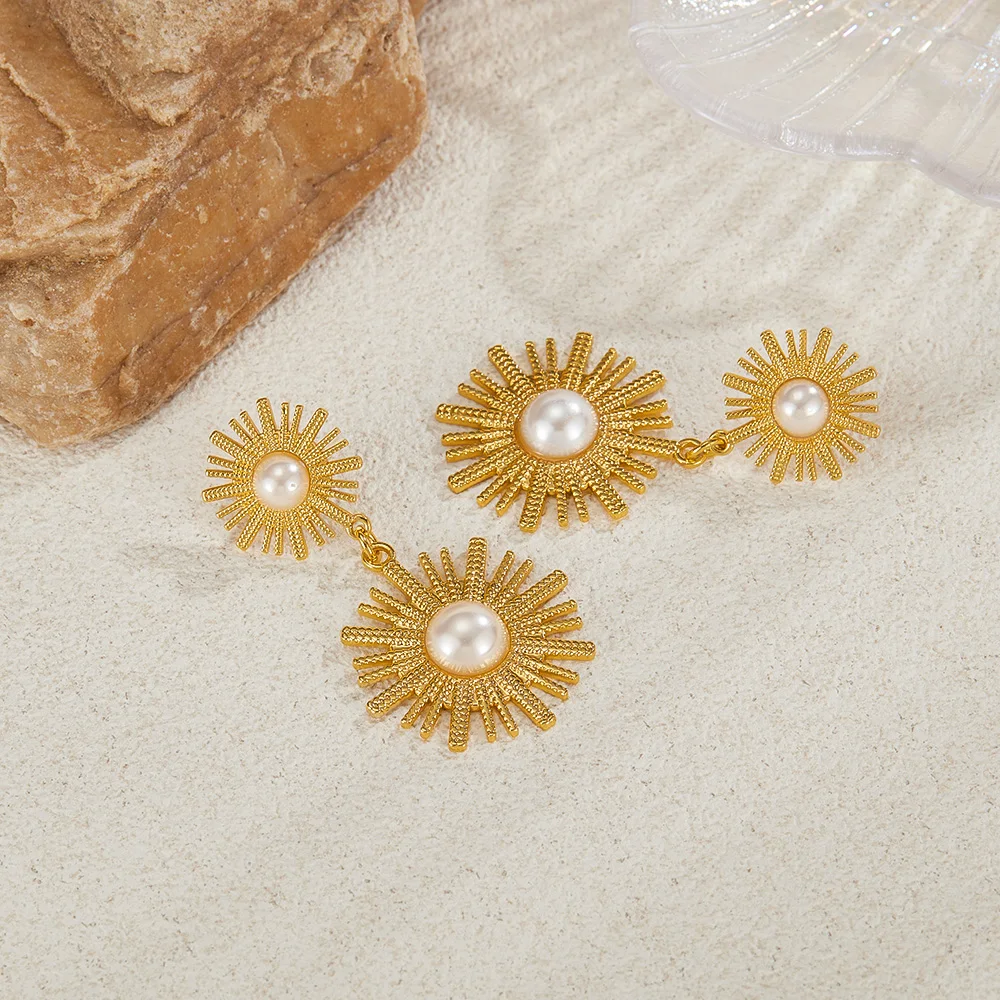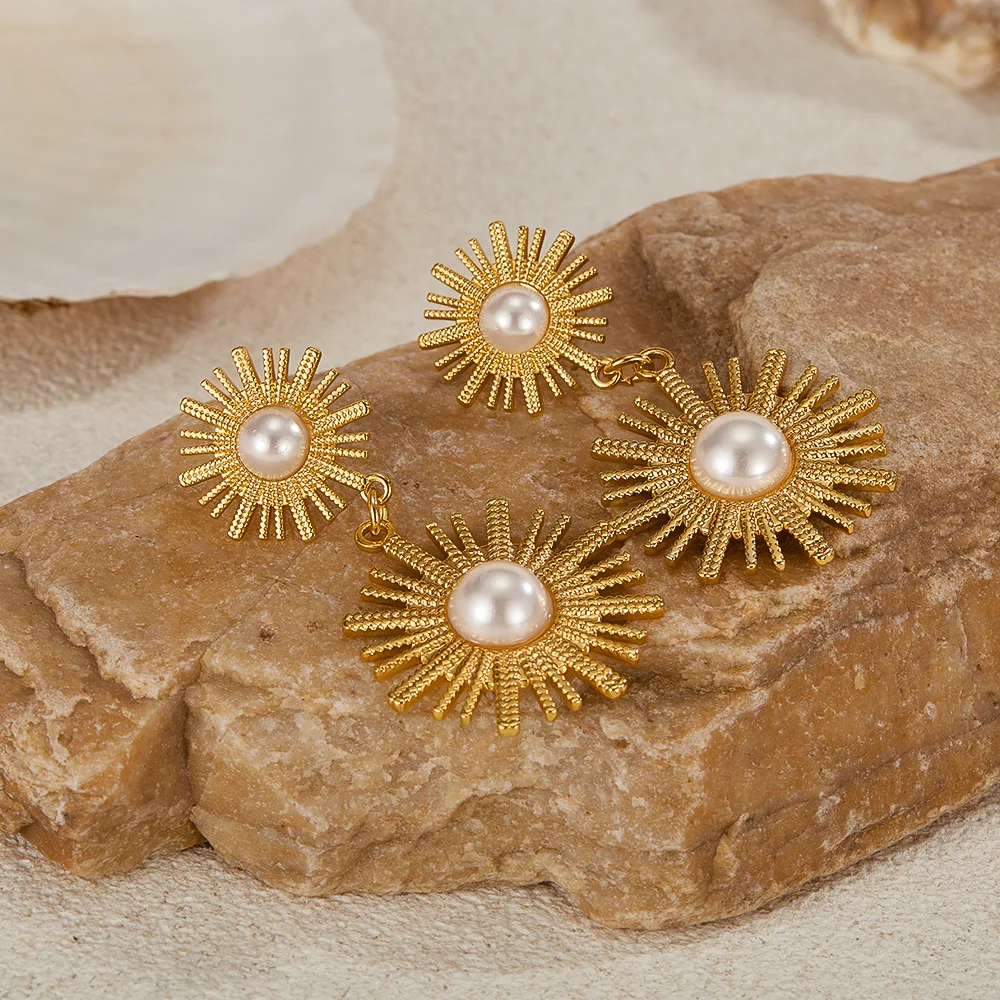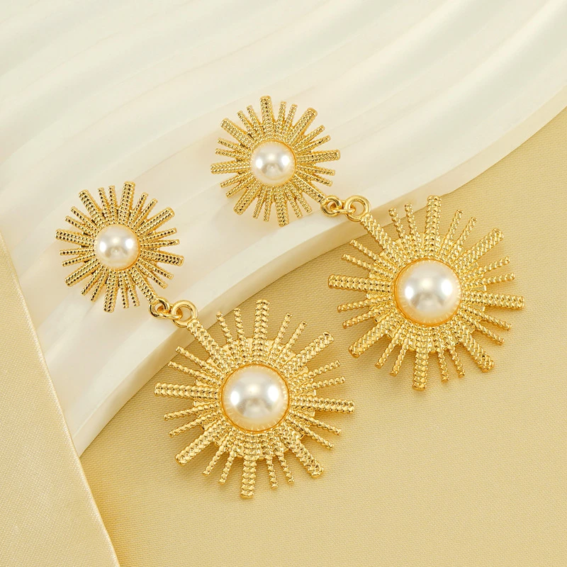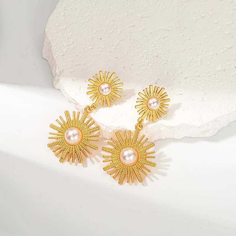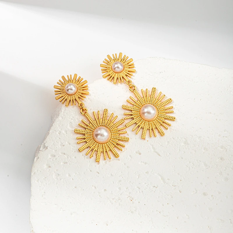 Details: Radiating timeless charm and celestial elegance, these Golden Sun earrings are a tribute to the power of light and the grace of femininity. Crafted in 18k gold plating stainless steel, each earring features a dual-circle silhouette — an upper accent and a larger sunburst disc below — both crowned with luminous faux pearls that evoke the glow of dawn. The textured spokes burst outward like rays of sunlight, catching every flicker of movement and reflecting it with golden brilliance. Suspended delicately, they sway with a gentle rhythm, adding drama and warmth to any look. Whether you’re channeling goddess energy or elevating a minimalist ensemble, these earrings are your golden hour—on demand.