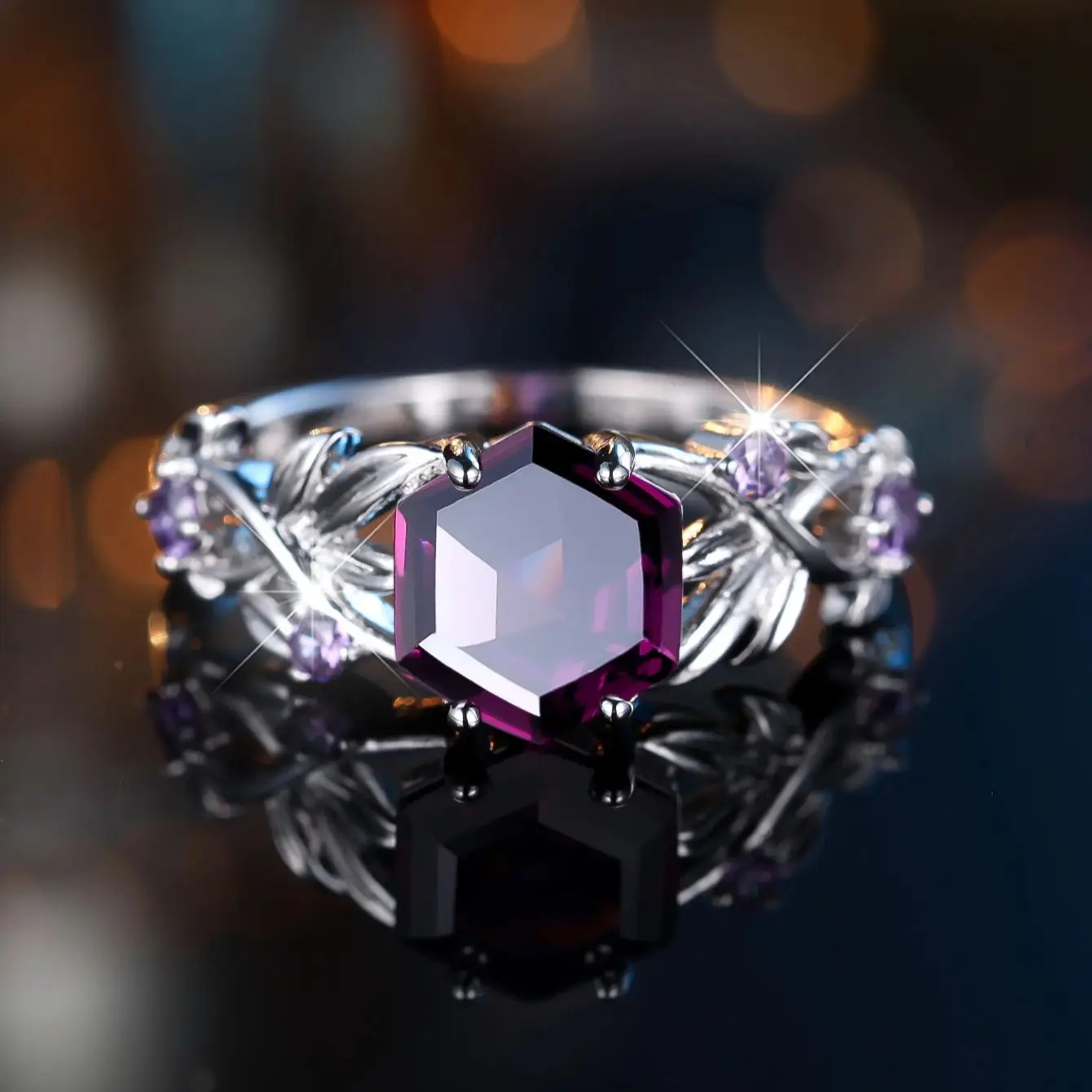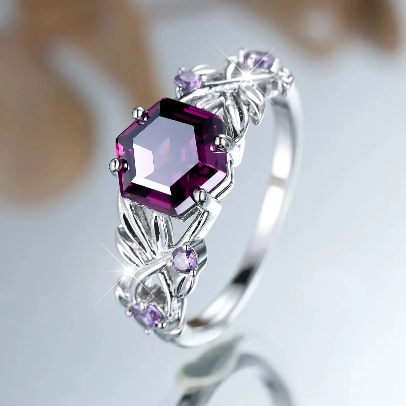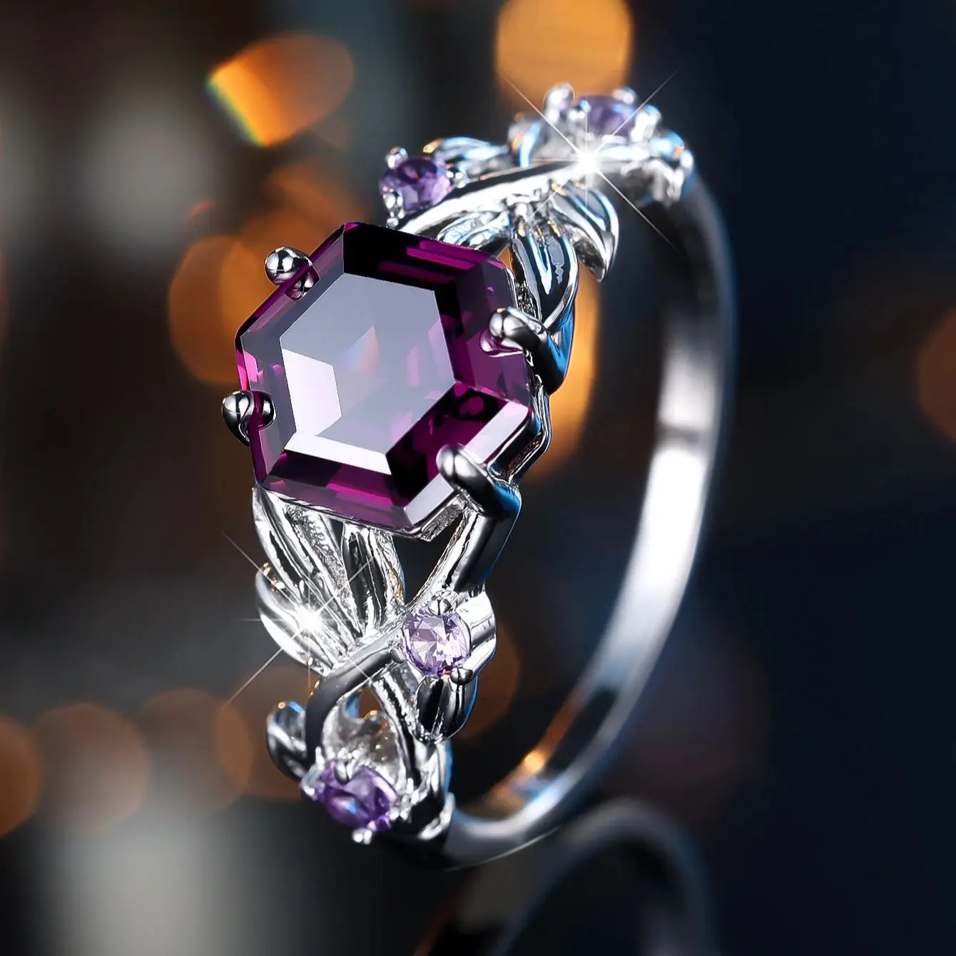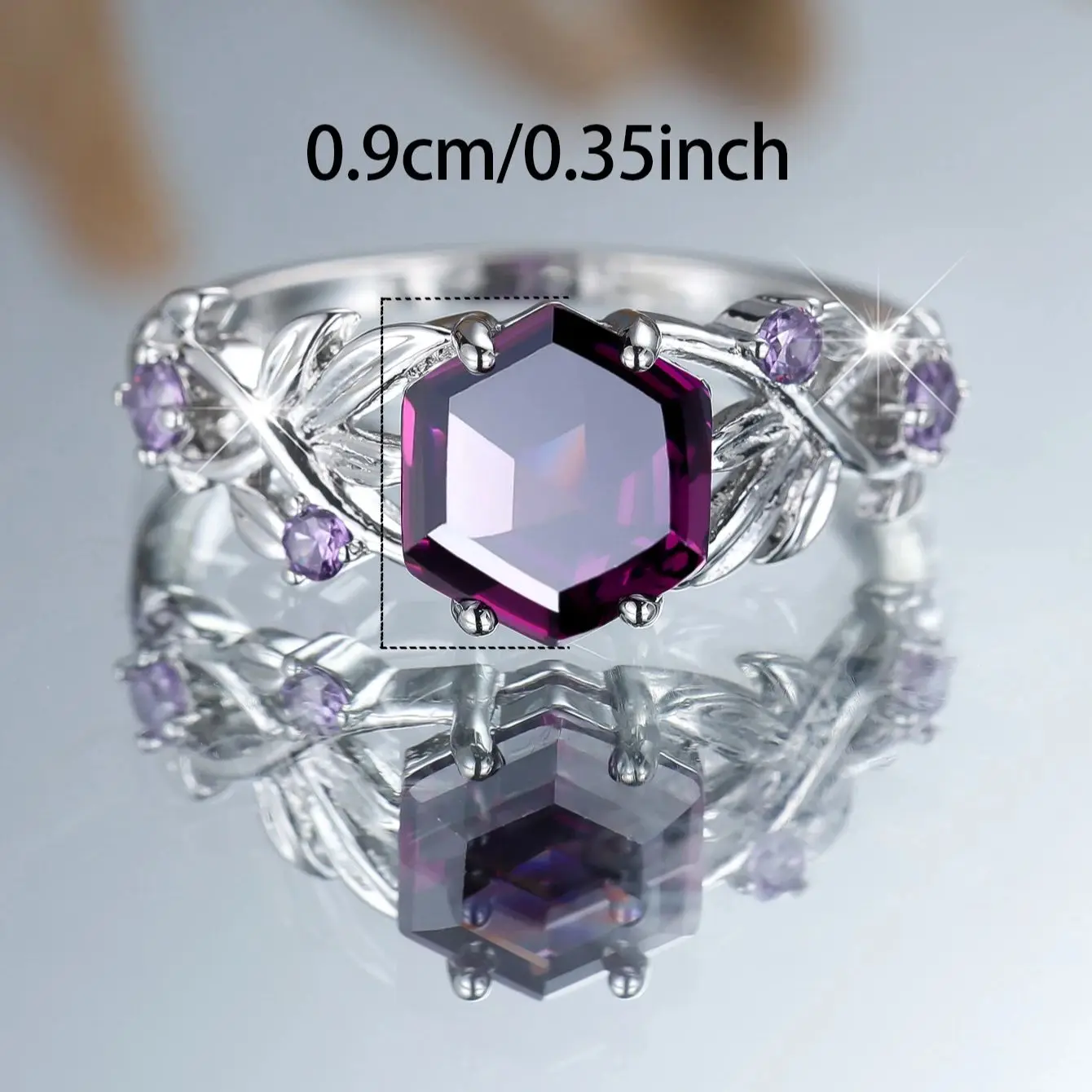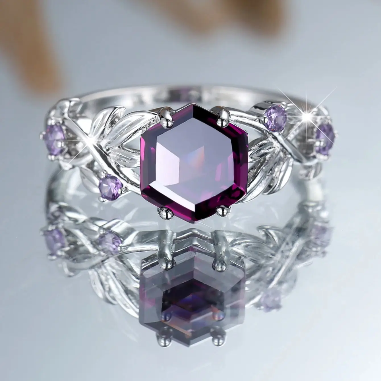 Hexagon Amethyst Purple Cubic Zirconia Flower Engagement Ring