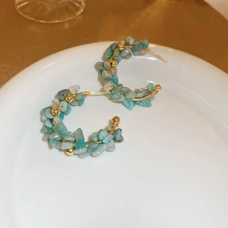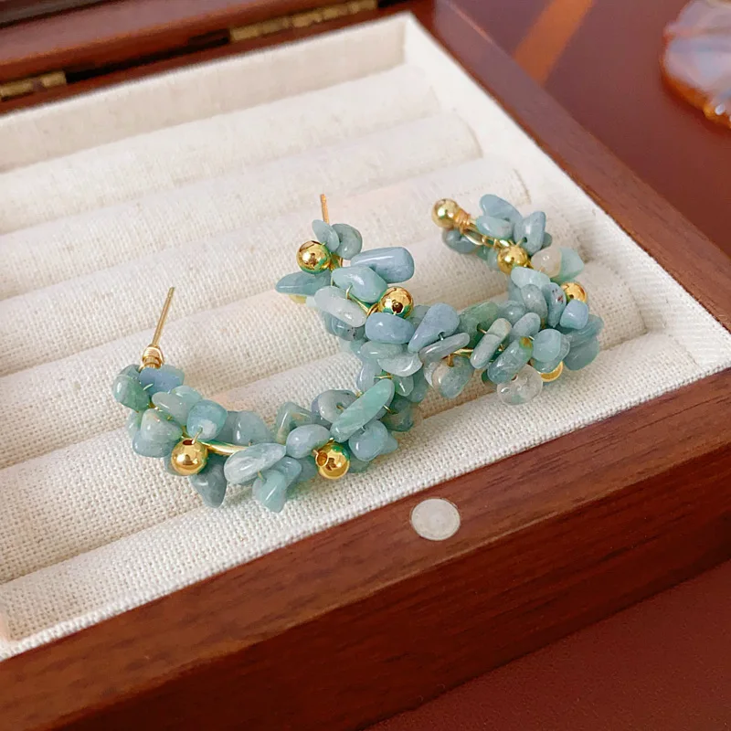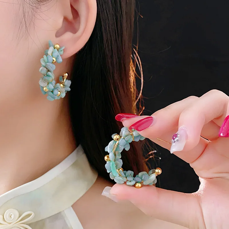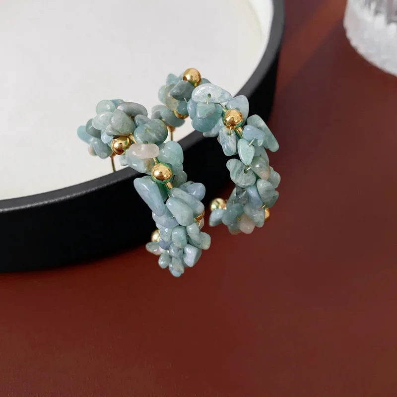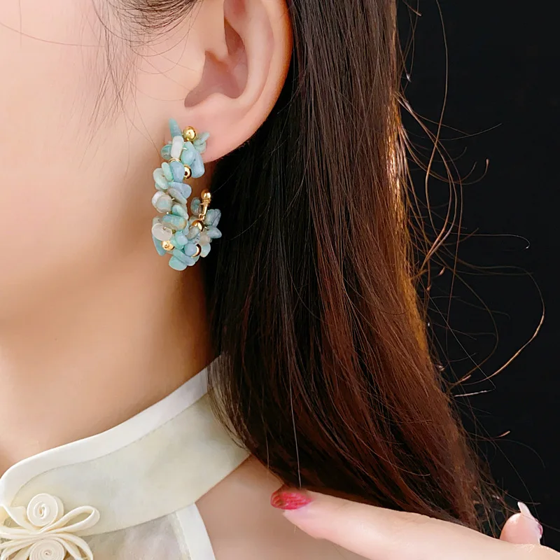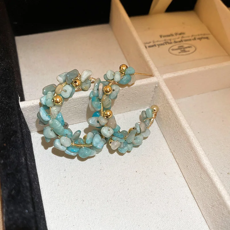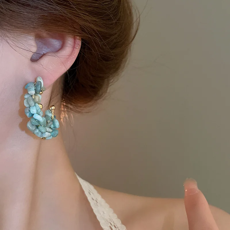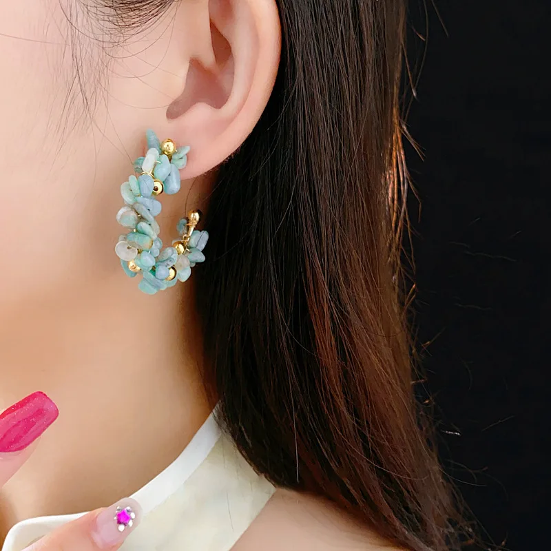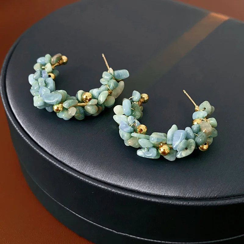 Details: Dive into the depths of elegance with these Irregular Natural Blue Crystal Beads C-Shaped Circular Hoop Earrings. Each earring is a unique masterpiece, featuring an array of irregularly shaped blue crystal beads that shimmer like the ocean’s waves. The cool, calming hues of the crystals are beautifully contrasted by delicate golden beads, adding a touch of warmth and sophistication. Perfect for those who appreciate the beauty of nature’s imperfections, these earrings are a statement piece that effortlessly blends earthy charm with refined elegance. Whether you’re dressing up for a special occasion or adding a touch of glamour to your everyday look, these earrings are sure to make a splash.