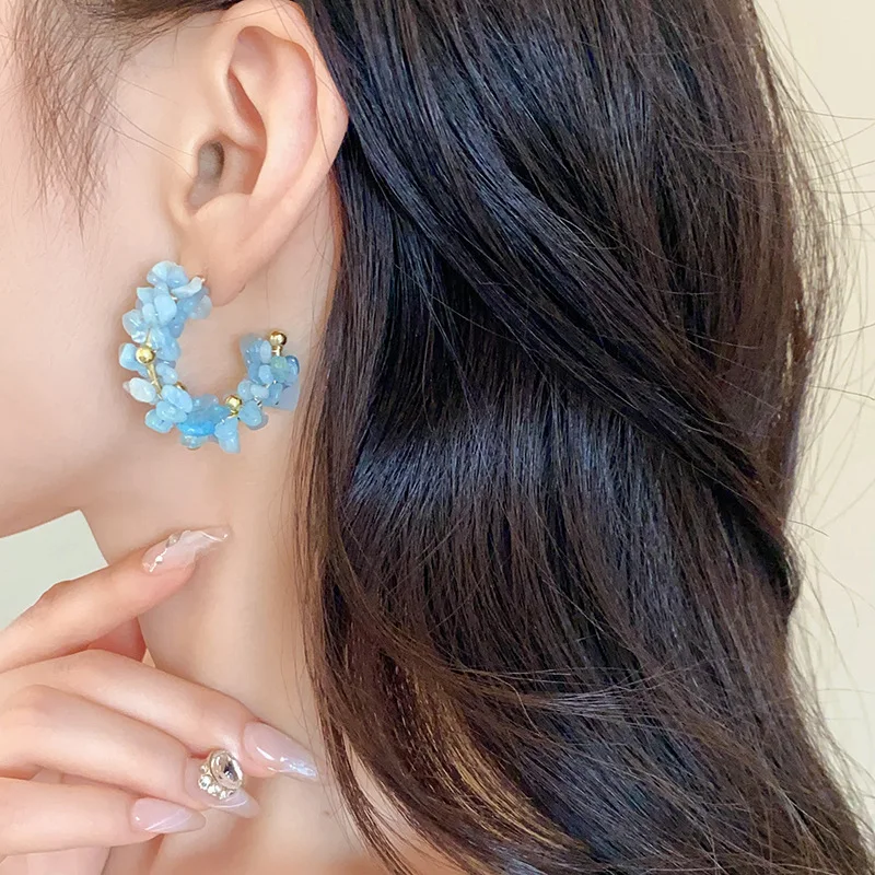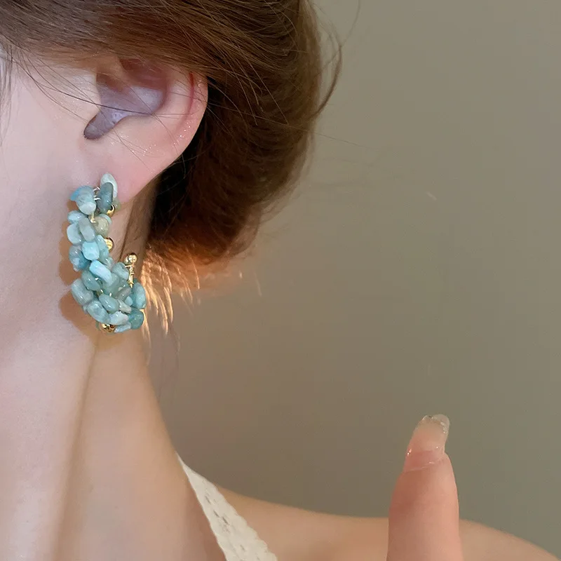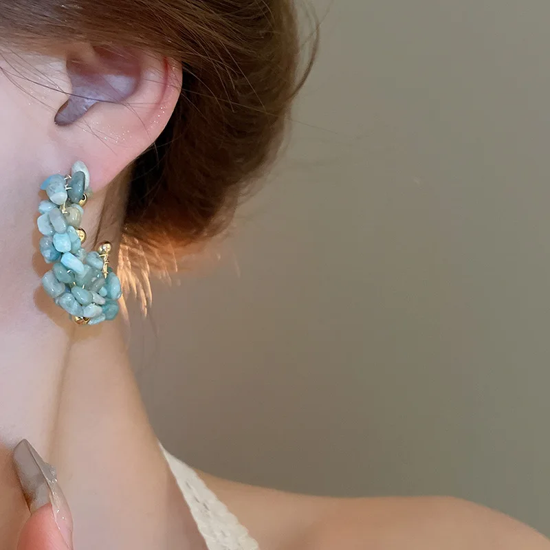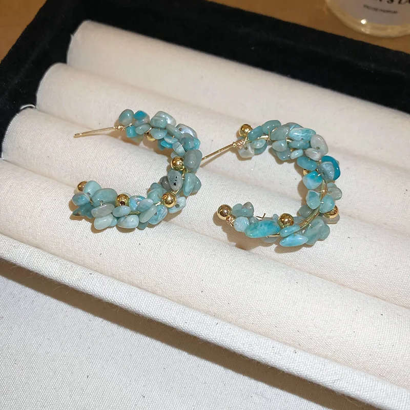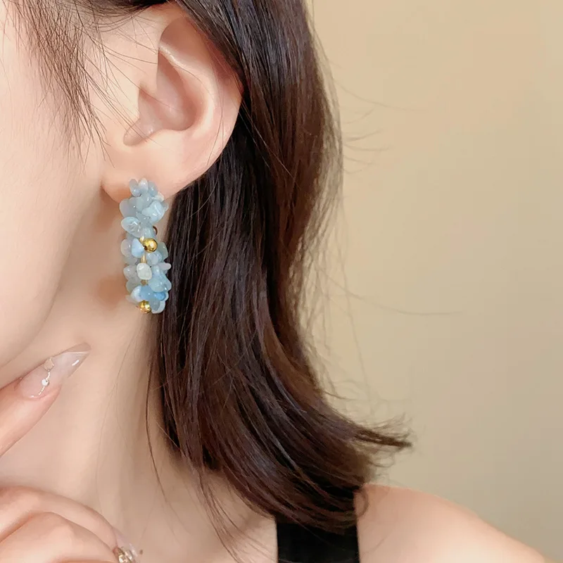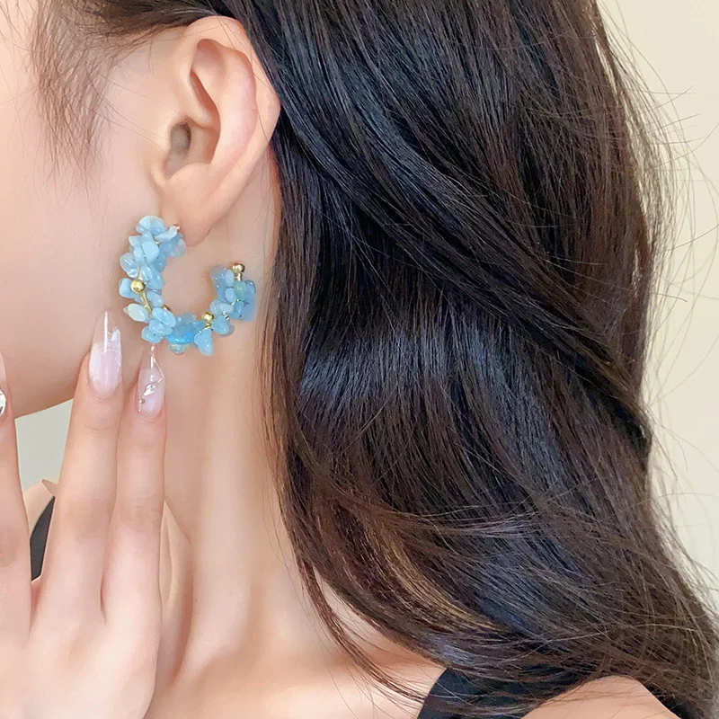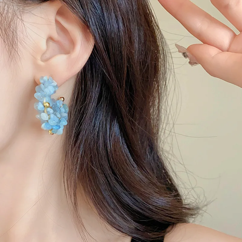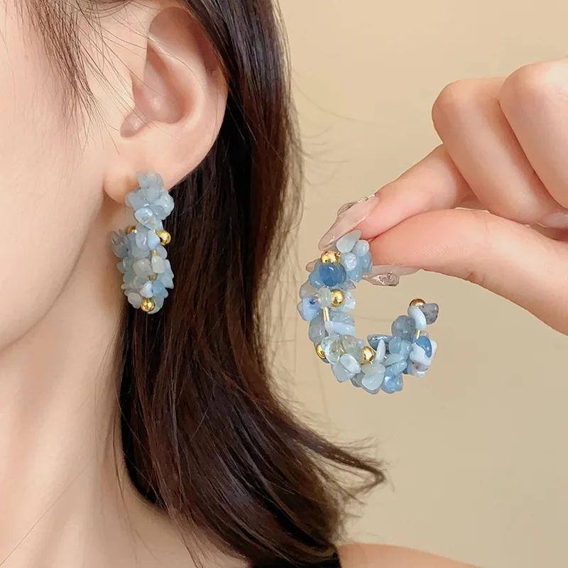 Irregular Natural Blue Crystal Beads C-Shaped Hoop Earrings