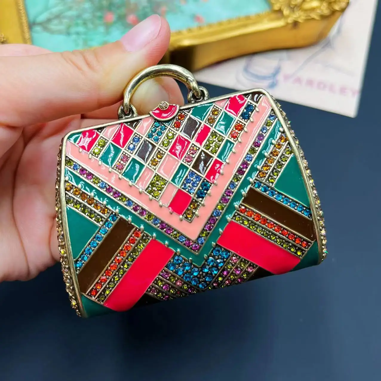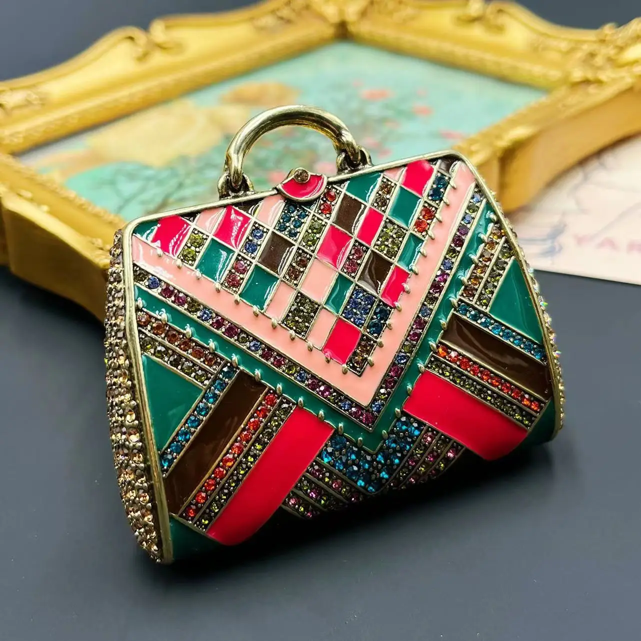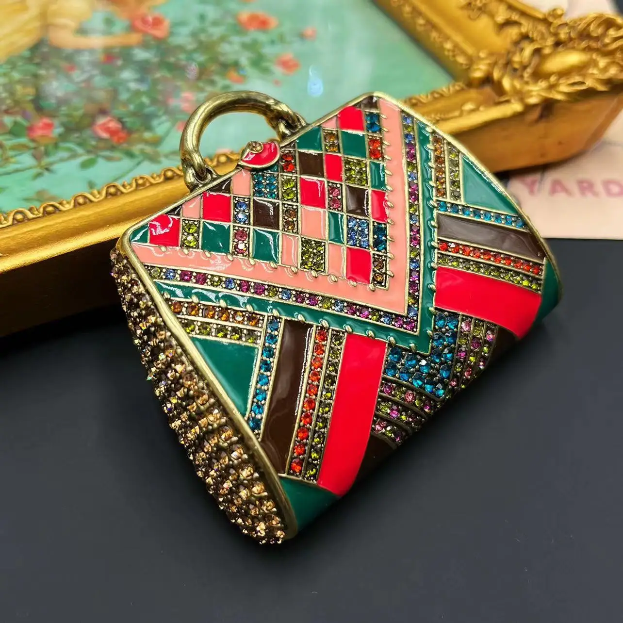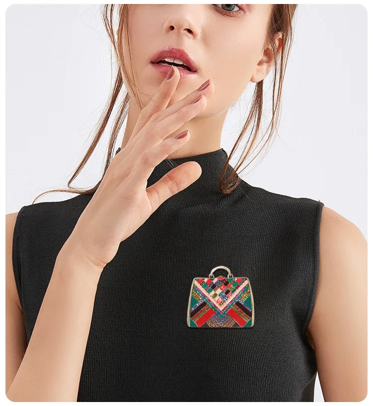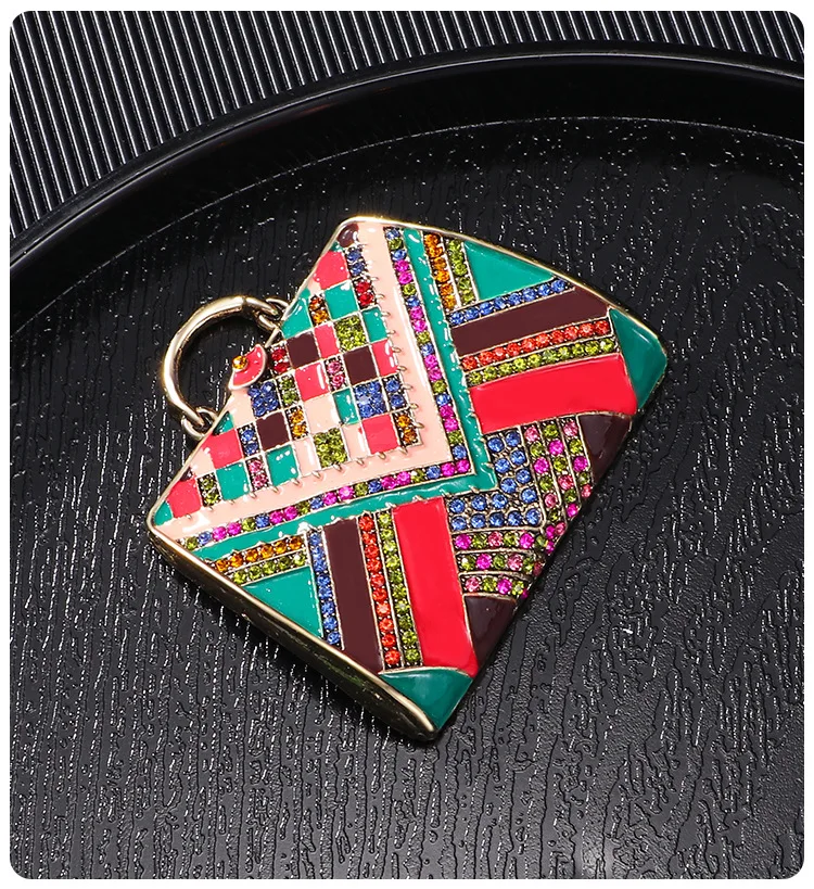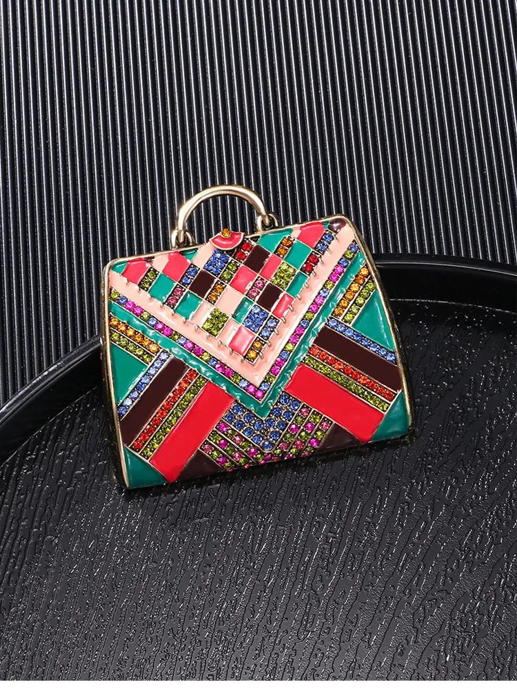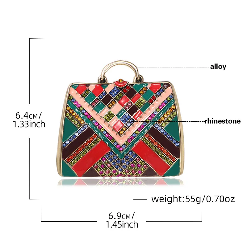 Details: Elevate your ensemble with this exquisite Luxury Rhinestone Handbag Brooch Pin. Crafted to perfection, this brooch mimics the elegance of a high-end handbag, adorned with a vibrant mosaic of multicolored enamel. Each section, outlined in shimmering rhinestones, creates a dazzling quilted effect that catches the light from every angle. The gold-tone metal handle adds a touch of sophistication, making this brooch not just an accessory, but a statement piece. Perfect for adding a splash of color and sparkle to your attire, this brooch is a must-have for those who appreciate the finer things in life. Whether pinned to a blazer, dress, or scarf, it promises to be a conversation starter and a cherished addition to your jewelry collection.