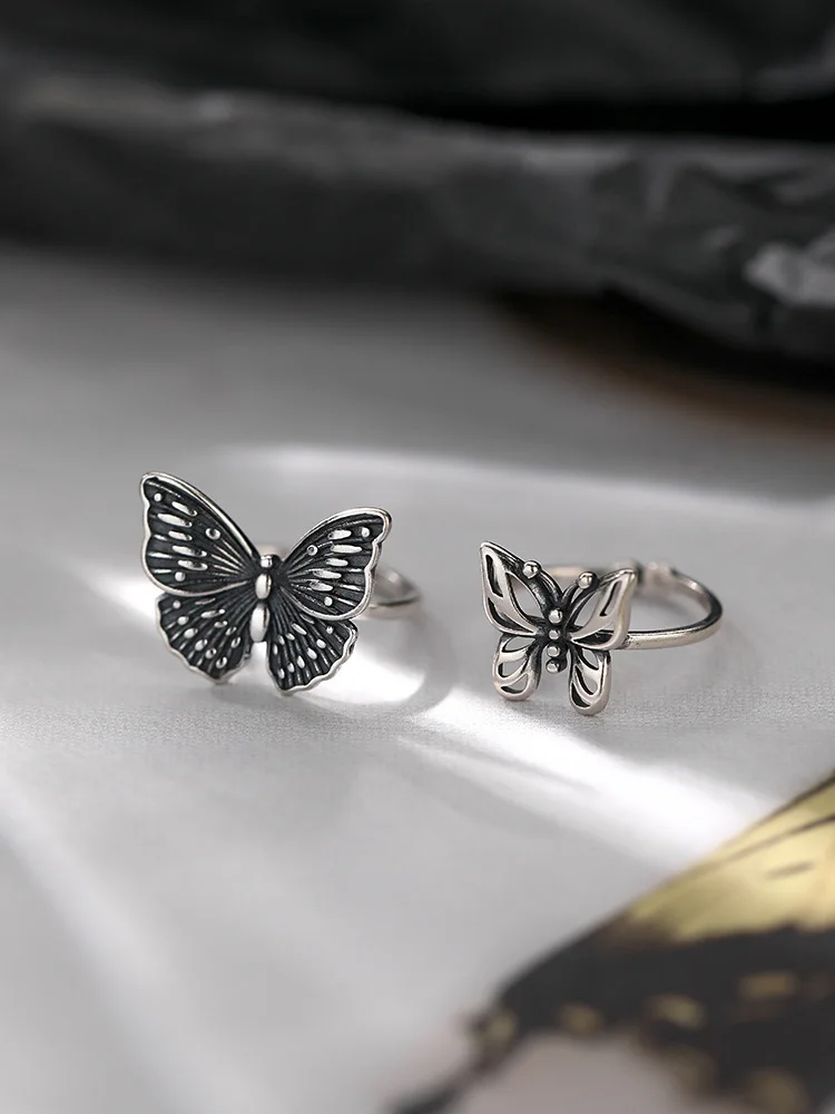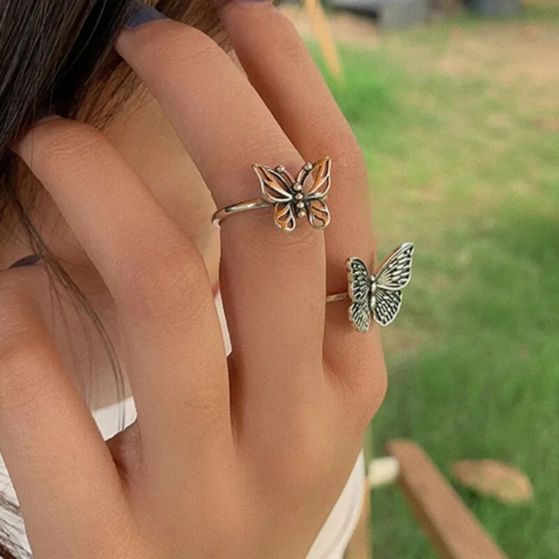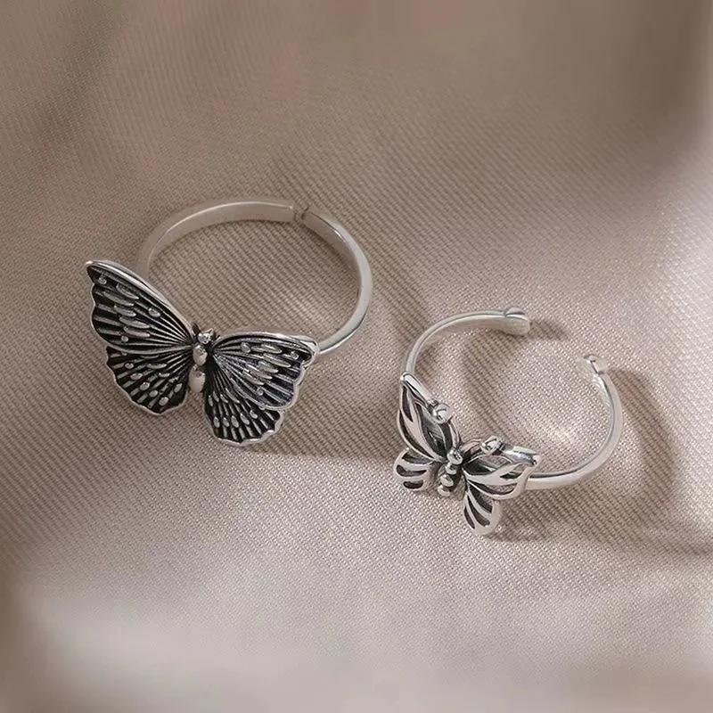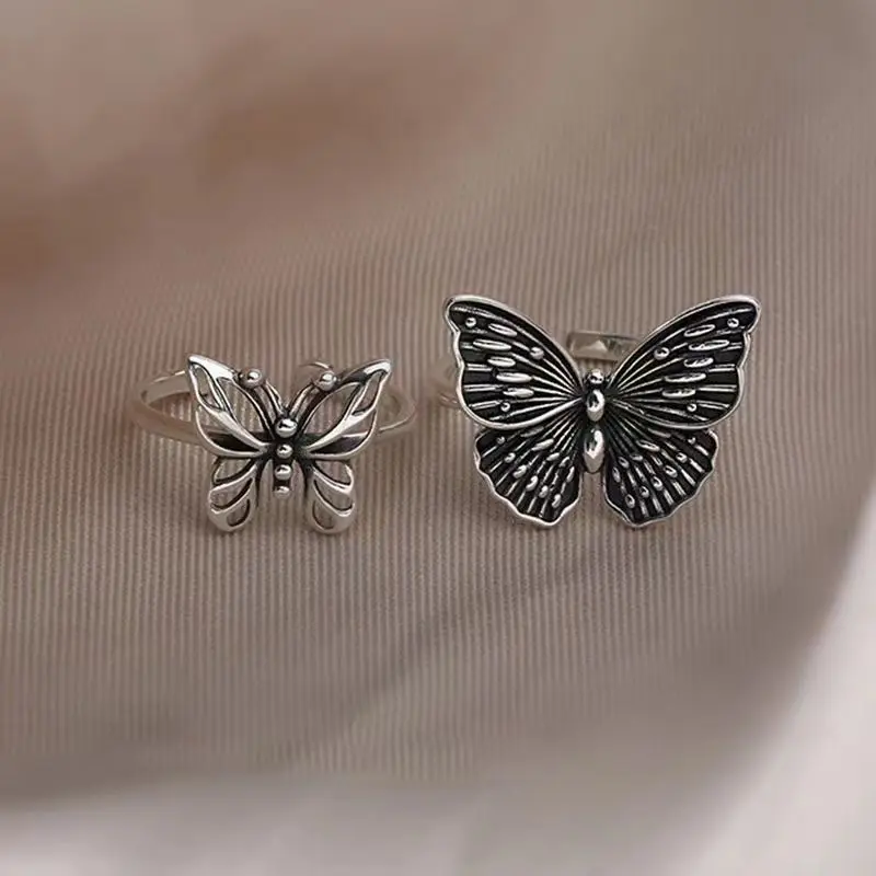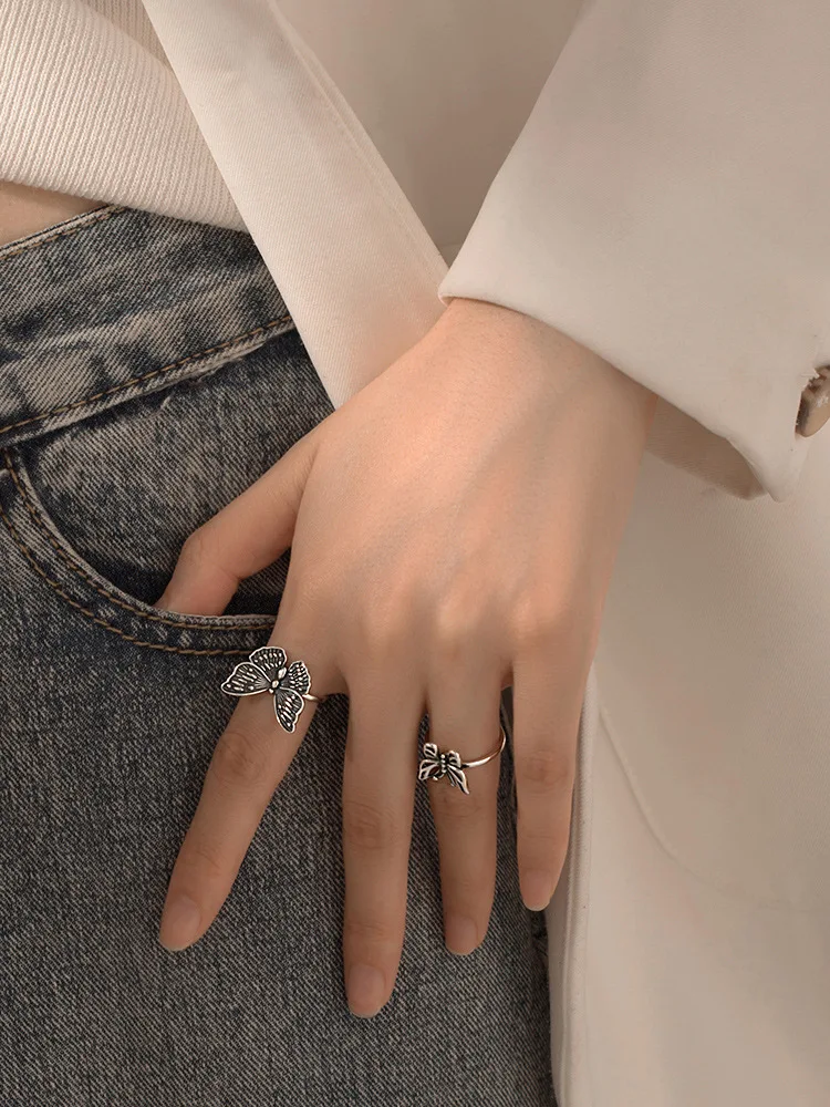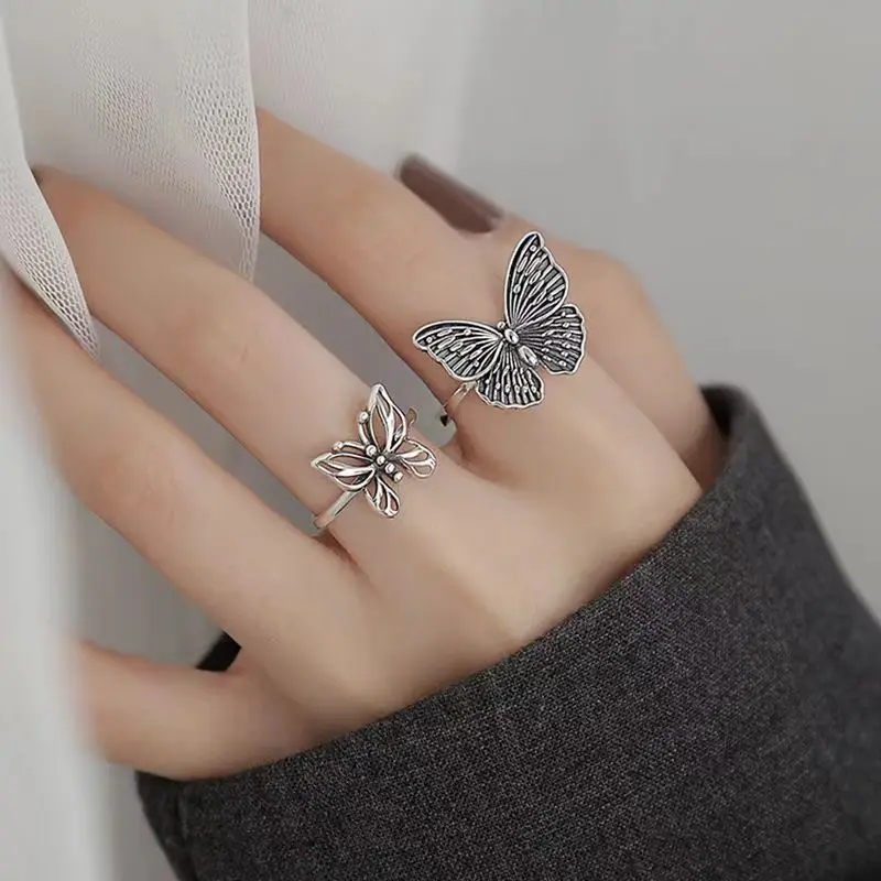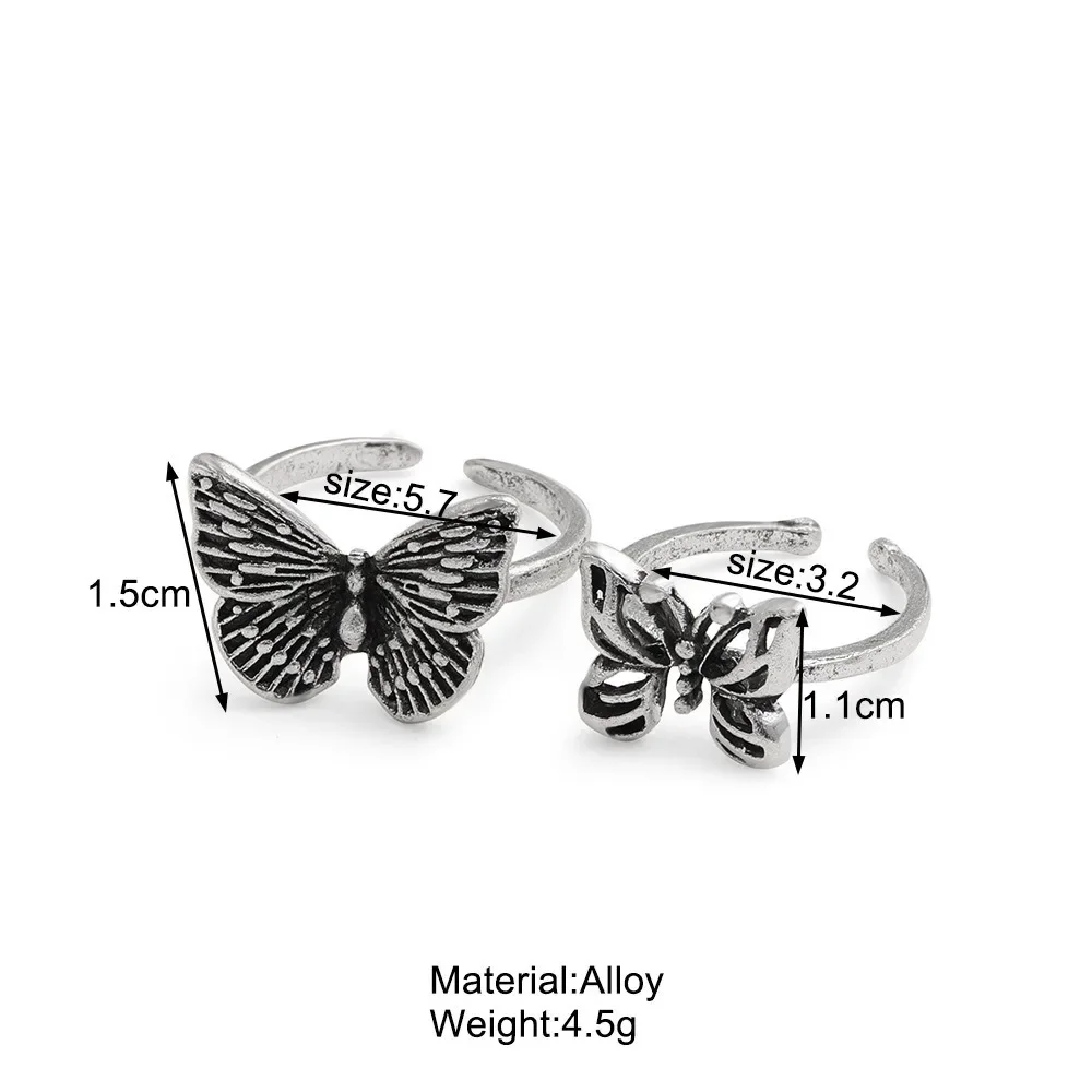 Details: Add a touch of vintage charm to your jewelry collection with these Minimalist Distressed Butterfly Open Rings. Made from durable alloy, these rings feature two unique butterfly designs. The larger butterfly boasts intricate distressed wing details that exude elegance and grace giving it a timeless appeal, while the smaller butterfly offers a more delicate and subtle understated charm yet equally captivating look. Lightweight and comfortable for everyday wear, these rings are perfect for adding a touch of whimsy and sophistication to any outfit.