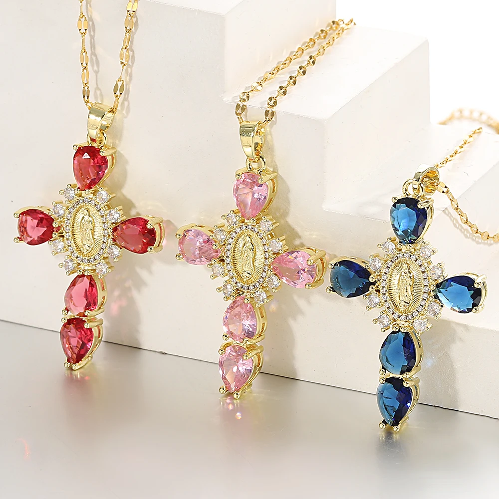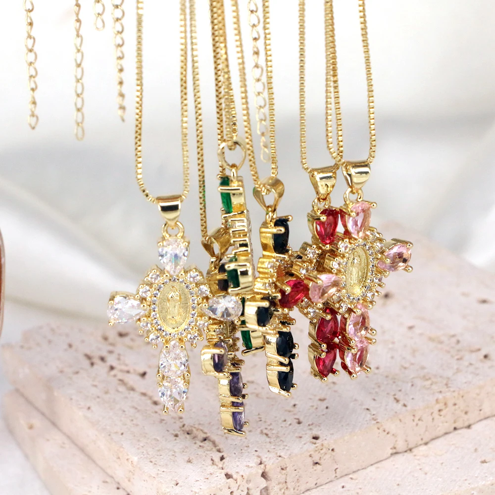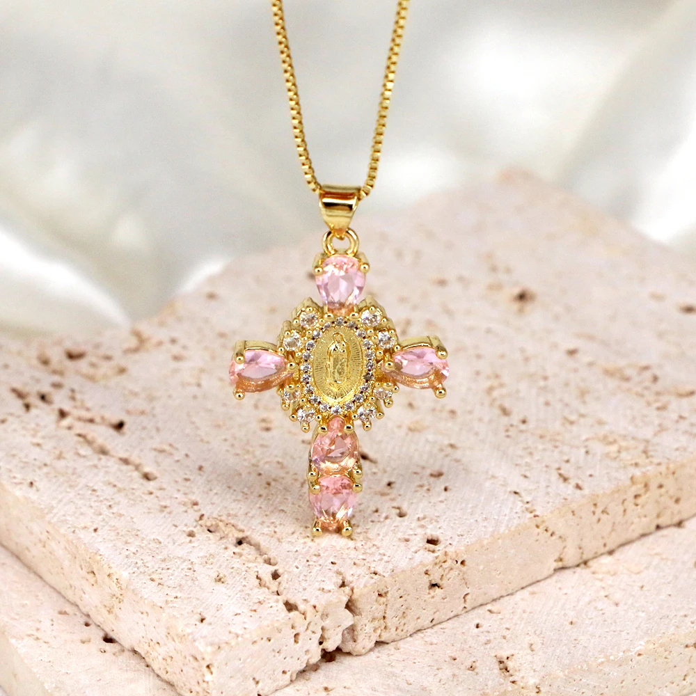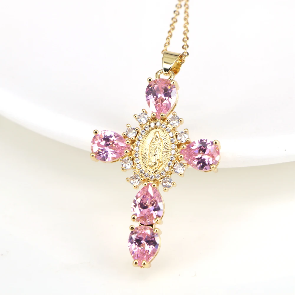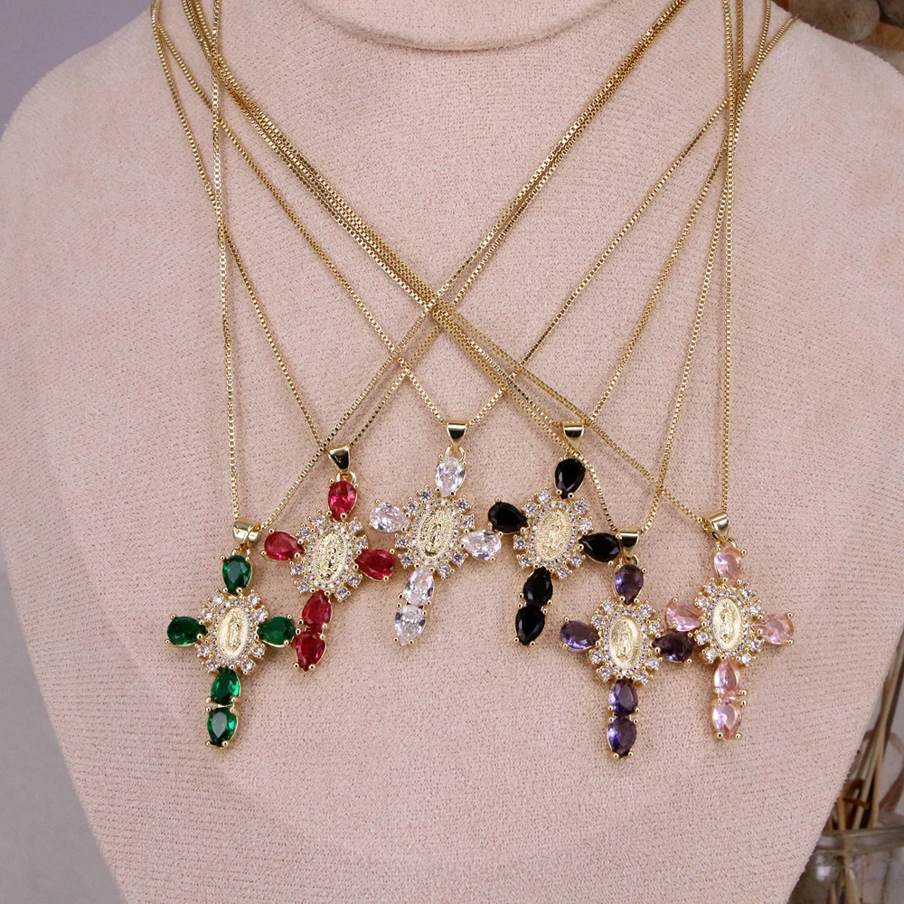 Details: Embrace faith and elegance with these exquisite pendant necklaces, each adorned with sparkling cubic zirconia gemstones. These necklaces pay homage to Our Lady of the Cross, and the Virgin Mary, combining spiritual symbolism with timeless beauty. Small pristine white cubic zirconia gemstones encircle and create a halo around the central gold-tone Virgin Mary portrait, complemented by eight medium-sized white cubic zirconia gemstones further signifying purity and devotion. Lastly, the five large pink, red, white, green, or black cubic zirconia formed a cross-shape adding an ethereal touch. Whether for yourself or a loved one, these necklaces carry spiritual significance and fashionable allure.