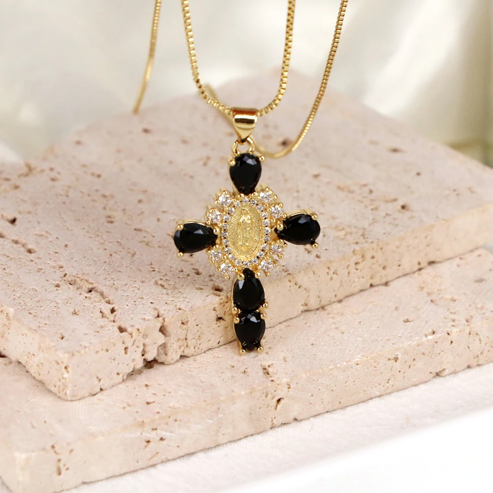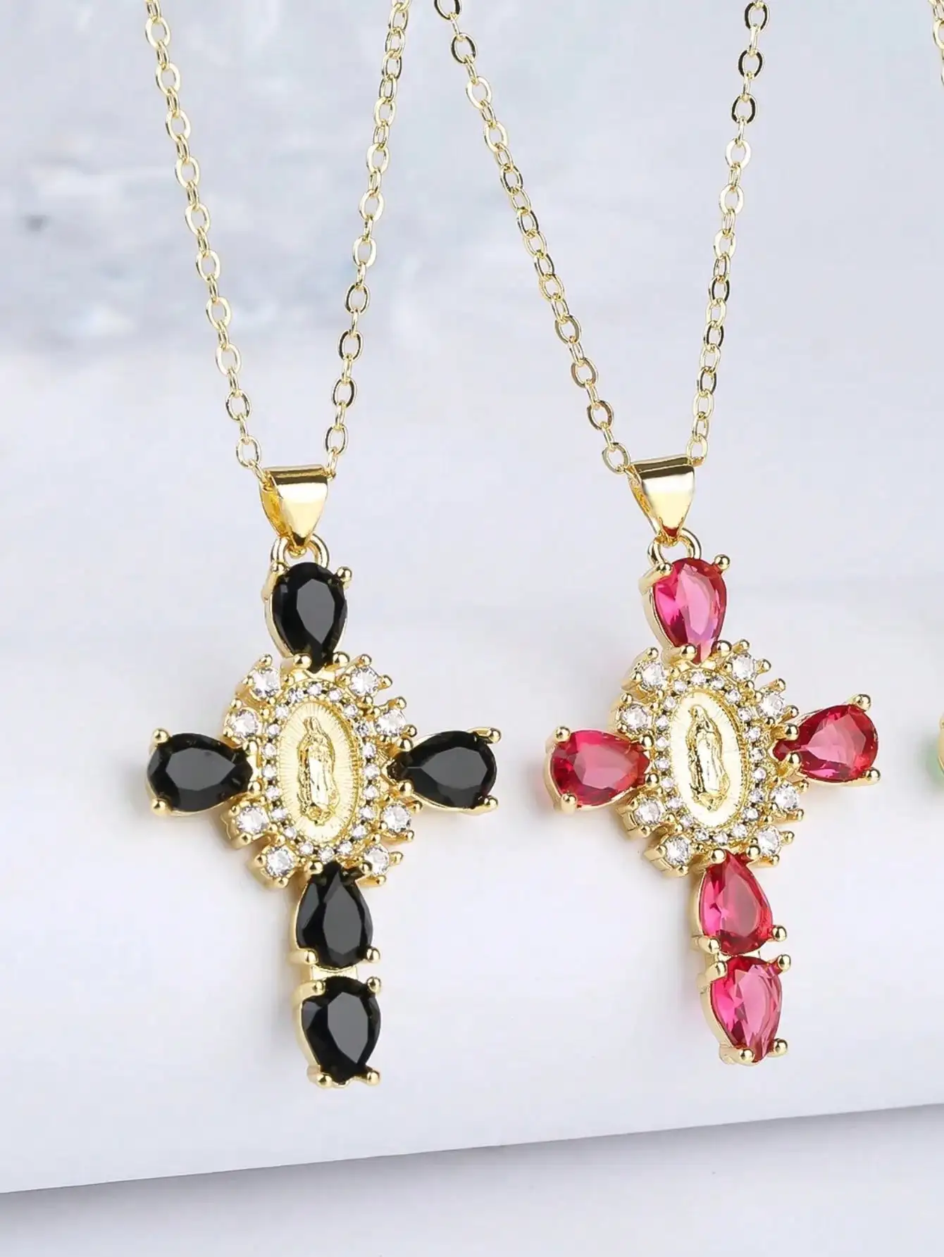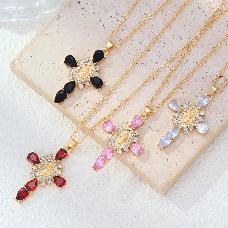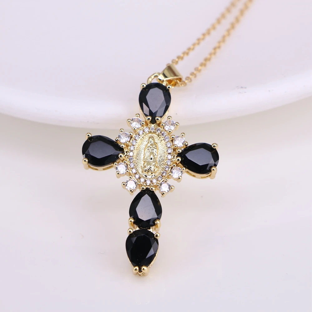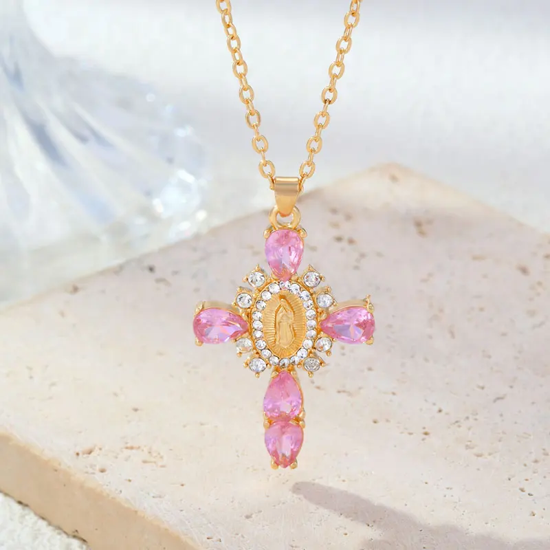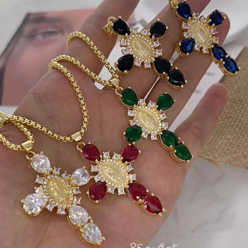 Details: Embrace faith and elegance with these exquisite pendant necklaces, each adorned with sparkling cubic zirconia gemstones. These necklaces pay homage to Our Lady of the Cross, and the Virgin Mary, combining spiritual symbolism with timeless beauty. Small pristine white cubic zirconia gemstones encircle and create a halo around the central gold-tone Virgin Mary portrait, complemented by eight medium-sized white cubic zirconia gemstones further signifying purity and devotion. Lastly, the five large pink, red, white, green, or black cubic zirconia formed a cross-shape adding an ethereal touch. Whether for yourself or a loved one, these necklaces carry spiritual significance and fashionable allure.