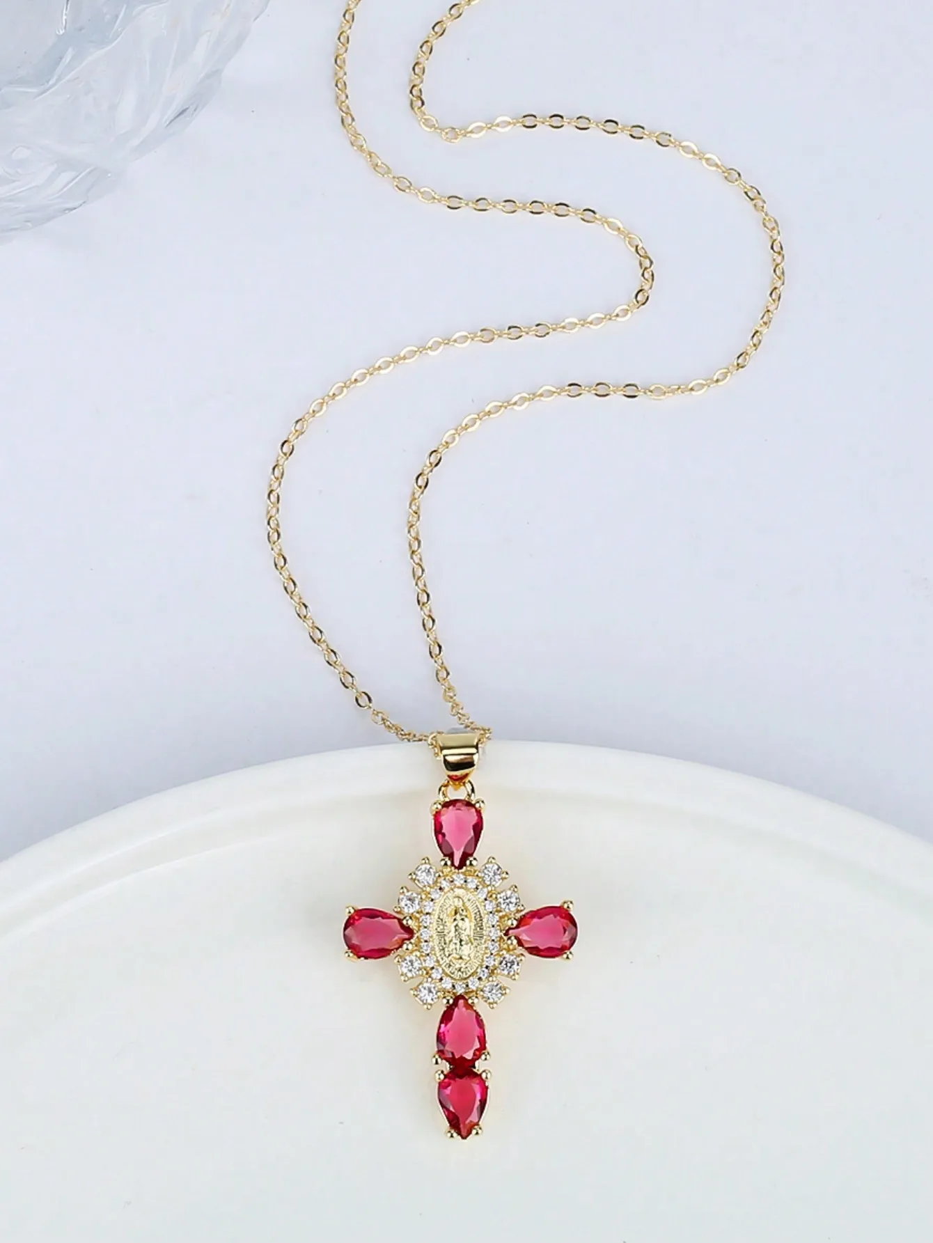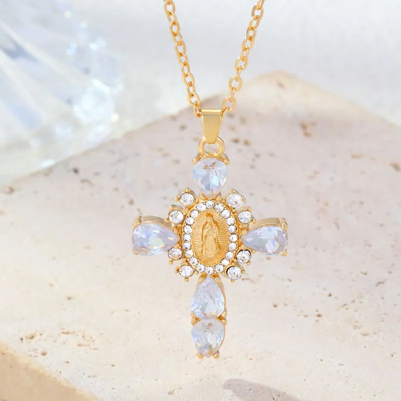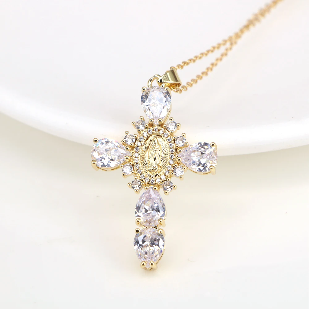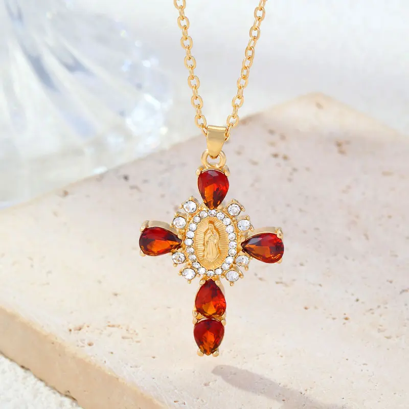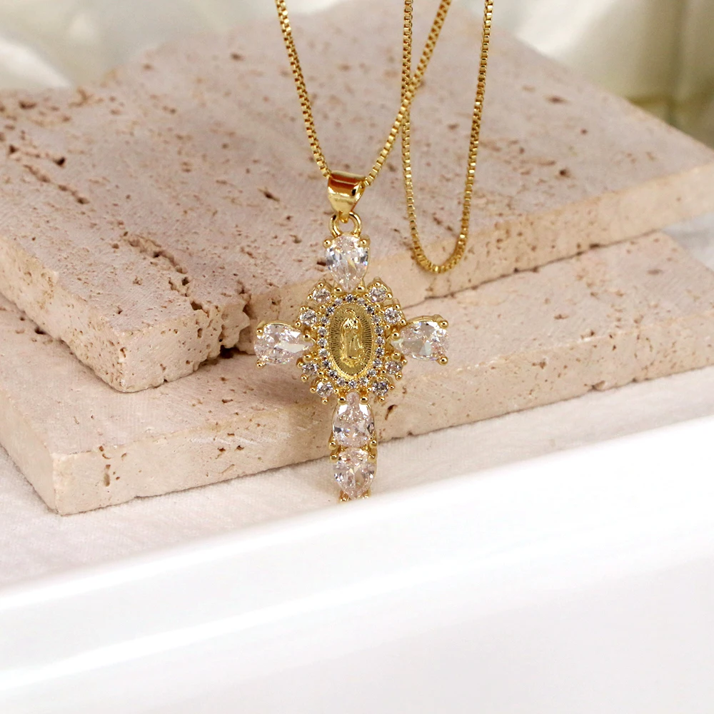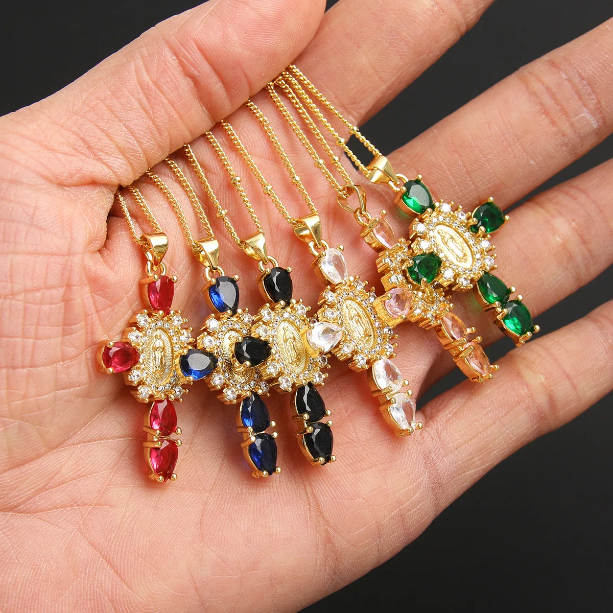Details: Embrace faith and elegance with these exquisite pendant necklaces, each adorned with sparkling cubic zirconia gemstones. These necklaces pay homage to Our Lady of the Cross, and the Virgin Mary, combining spiritual symbolism with timeless beauty. Small pristine white cubic zirconia gemstones encircle and create a halo around the central gold-tone Virgin Mary portrait, complemented by eight medium-sized white cubic zirconia gemstones further signifying purity and devotion. Lastly, the five large pink, red, white, green, or black cubic zirconia formed a cross-shape adding an ethereal touch. Whether for yourself or a loved one, these necklaces carry spiritual significance and fashionable allure.