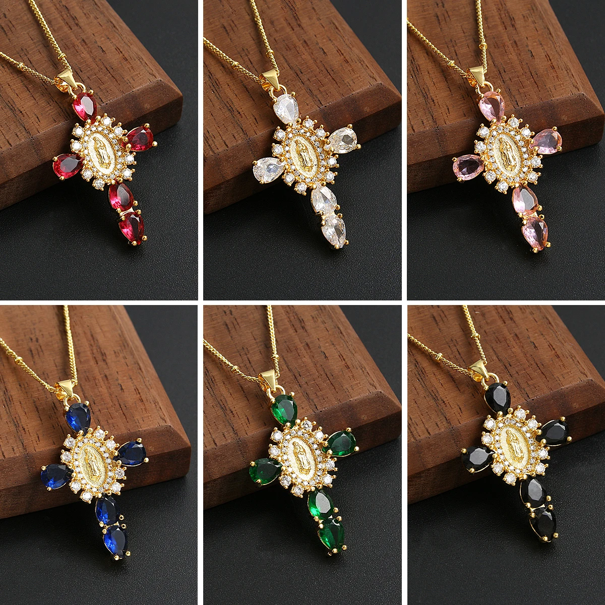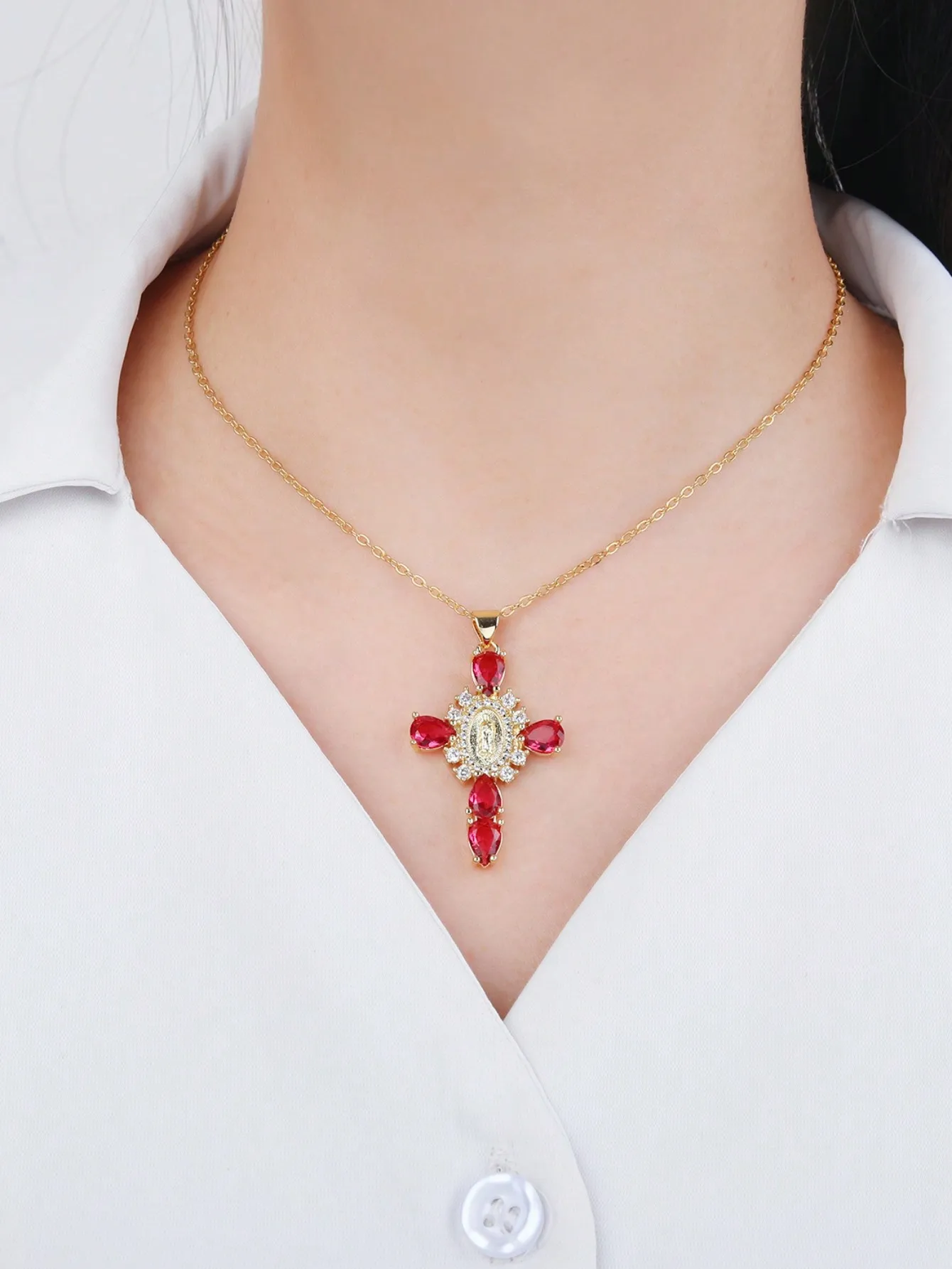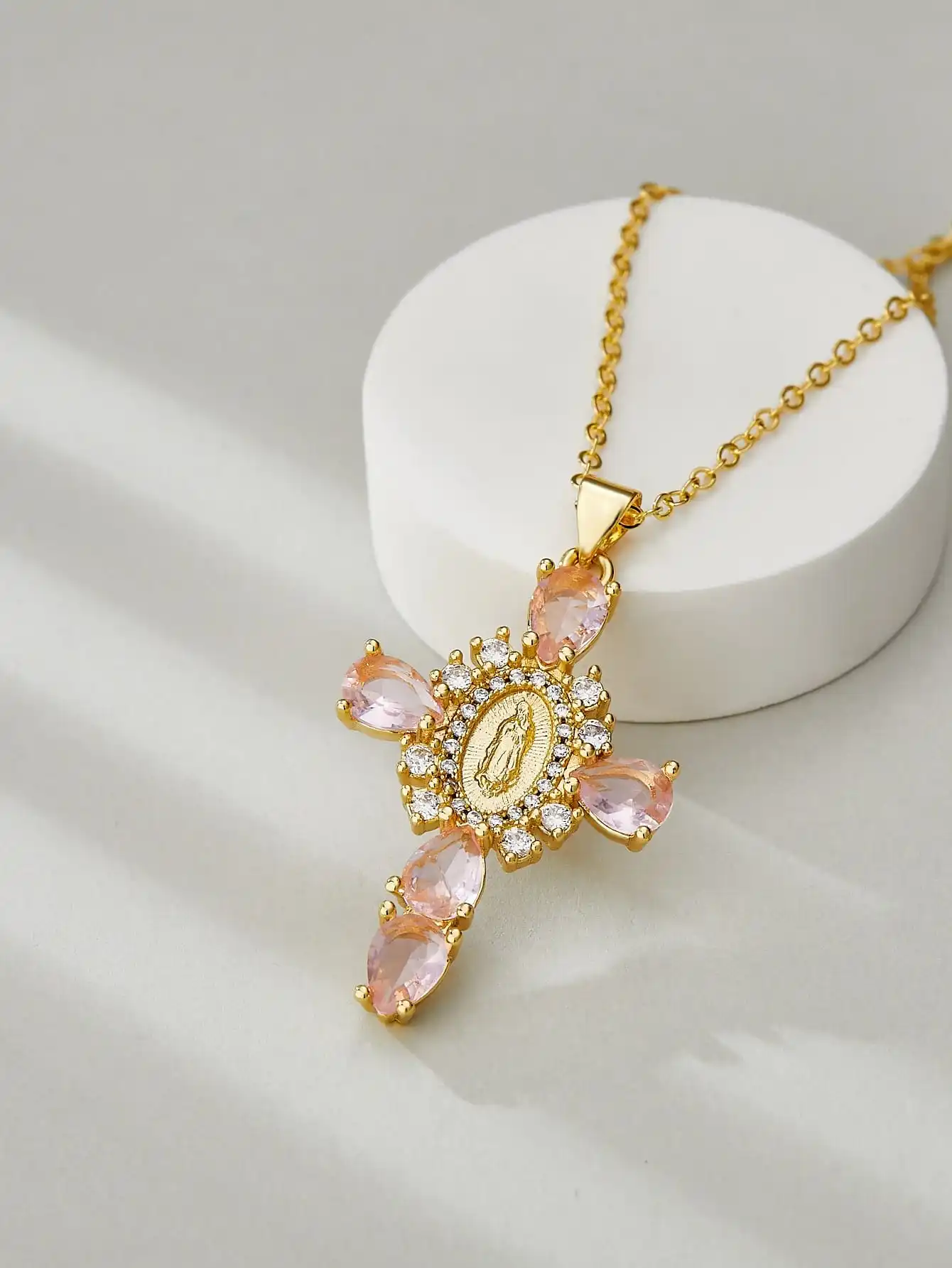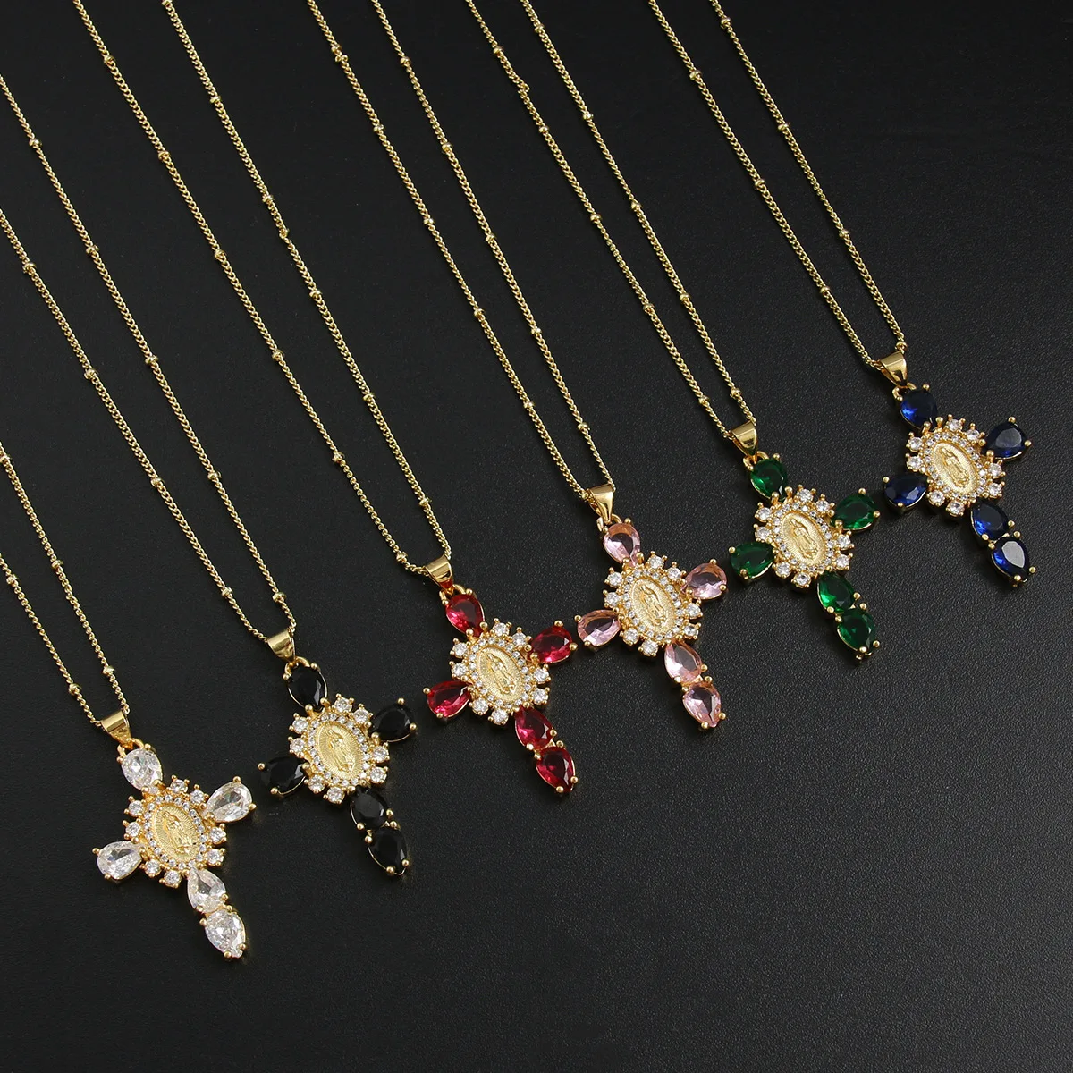 Details: Embrace faith and elegance with these exquisite pendant necklaces, each adorned with sparkling cubic zirconia gemstones. These necklaces pay homage to Our Lady of the Cross, and the Virgin Mary, combining spiritual symbolism with timeless beauty. Small pristine white cubic zirconia gemstones encircle and create a halo around the central gold-tone Virgin Mary portrait, complemented by eight medium-sized white cubic zirconia gemstones further signifying purity and devotion. Lastly, the five large pink, red, white, green, or black cubic zirconia formed a cross-shape adding an ethereal touch. Whether for yourself or a loved one, these necklaces carry spiritual significance and fashionable allure.