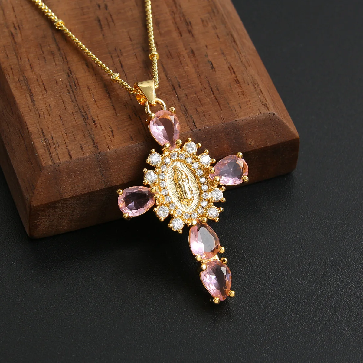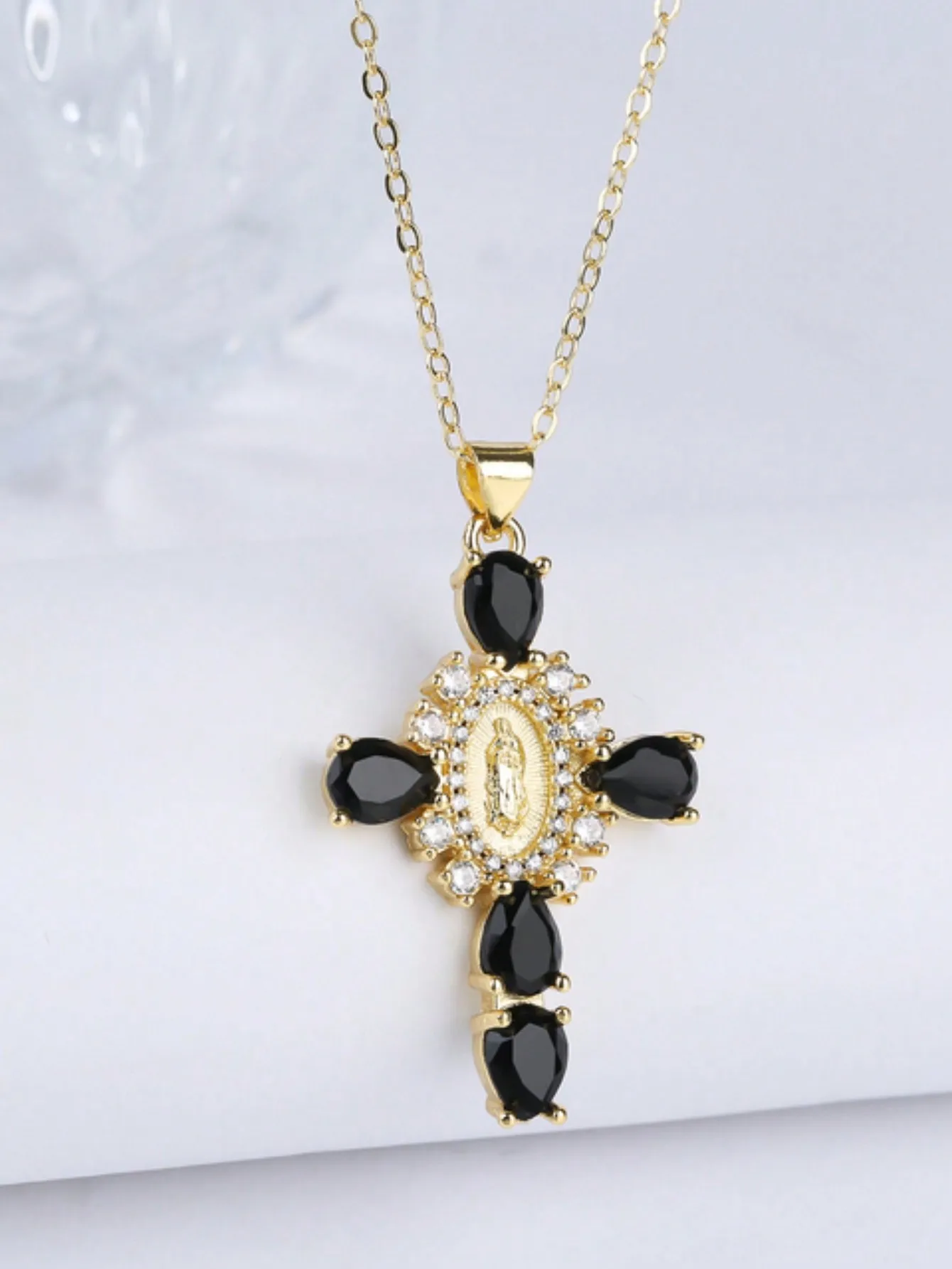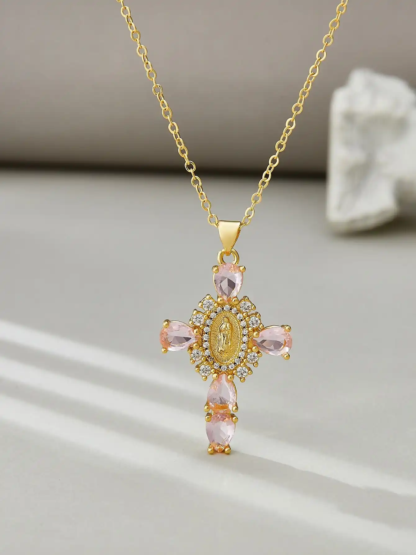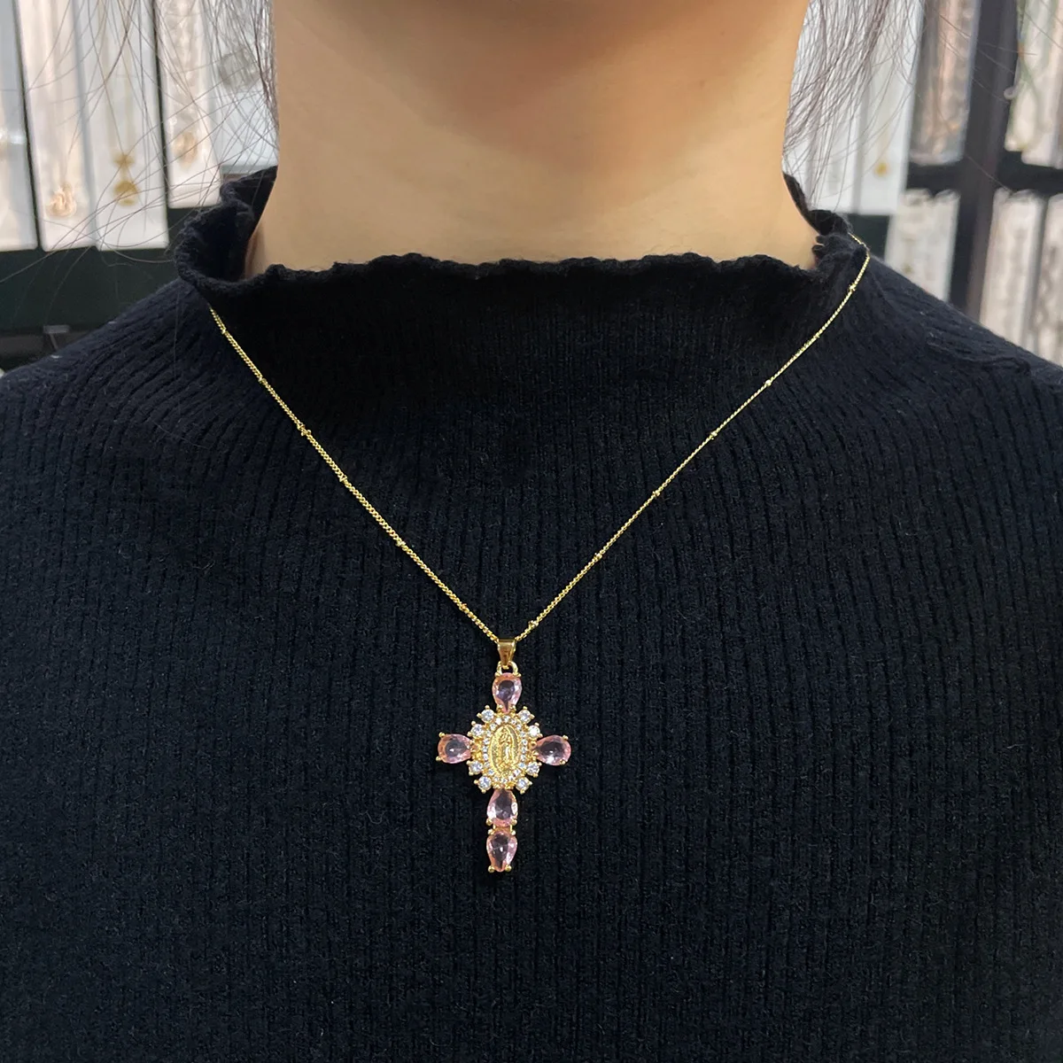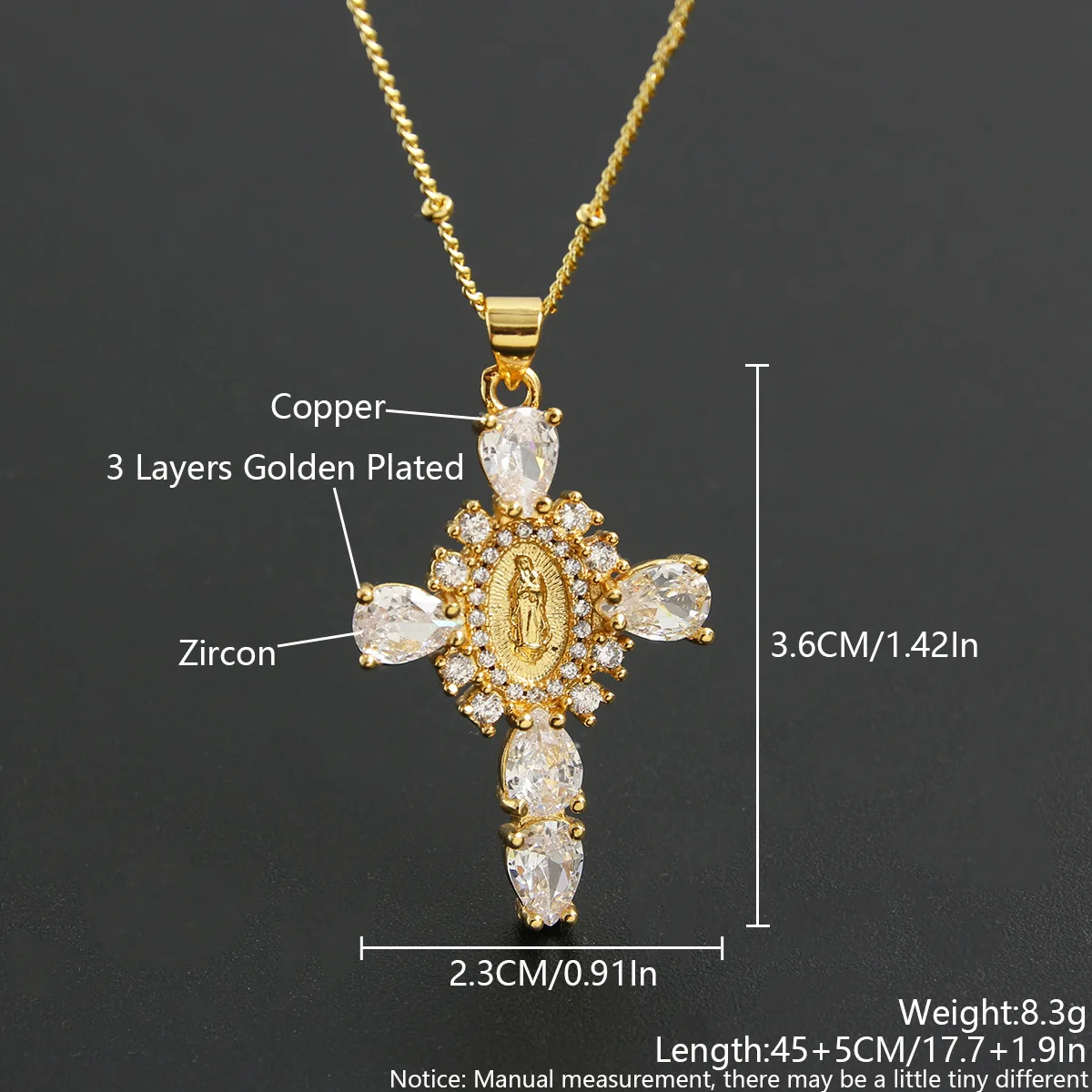 Details: Embrace faith and elegance with these exquisite pendant necklaces, each adorned with sparkling cubic zirconia gemstones. These necklaces pay homage to Our Lady of the Cross, and the Virgin Mary, combining spiritual symbolism with timeless beauty. Small pristine white cubic zirconia gemstones encircle and create a halo around the central gold-tone Virgin Mary portrait, complemented by eight medium-sized white cubic zirconia gemstones further signifying purity and devotion. Lastly, the five large pink, red, white, green, or black cubic zirconia formed a cross-shape adding an ethereal touch. Whether for yourself or a loved one, these necklaces carry spiritual significance and fashionable allure.