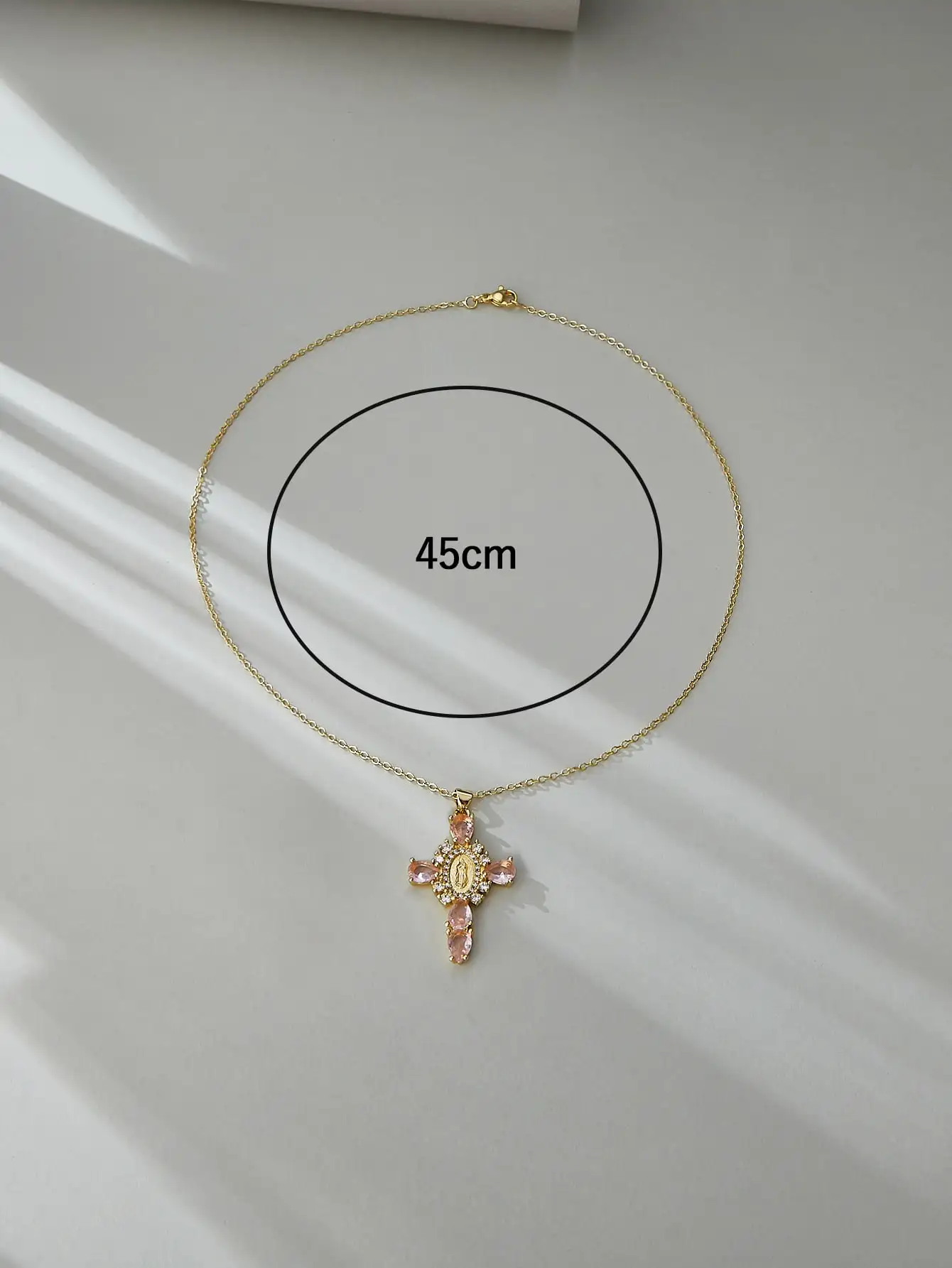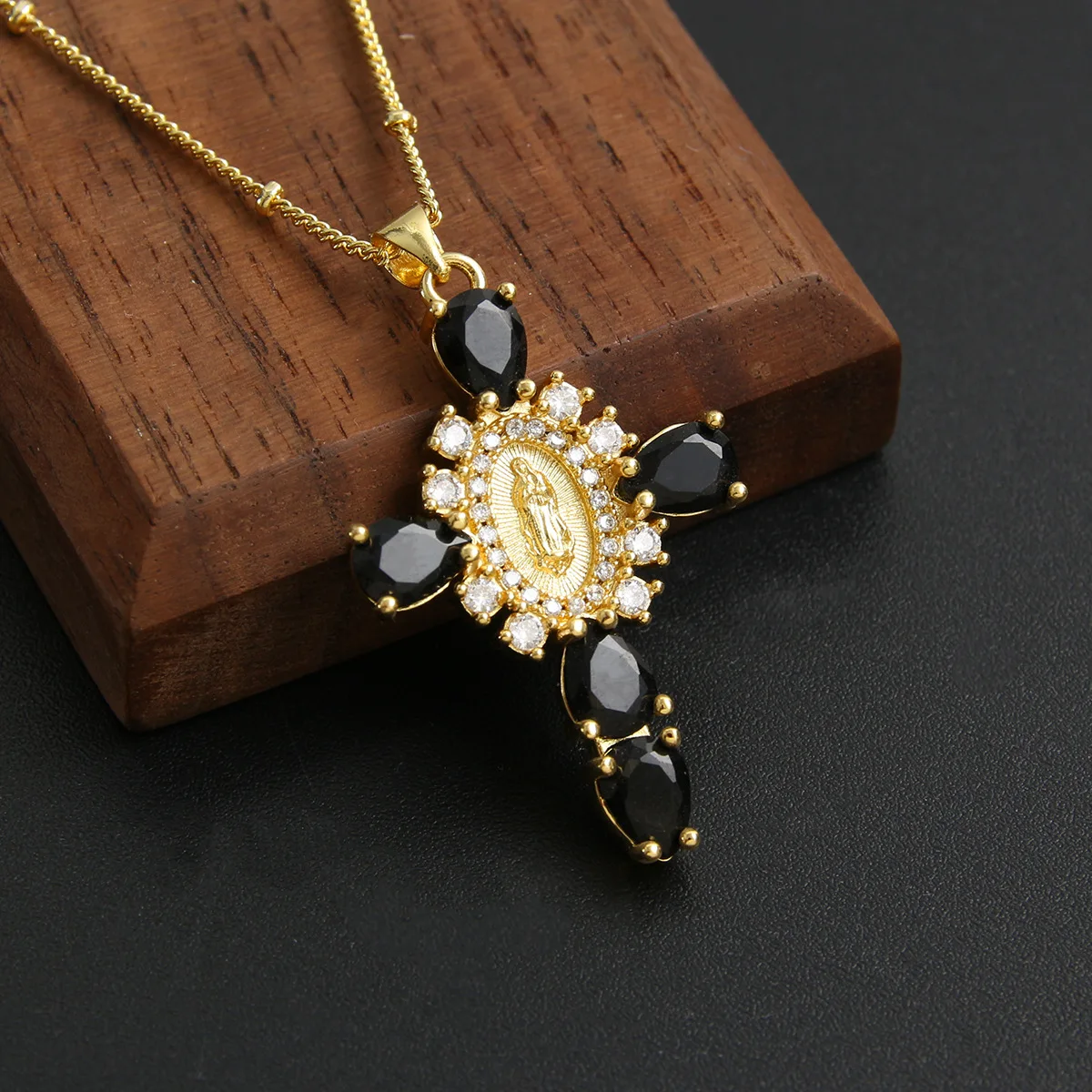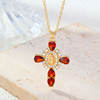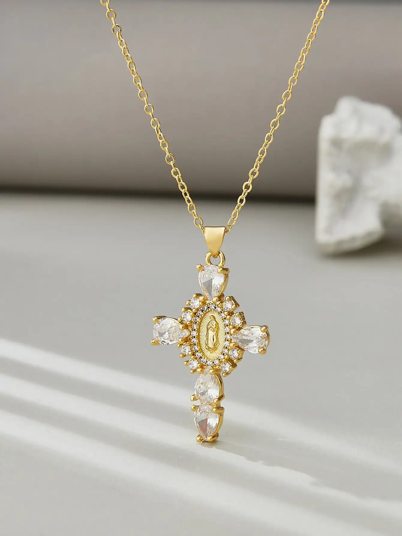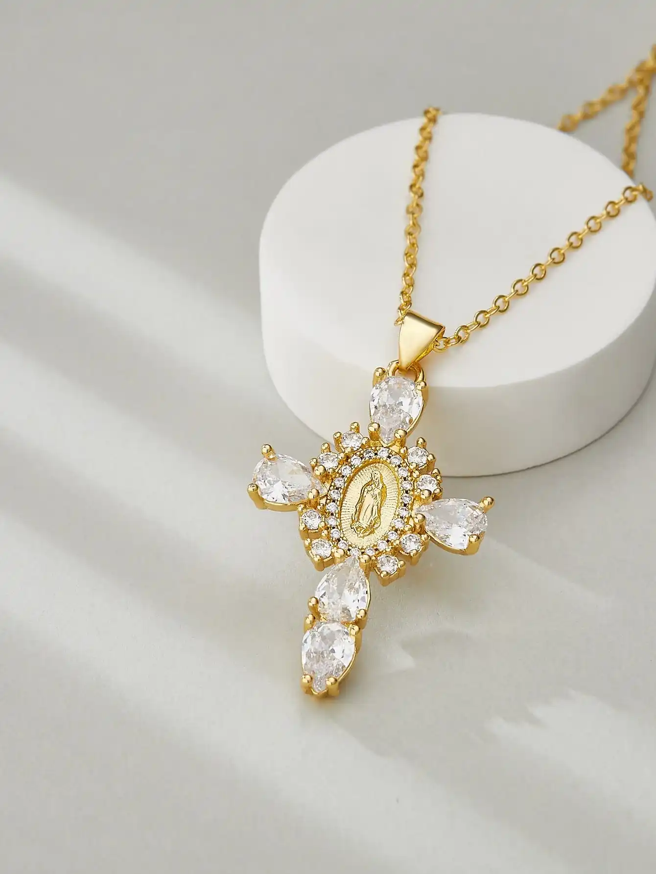 Details: Embrace faith and elegance with these exquisite pendant necklaces, each adorned with sparkling cubic zirconia gemstones. These necklaces pay homage to Our Lady of the Cross, and the Virgin Mary, combining spiritual symbolism with timeless beauty. Small pristine white cubic zirconia gemstones encircle and create a halo around the central gold-tone Virgin Mary portrait, complemented by eight medium-sized white cubic zirconia gemstones further signifying purity and devotion. Lastly, the five large pink, red, white, green, or black cubic zirconia formed a cross-shape adding an ethereal touch. Whether for yourself or a loved one, these necklaces carry spiritual significance and fashionable allure.