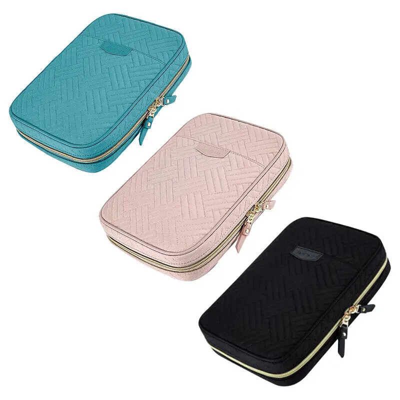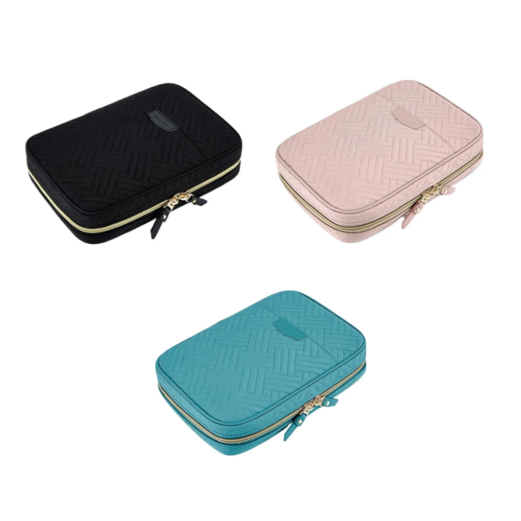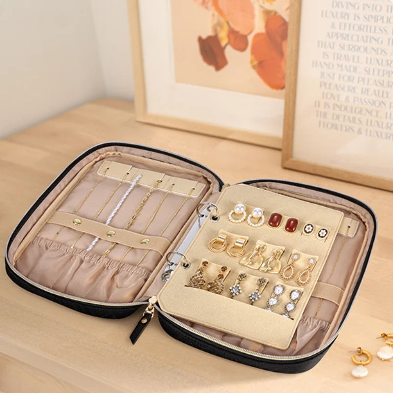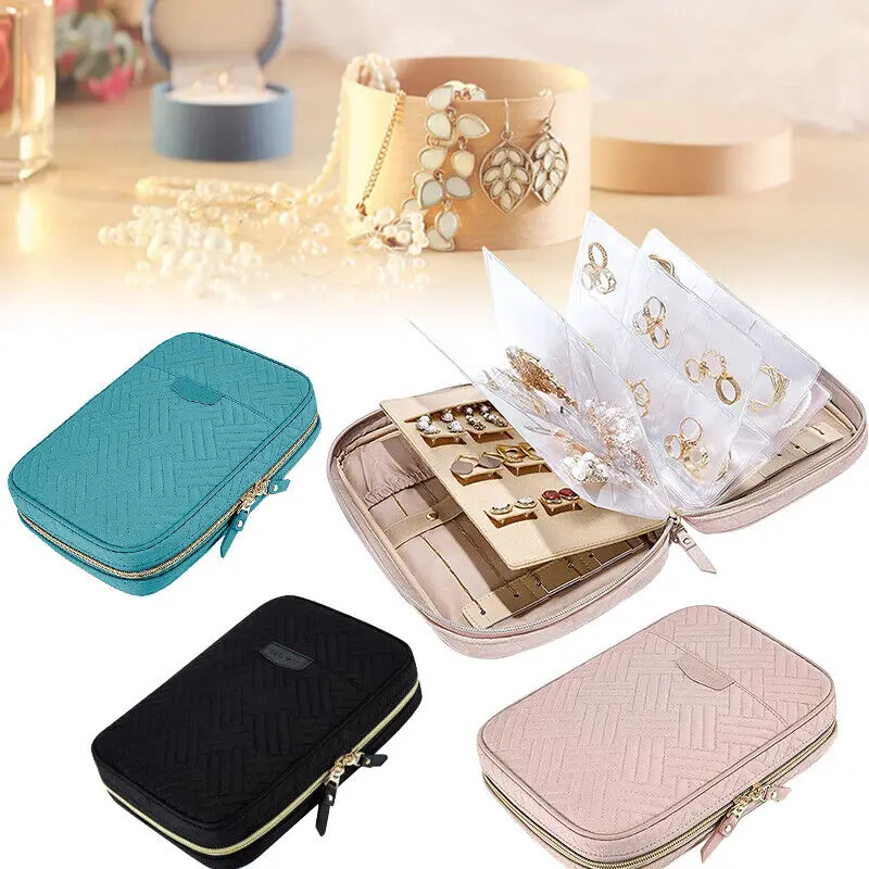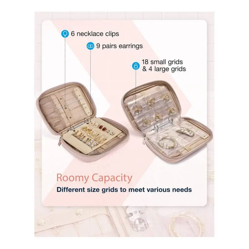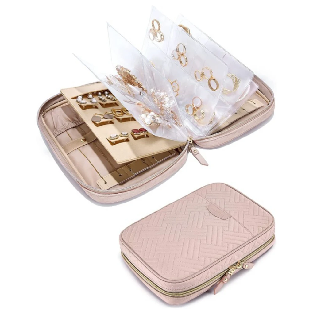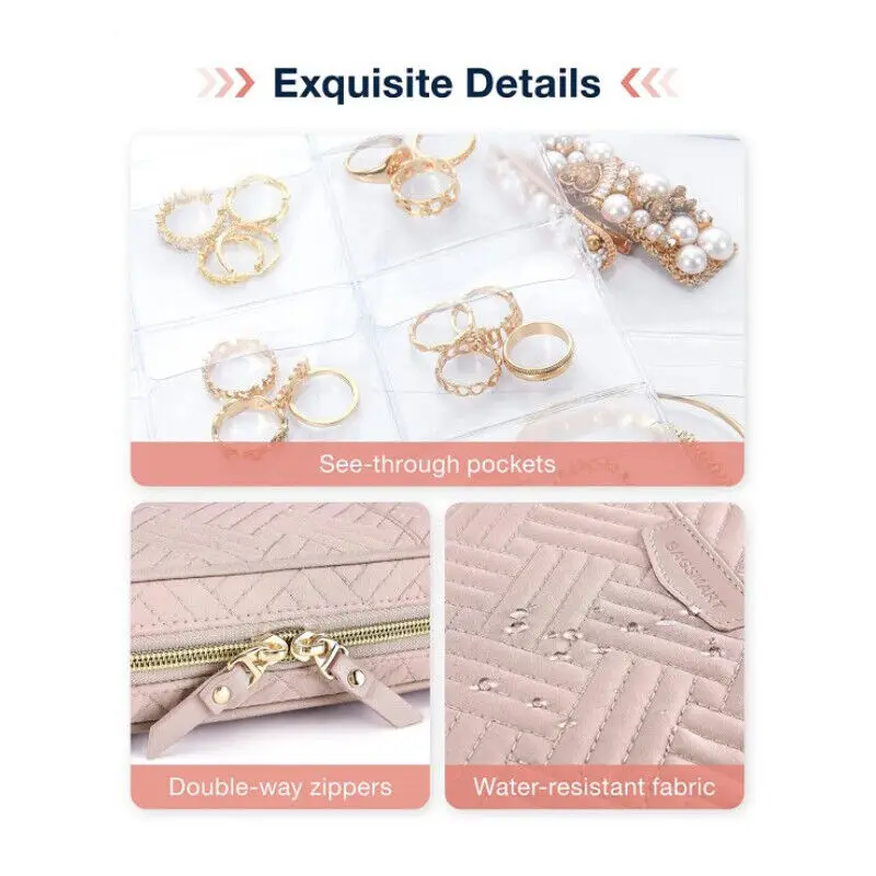 Great for compact storage - you can fit (overstuff) a lot of rope necklaces and bracelets. The plastic sleeve compartments do not accommodate chunky items well and are prone to falling out of the compartment because they lack secure closure — so, if you fill it with chunky earrings, pins, cuff links, etc. , only open the case when it is lying on a flat surface. The zipper works well and the material is sturdy.