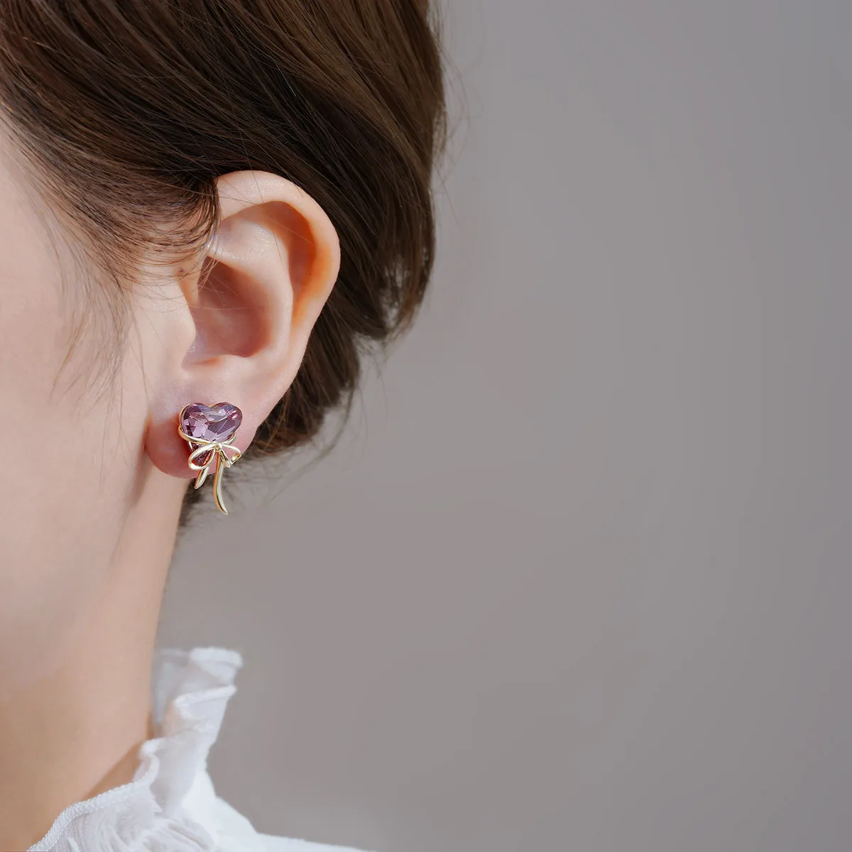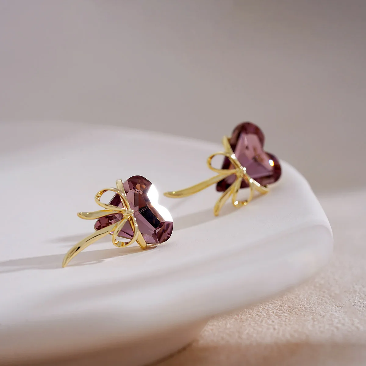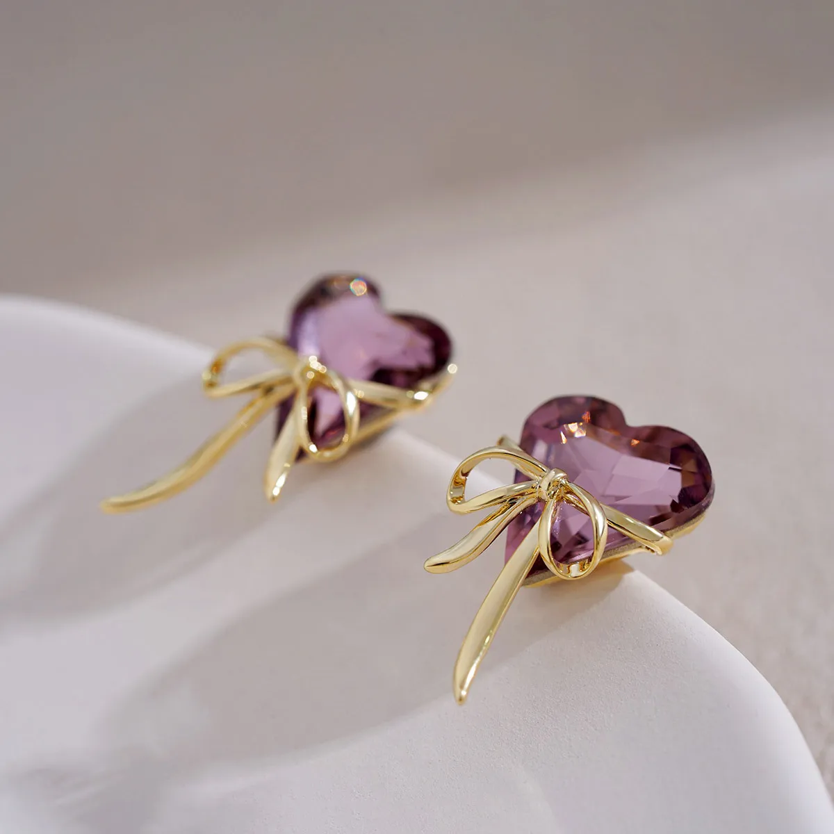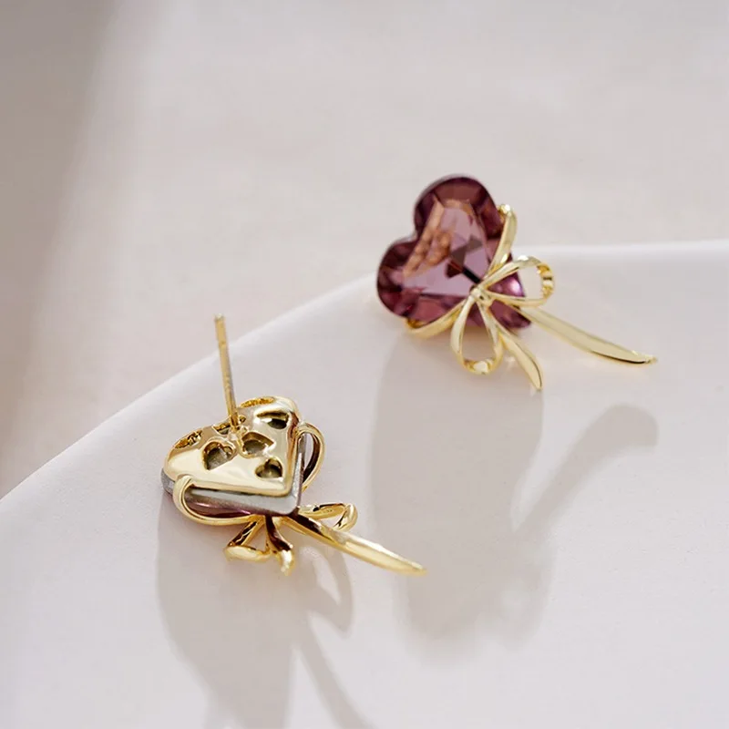 Details: Celebrate love and elegance with these Purple Love Heart Shaped Bowknot Ribbon Stud Earrings. Each earring features a stunning heart-shaped purple cubic zirconia, symbolizing romance and passion. The heart is beautifully complemented by a delicate bowknot ribbon design in a luxurious gold-tone metal, adding a playful yet sophisticated touch. The vibrant purple hue of the cubic zirconia exudes a regal charm, while the gold-tone bowknot adds a timeless elegance. These earrings are perfect for those who adore whimsical and charming accessories. Embrace the enchanting blend of love and style with these exquisite stud earrings, and let them become a cherished part of your jewelry collection.