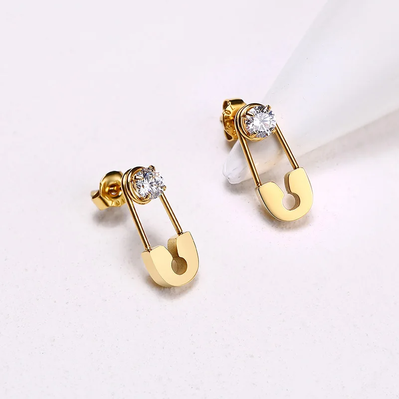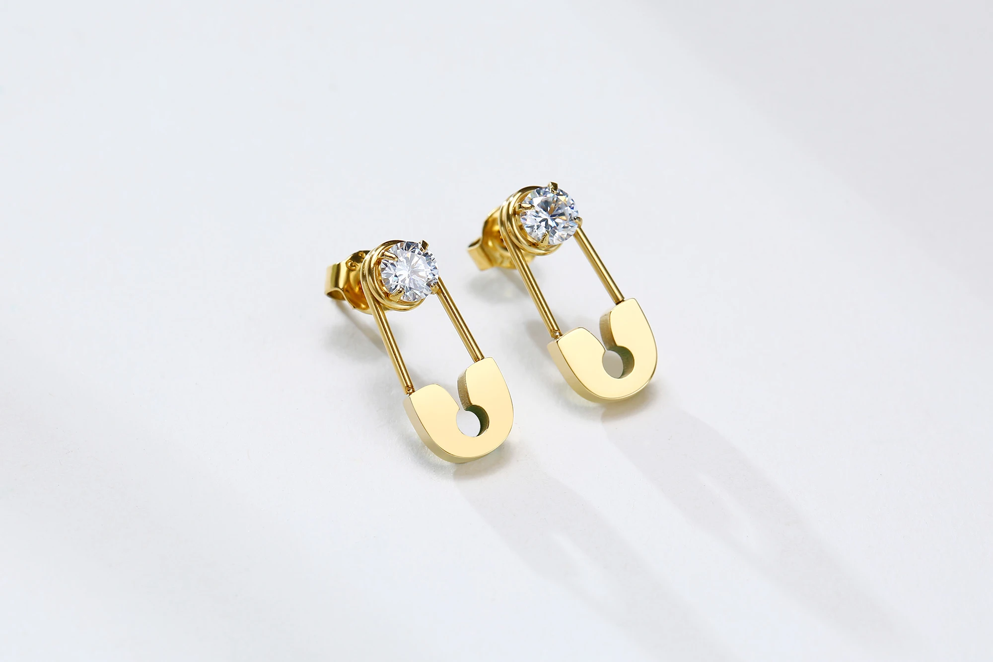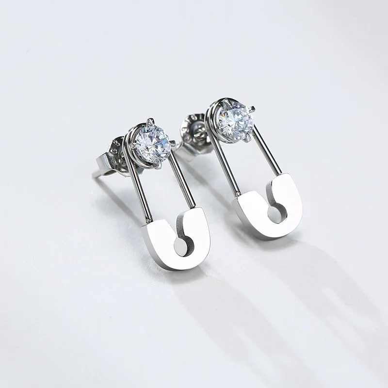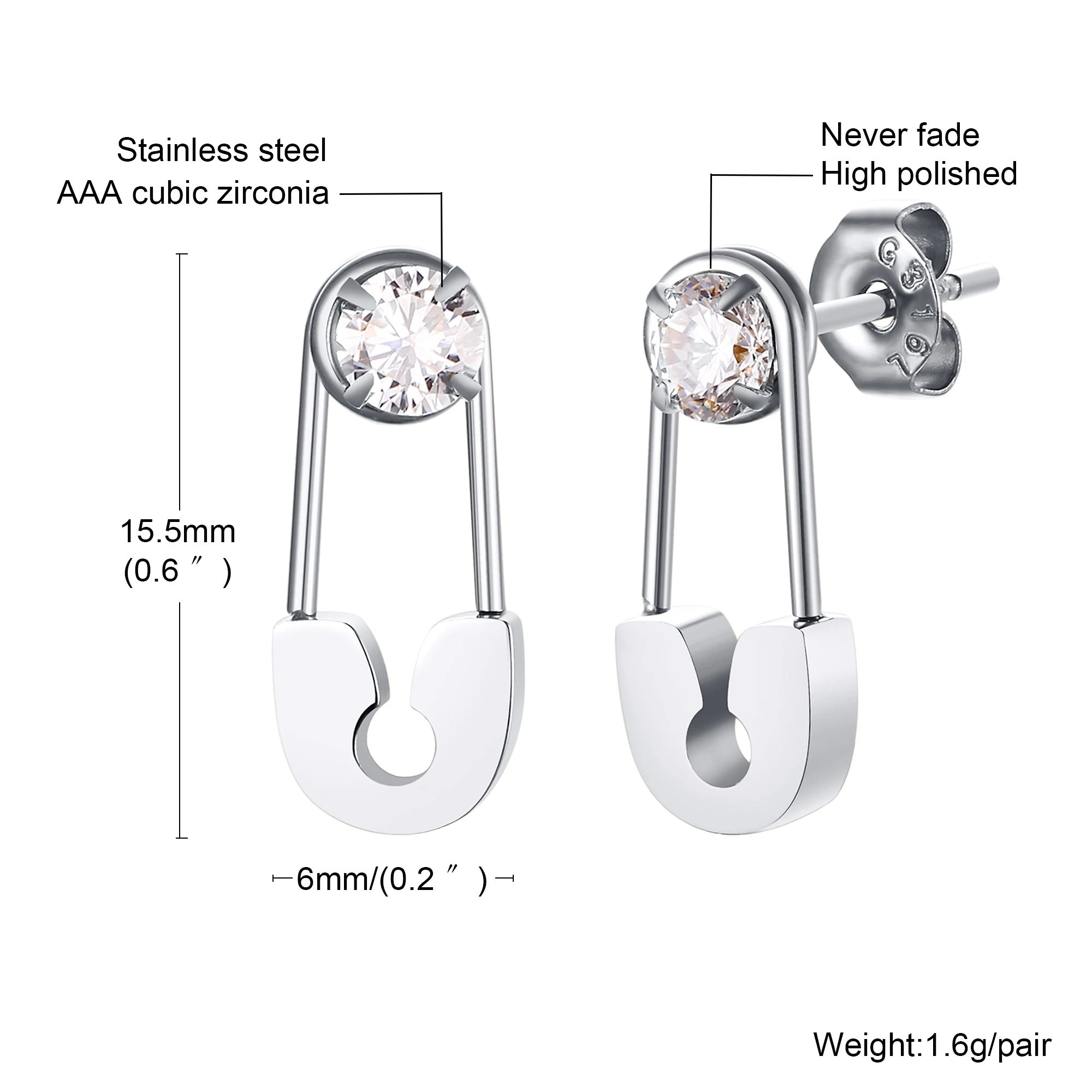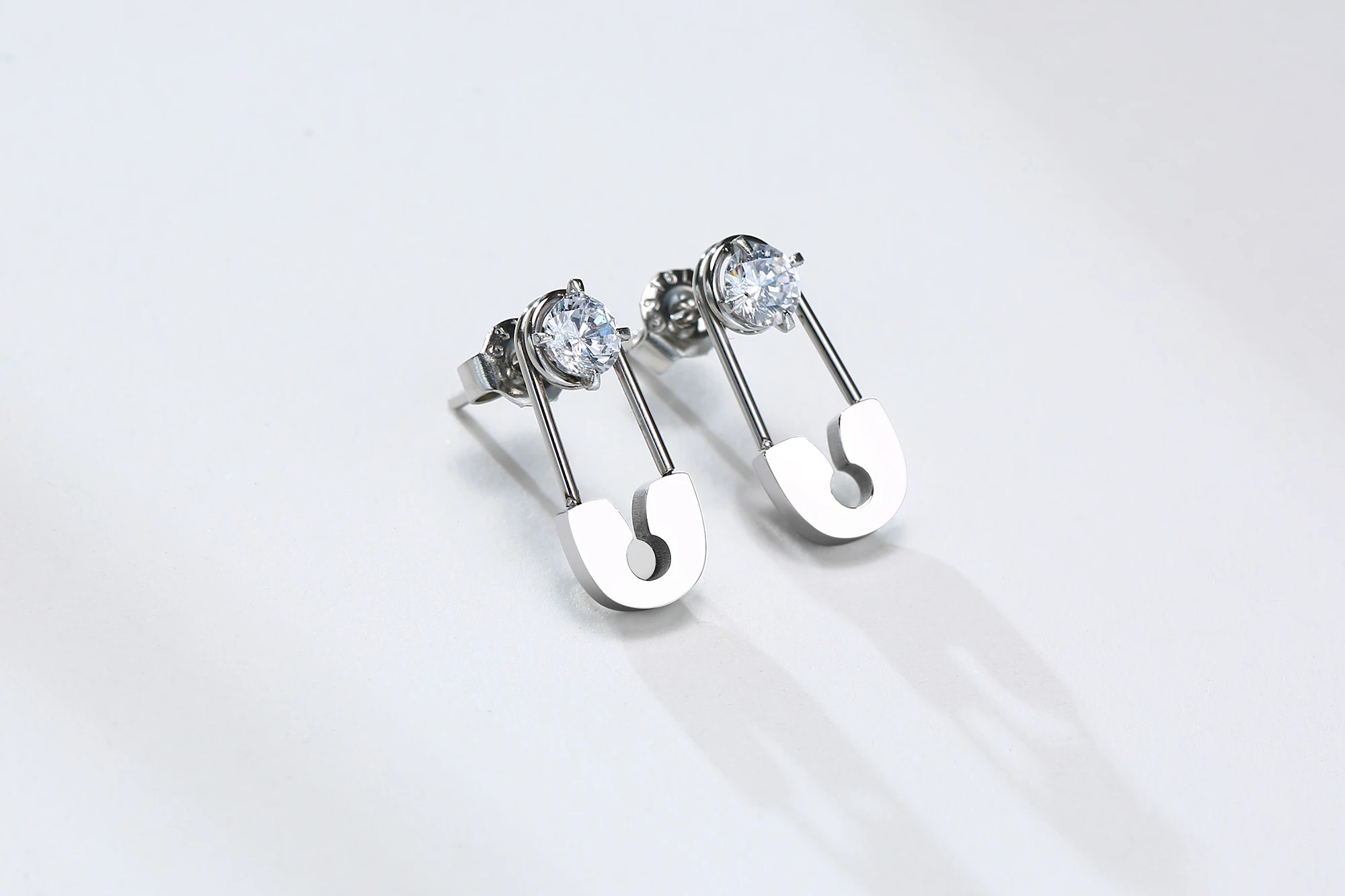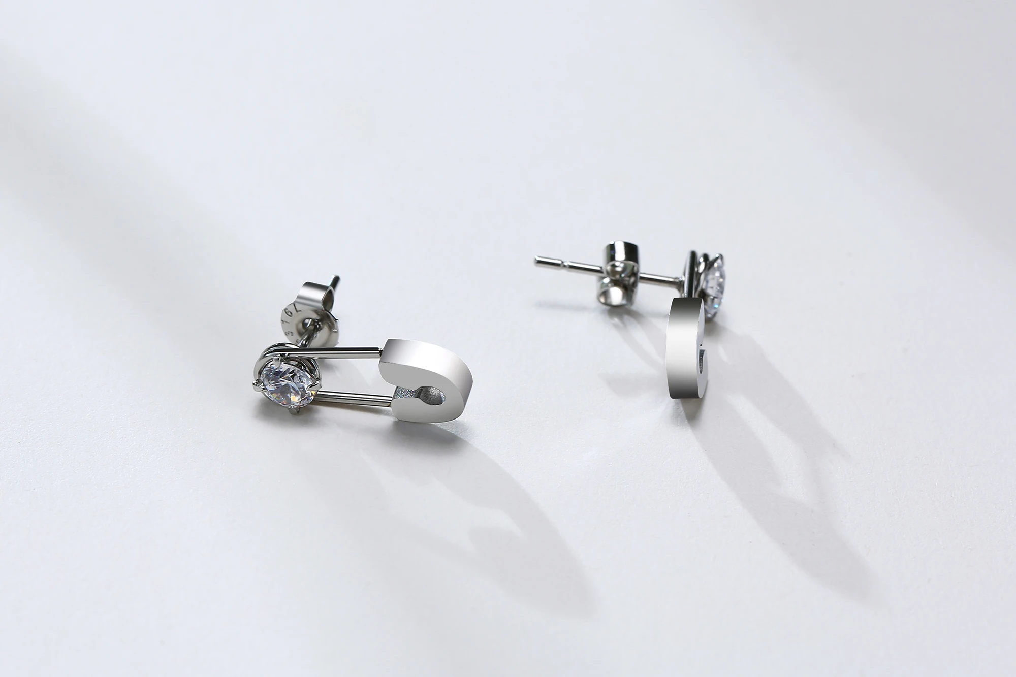 Safety Pin Stainless Steel Cubic Zirconia Stud Earrings