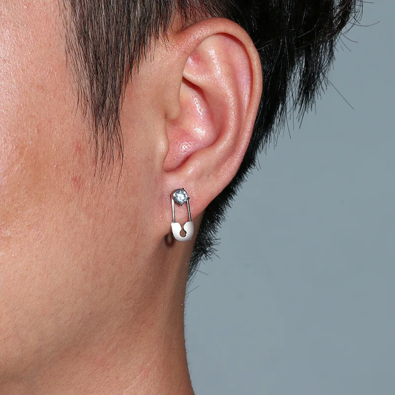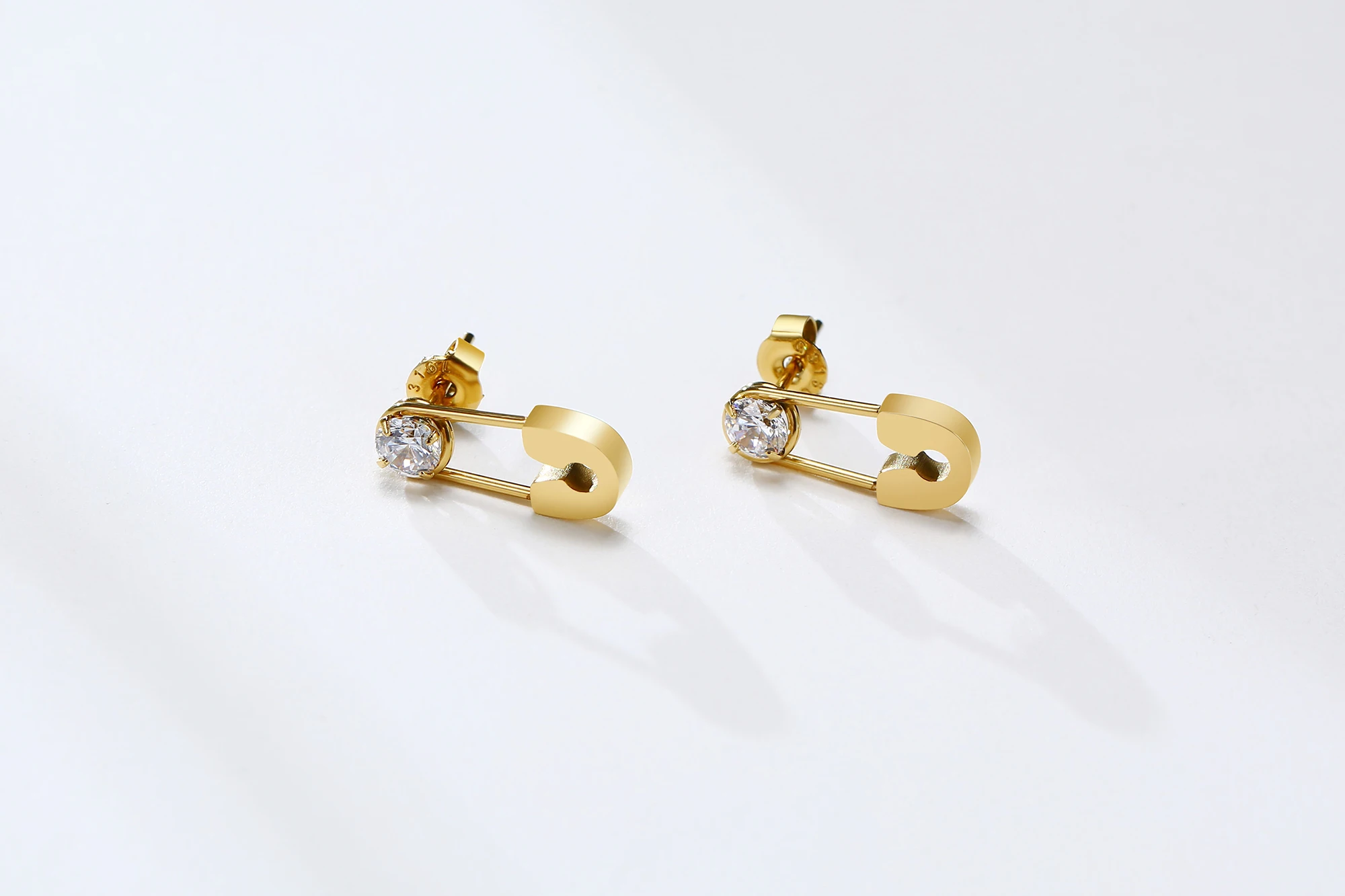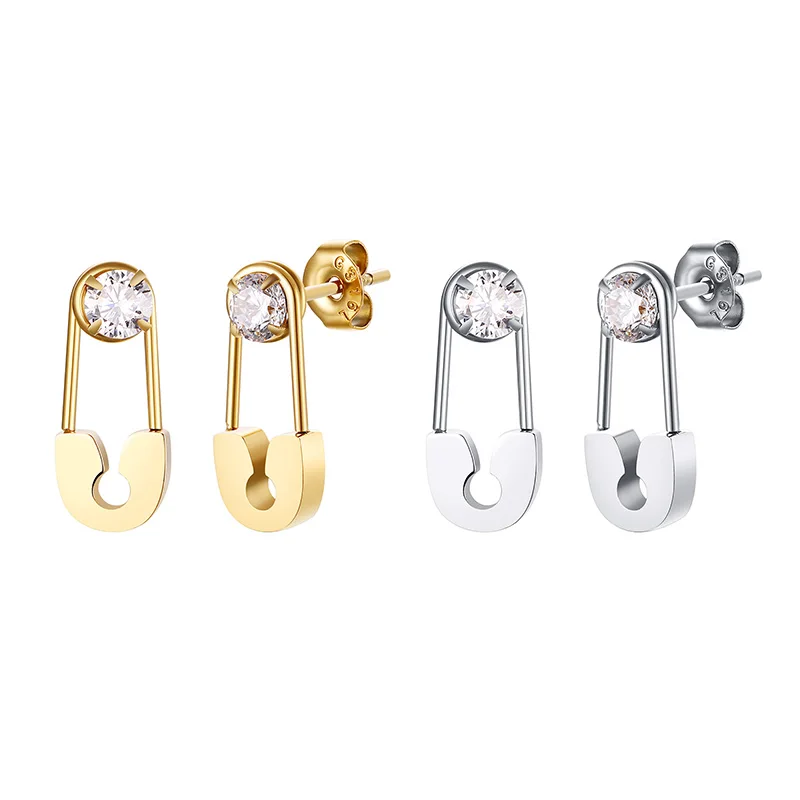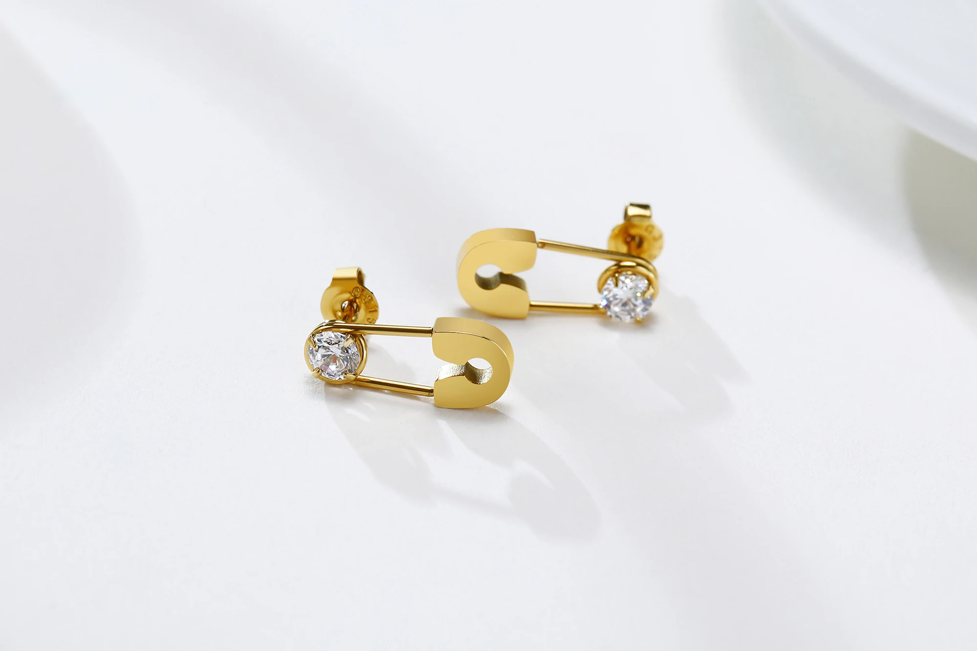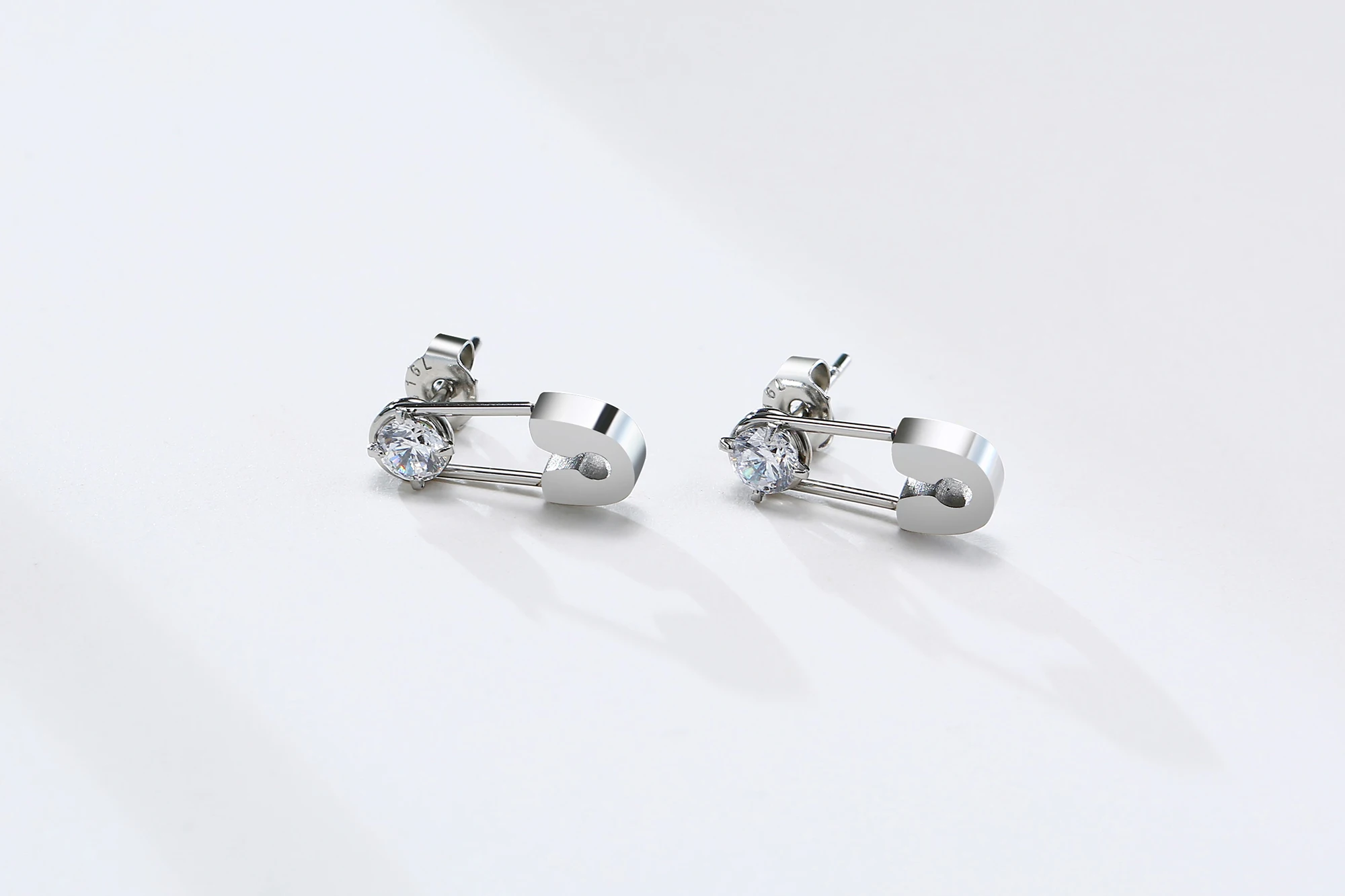 Details: Add a touch of edgy elegance to your look with these unique Stainless Steel Safety Pin Design Stud Earrings. Crafted from durable stainless steel with a chic gold-tone or a sleek silver-tone finish, these earrings feature a playful safety pin shape that dangles gracefully from the earlobe. Each earring is adorned with a sparkling cubic zirconia gemstone at the top, mimicking the brilliance of a diamond and providing an eye-catching sparkle. Perfect for those who love to make a bold fashion statement, these earrings combine modern design with a hint of glamour, making them a standout addition to any jewelry collection.