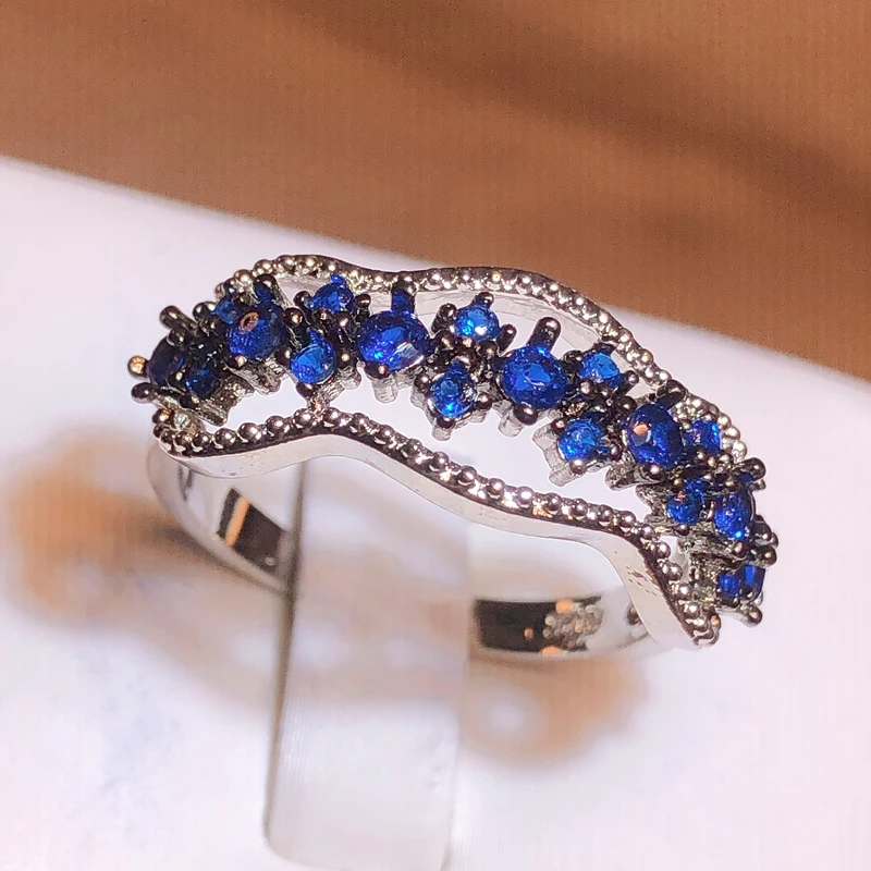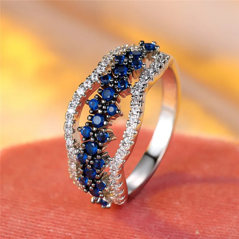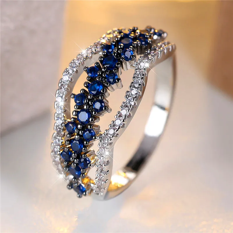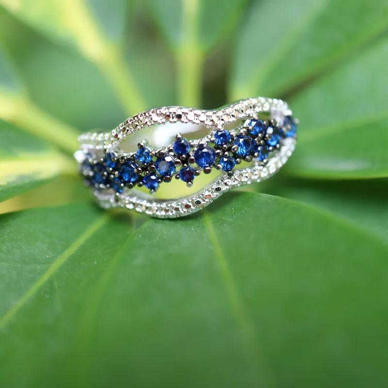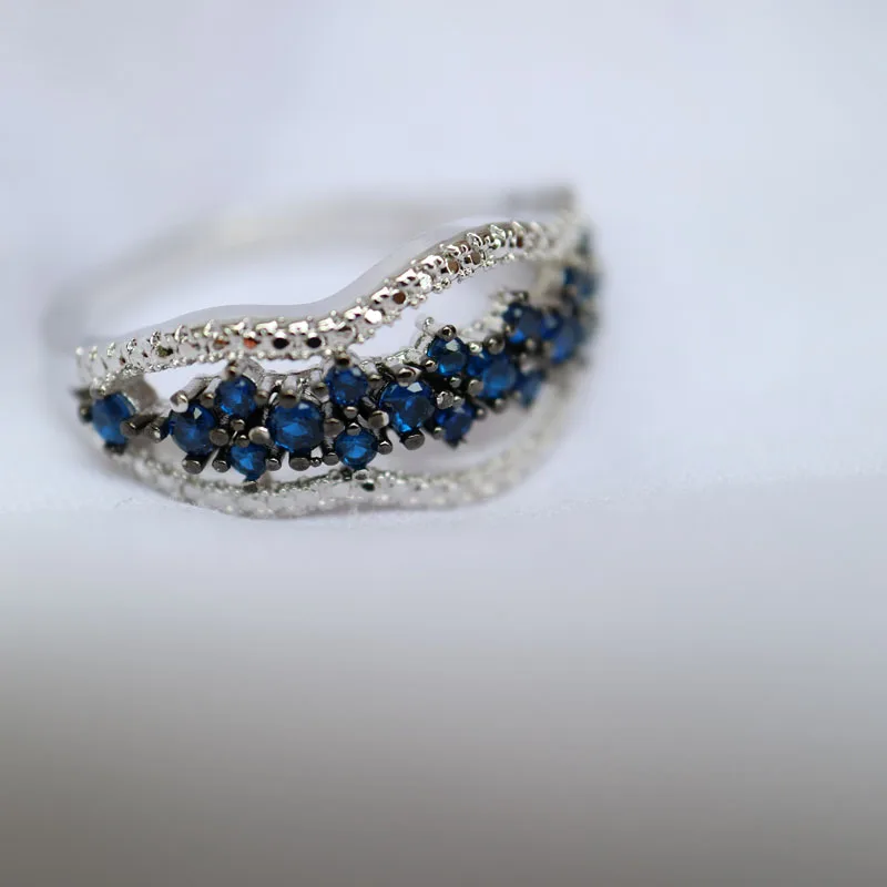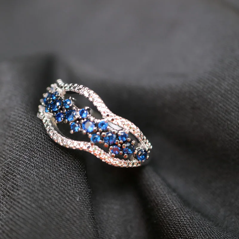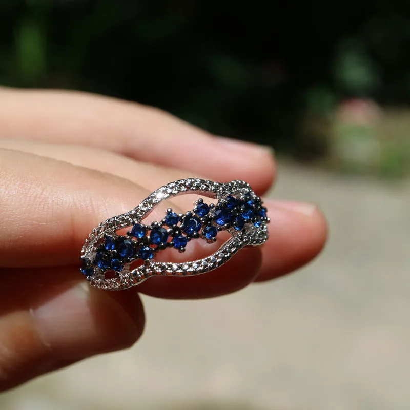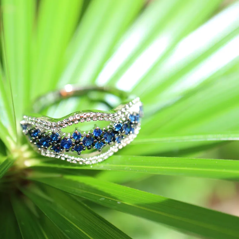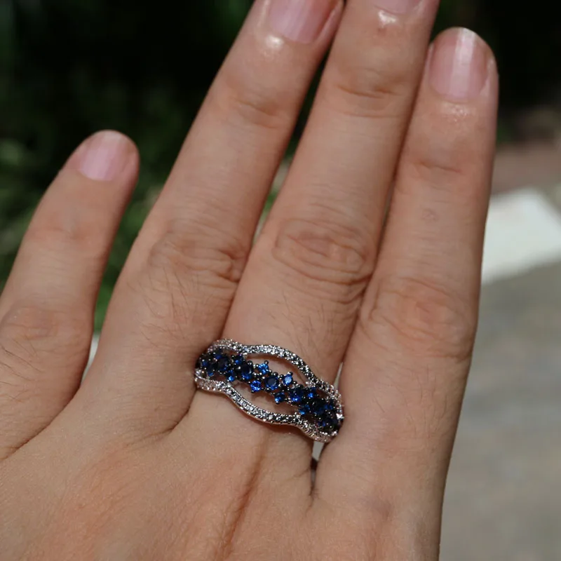 Details: Indulge in the allure of deep blue with this “Sapphire Elegance” ring. This exquisite cocktail ring features a double band design, meticulously crafted from 925 sterling silver. The sapphire-colored gemstones spliced in dual bands of clear cubic zirconia gemstones creating a trilateral beauty with a mesmerizing play of light and color. The silver setting further enhances the vibrancy of the sapphires. It’s a timeless choice for elegant evenings or adding flair to your everyday style. Choose elegance, choose “Sapphire Elegance.”
