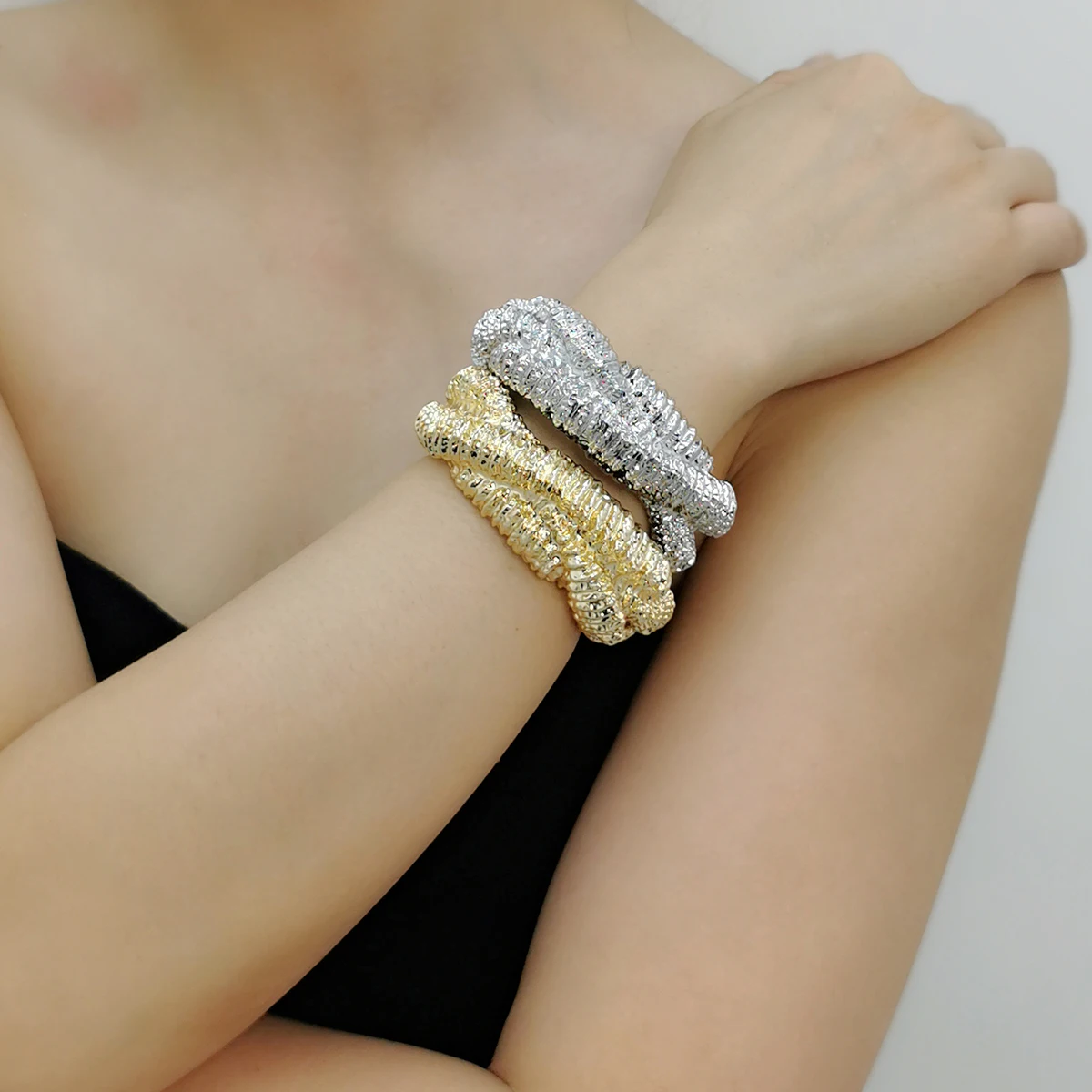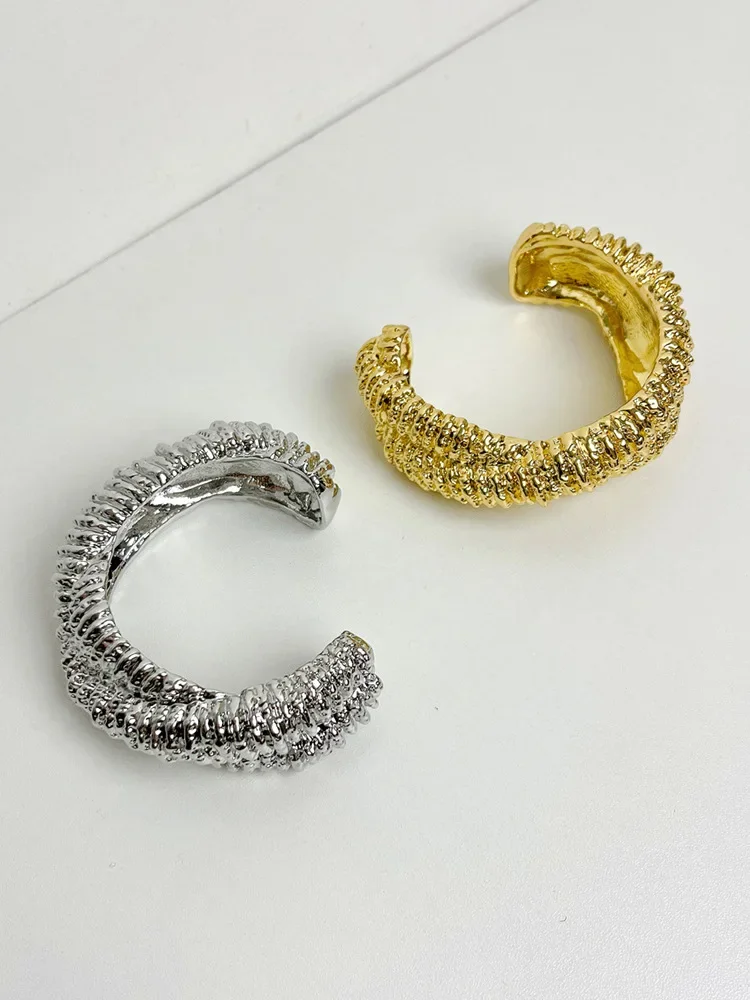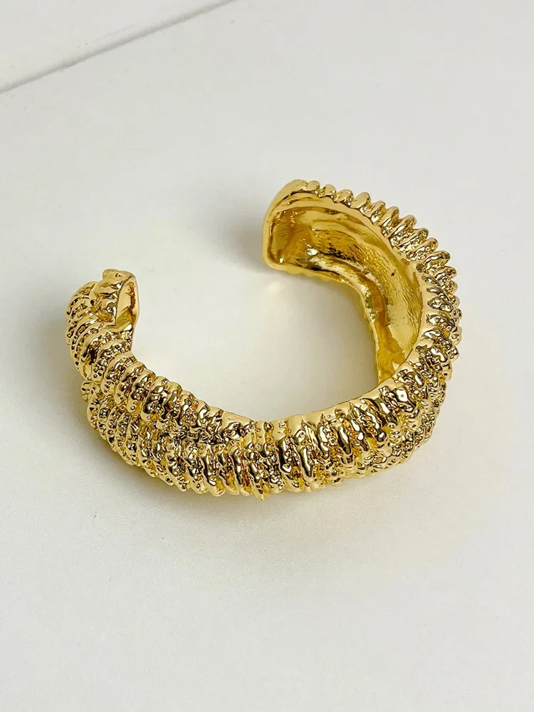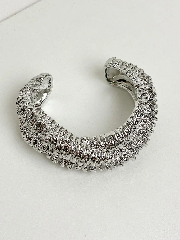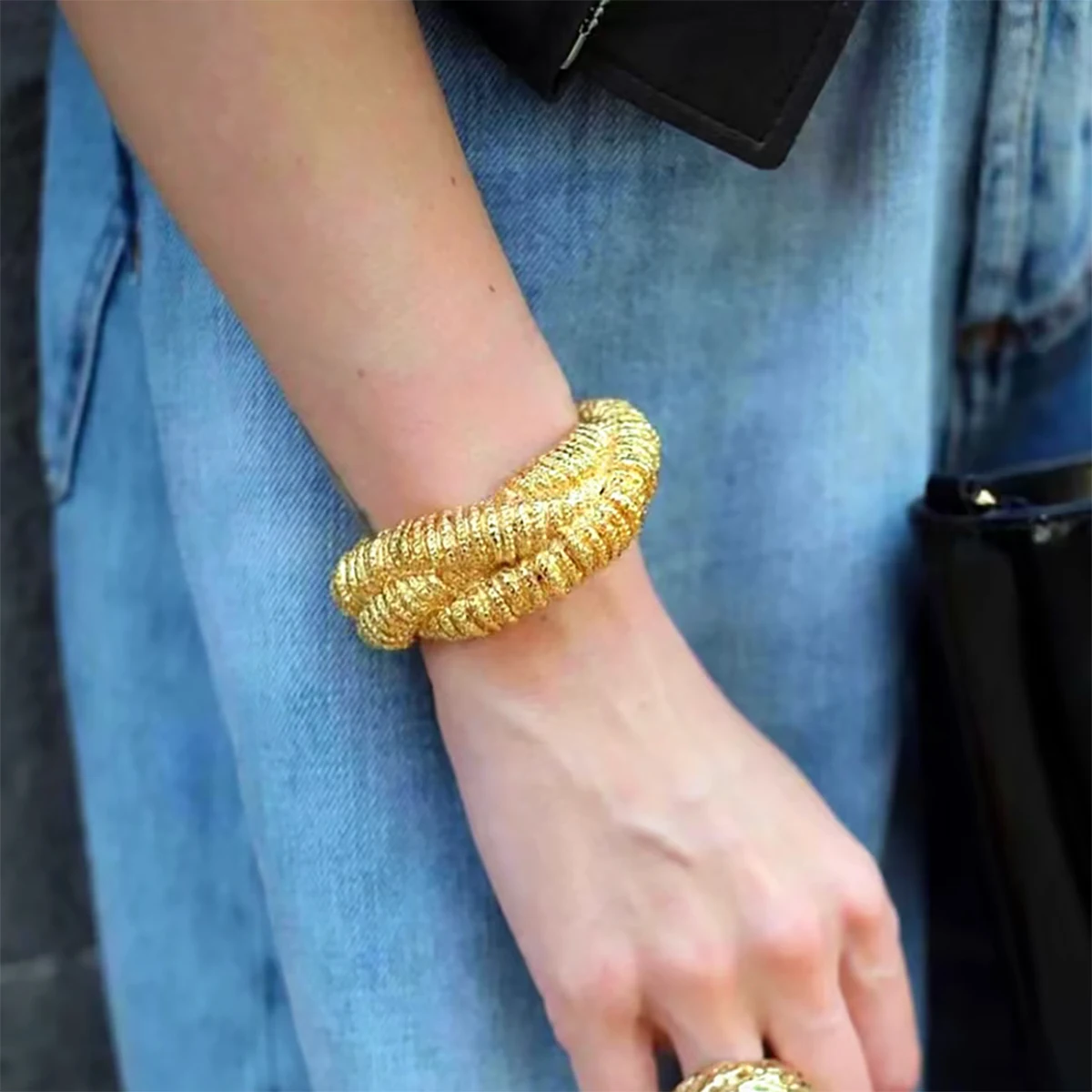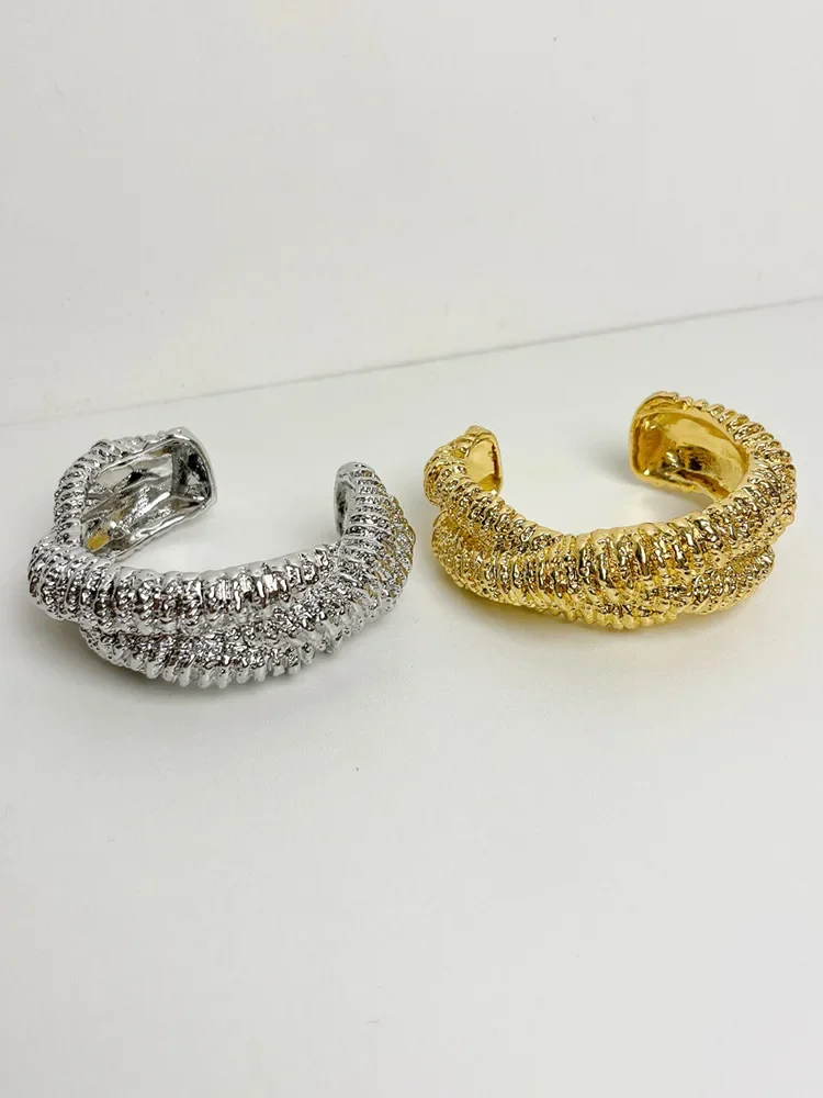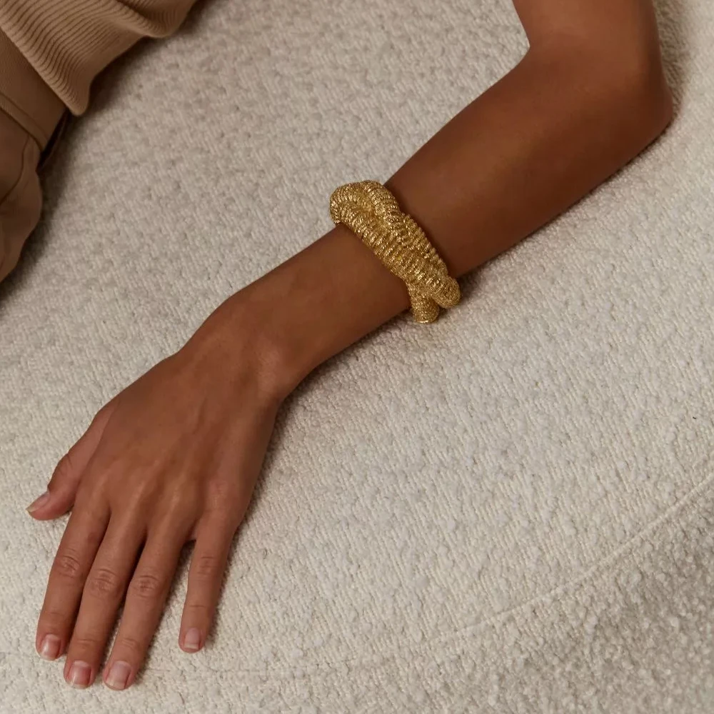 Details: Sculptural. Sensual. Unapologetically bold. This open bracelet reimagines the classic bangle with a scrunchie-inspired silhouette – fluid coils that ripple with texture and shine. Crafted in high-polish gold or silver, each curve catches the light like liquid metal, wrapping the wrist in a statement of effortless glamour. Its open design offers a comfortable fit with a modern edge, perfect for stacking or letting it shine solo. Whether you’re dressing up a sleek black dress or adding drama to a casual look, this piece delivers instant impact.