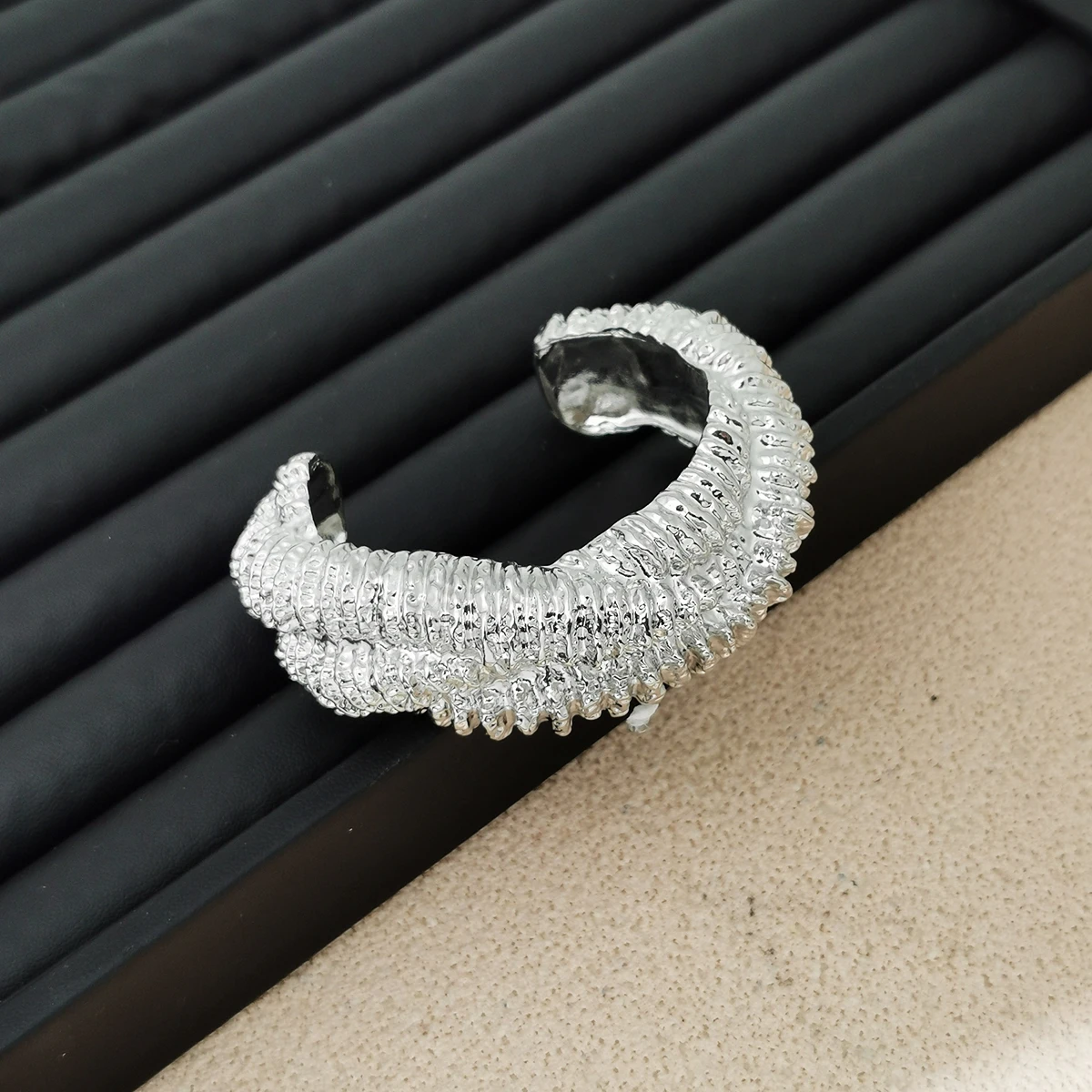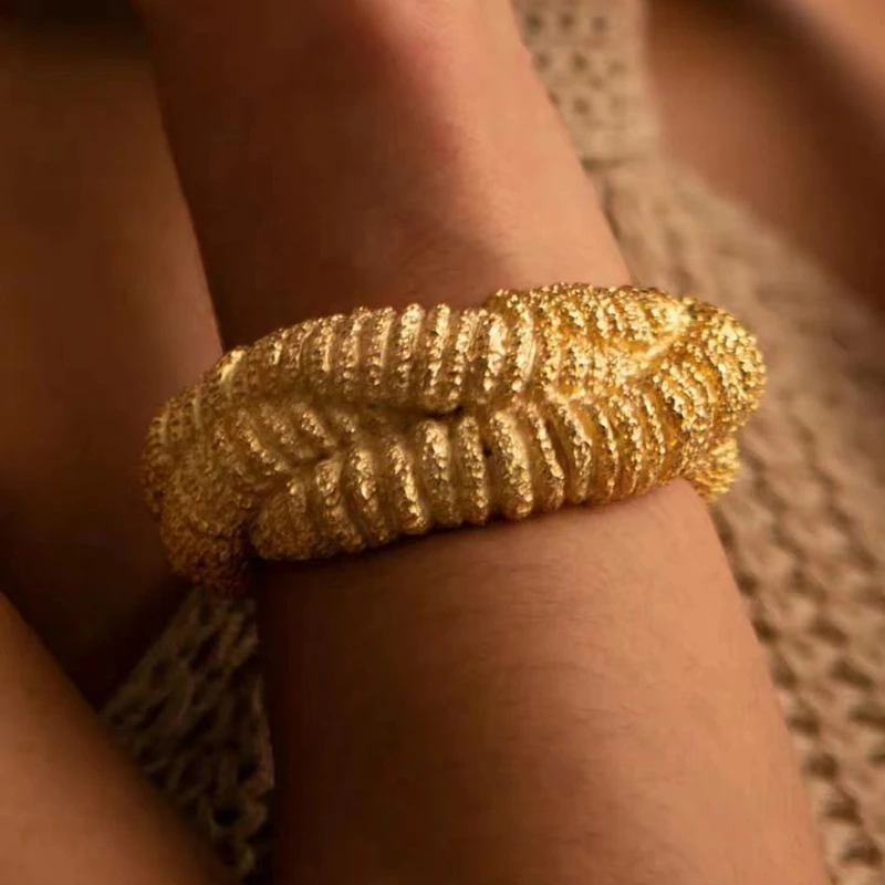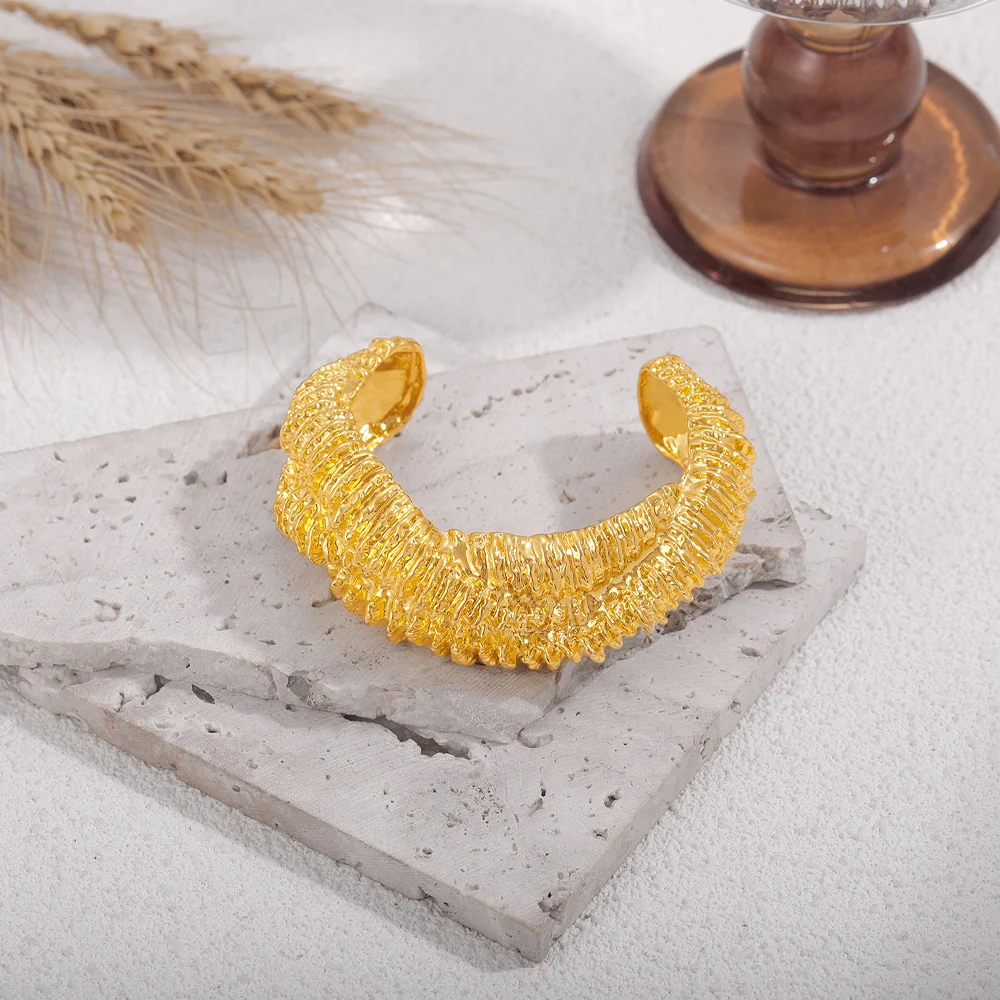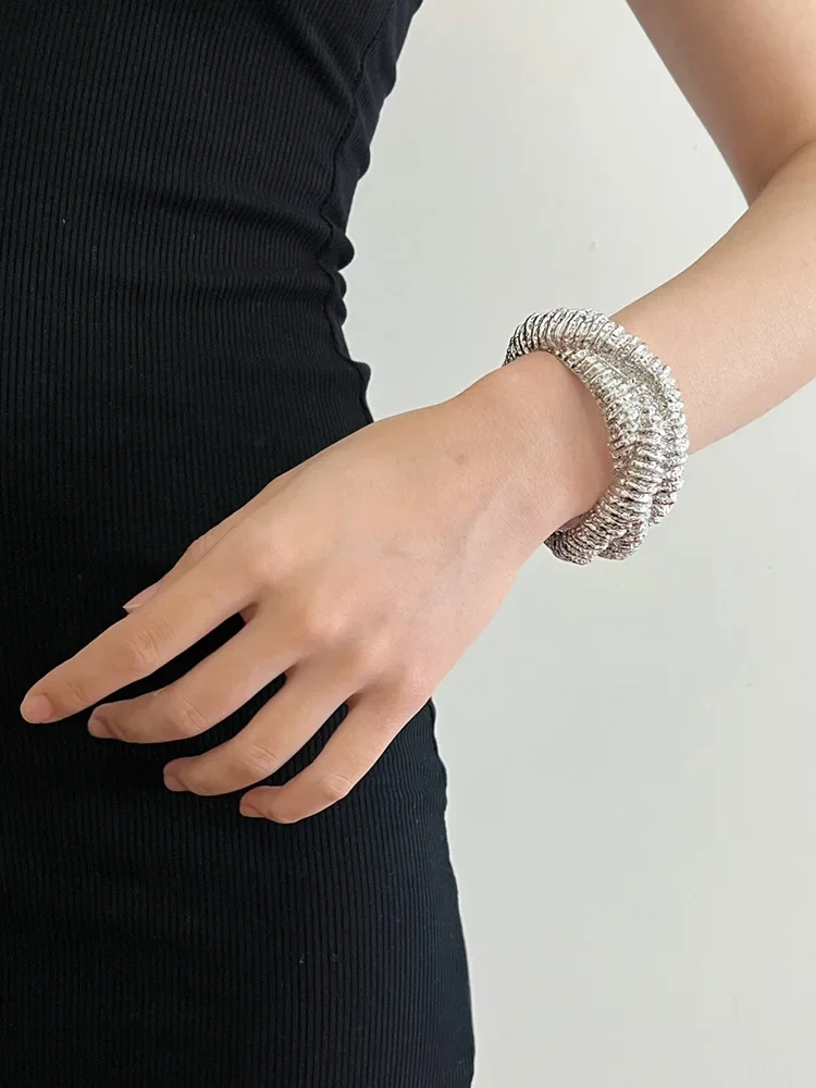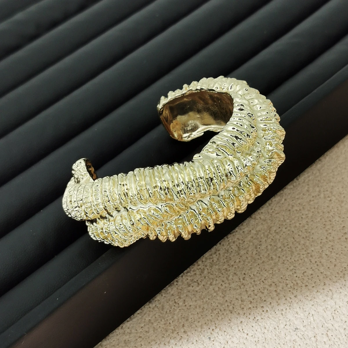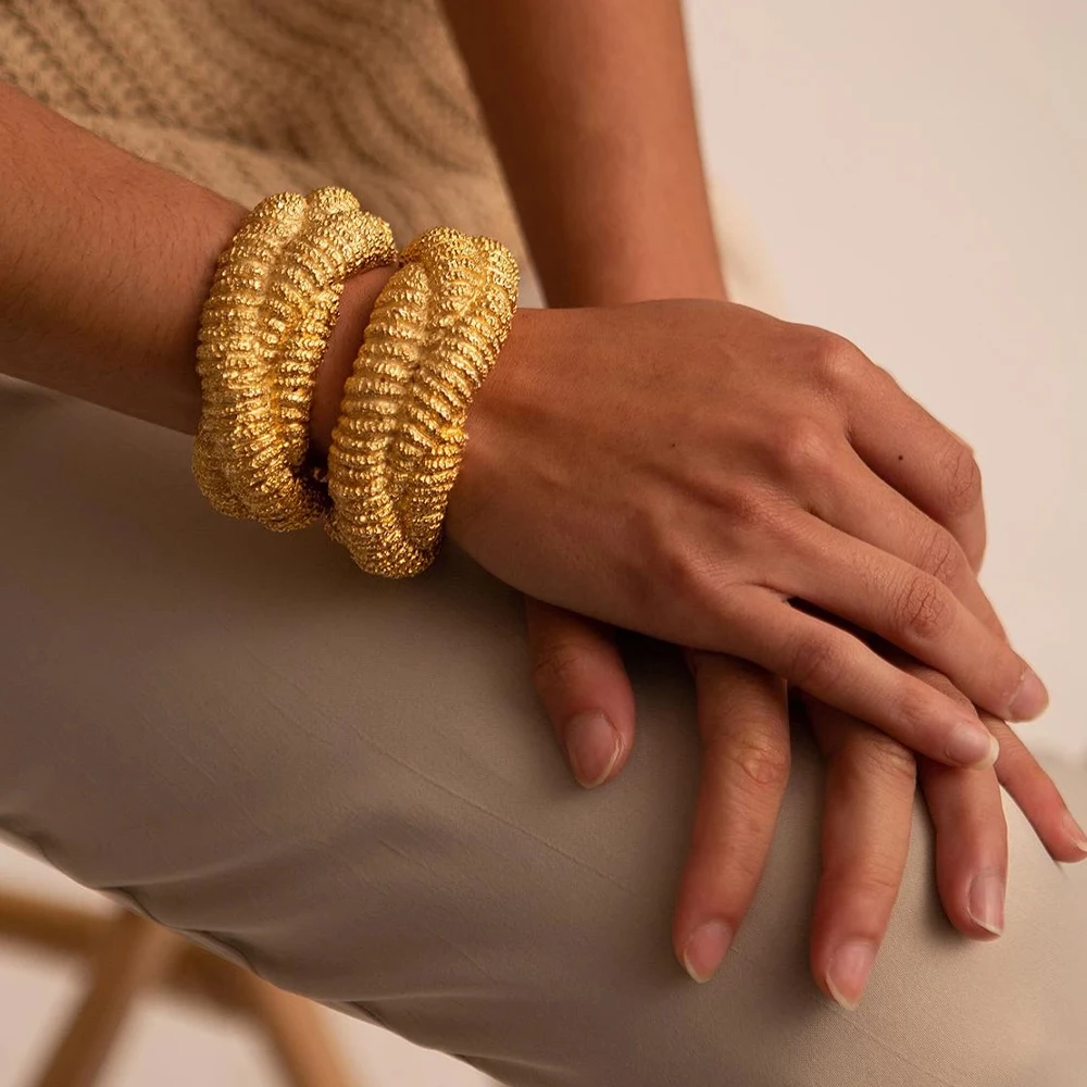 Details: Sculptural. Sensual. Unapologetically bold. This open bracelet reimagines the classic bangle with a scrunchie-inspired silhouette – fluid coils that ripple with texture and shine. Crafted in high-polish gold or silver, each curve catches the light like liquid metal, wrapping the wrist in a statement of effortless glamour. Its open design offers a comfortable fit with a modern edge, perfect for stacking or letting it shine solo. Whether you’re dressing up a sleek black dress or adding drama to a casual look, this piece delivers instant impact.