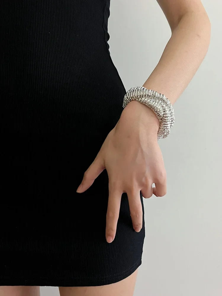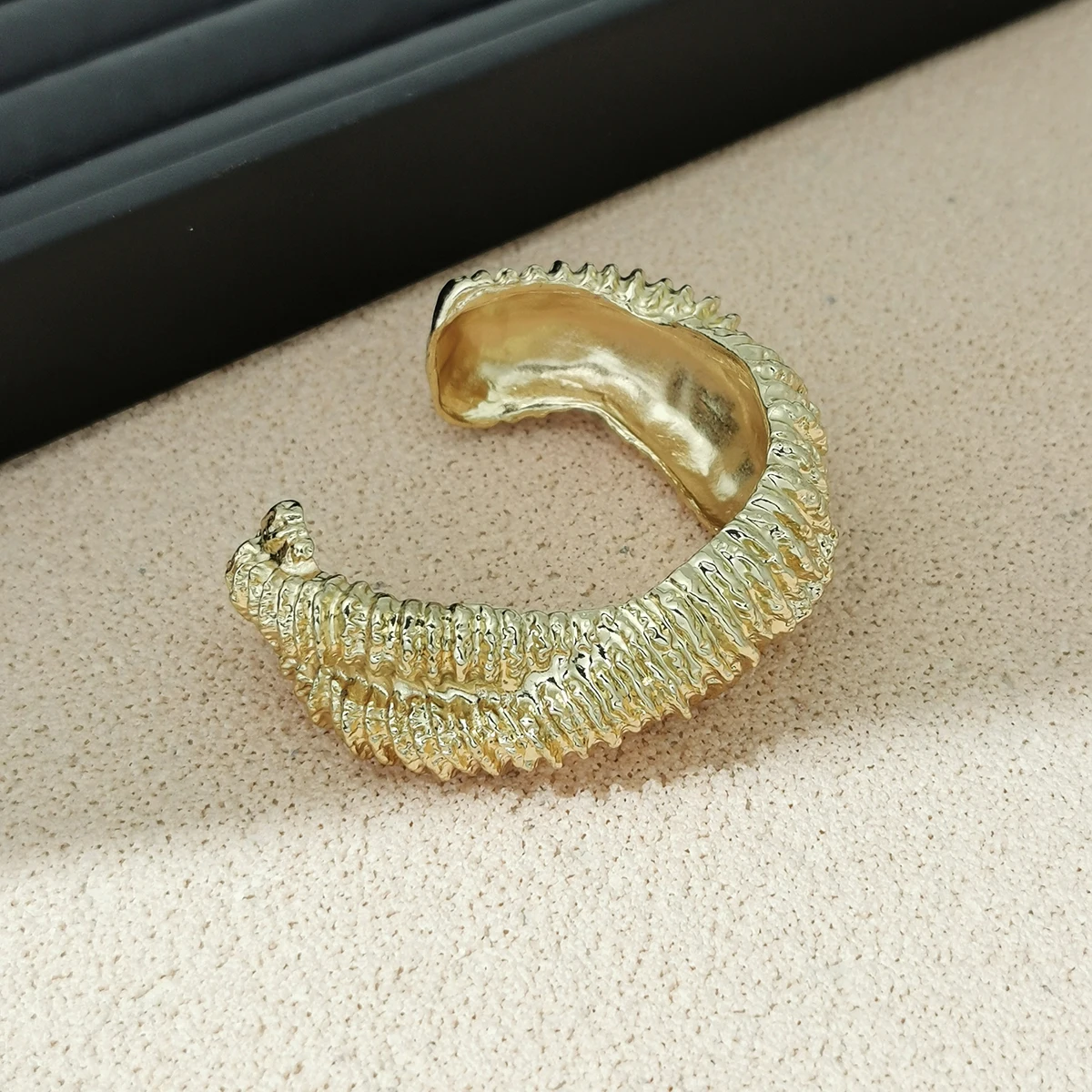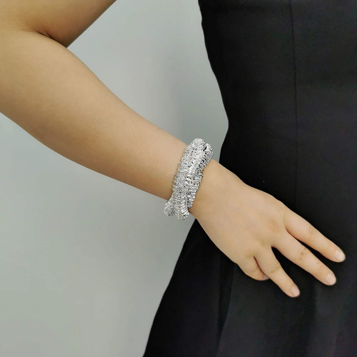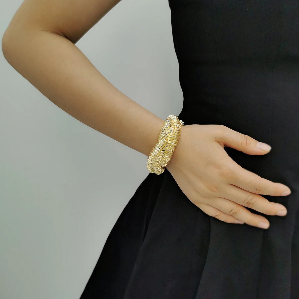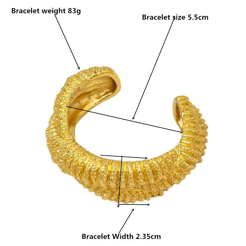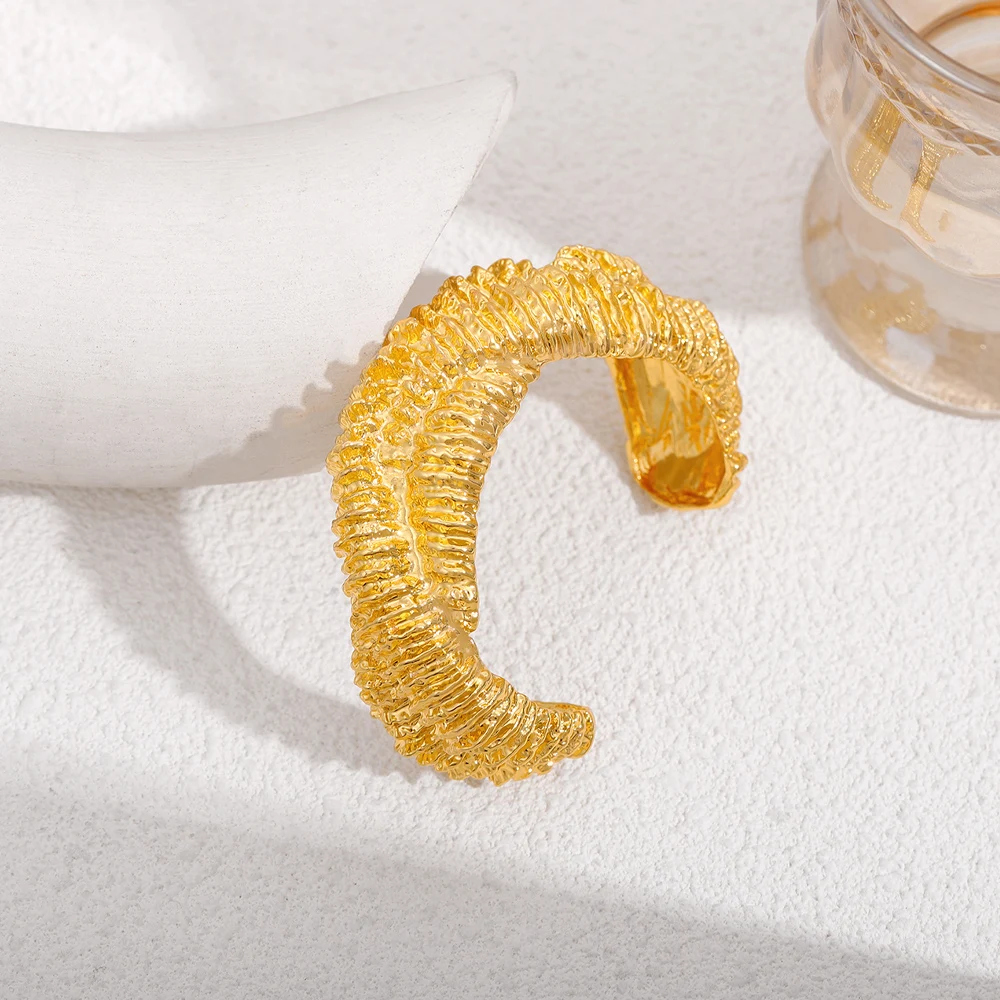 Details: Sculptural. Sensual. Unapologetically bold. This open bracelet reimagines the classic bangle with a scrunchie-inspired silhouette – fluid coils that ripple with texture and shine. Crafted in high-polish gold or silver, each curve catches the light like liquid metal, wrapping the wrist in a statement of effortless glamour. Its open design offers a comfortable fit with a modern edge, perfect for stacking or letting it shine solo. Whether you’re dressing up a sleek black dress or adding drama to a casual look, this piece delivers instant impact.