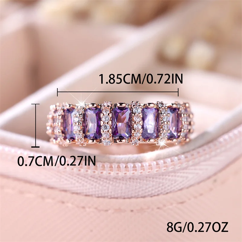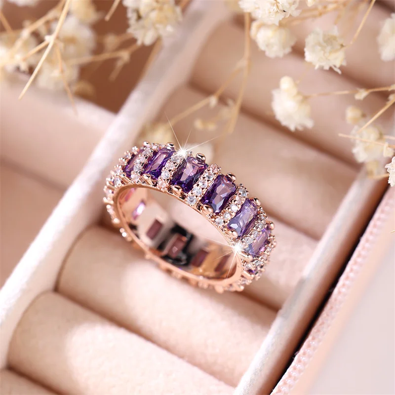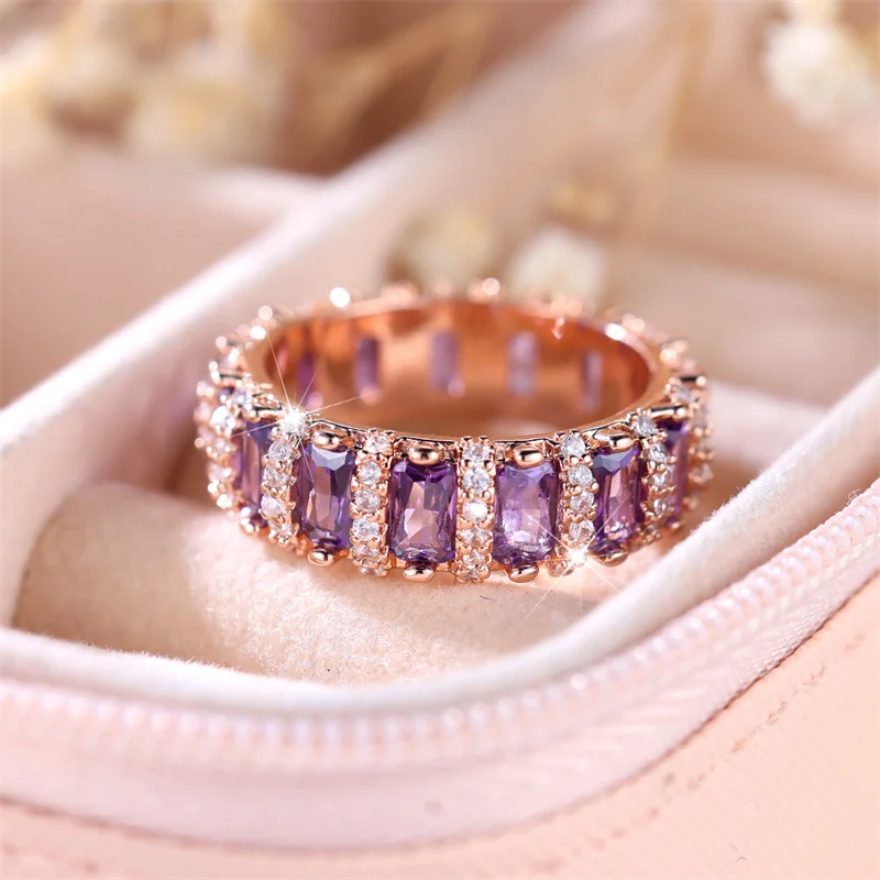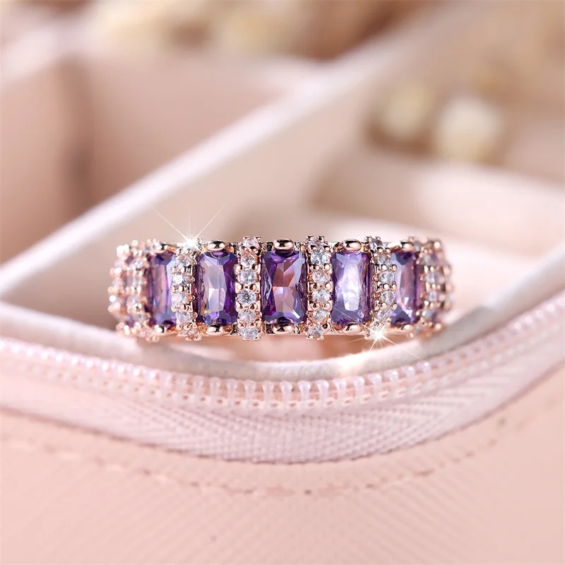 Details: Embrace timeless beauty with this Soft Purple and White Cubic Zirconia Rose Gold Engagement Ring. This exquisite piece features a stunning combination of rectangular-cut soft purple cubic zirconia gemstones, separated by vertical rows of shimmering white cubic zirconia accents. The luxurious rose gold band enhances the vibrancy of the stones, creating a captivating and sophisticated look. Perfect for symbolizing love and commitment, this ring is an ideal choice for those seeking a unique and eye-catching engagement ring.