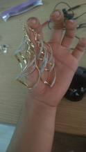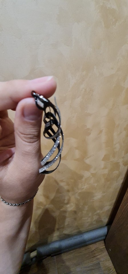Красивые серьги, довольно большие, но не тяжелые, как на картинке. Ничего не сломалось или не погнулось, хотя на них нет спины. Металл довольно жесткий и не хлипкий или бенди. Блестящая часть приклеивается, и некоторые части немного не заметны