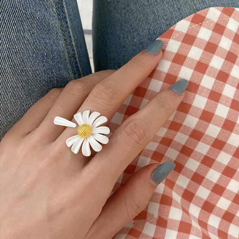 Blooming Daisy Ring: An adjustable open ring featuring a daisy with a detached petal. The white petals and gold accents make this ring a versatile accessory, perfect for adding a whimsical touch to your look.