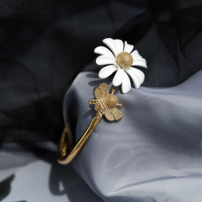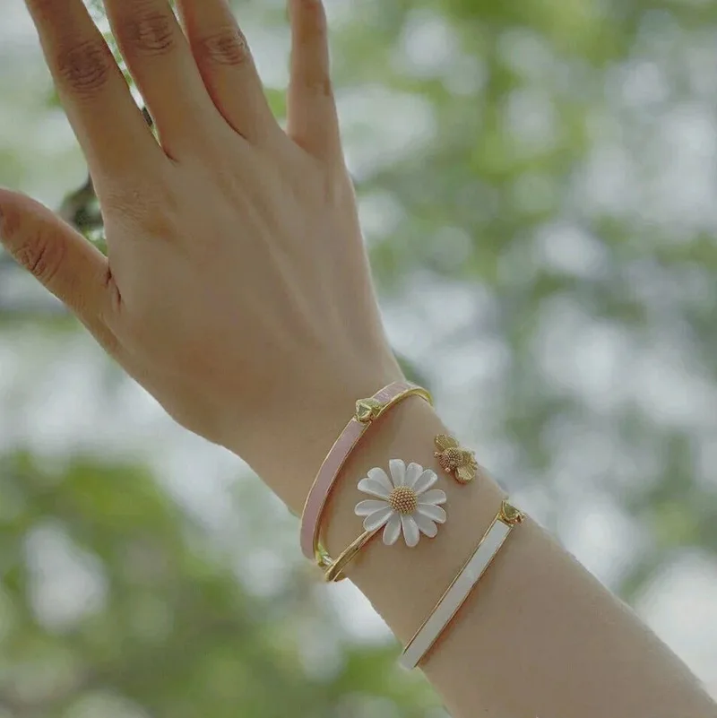 Daisy Delight Bangle: This sleek, open-design bangle showcases a daisy and a bee, connected by a thin gold band. The large daisy at one end and the smaller bee at the other symbolize growth and renewal, making this bangle a beautiful reminder of the joys of spring.
